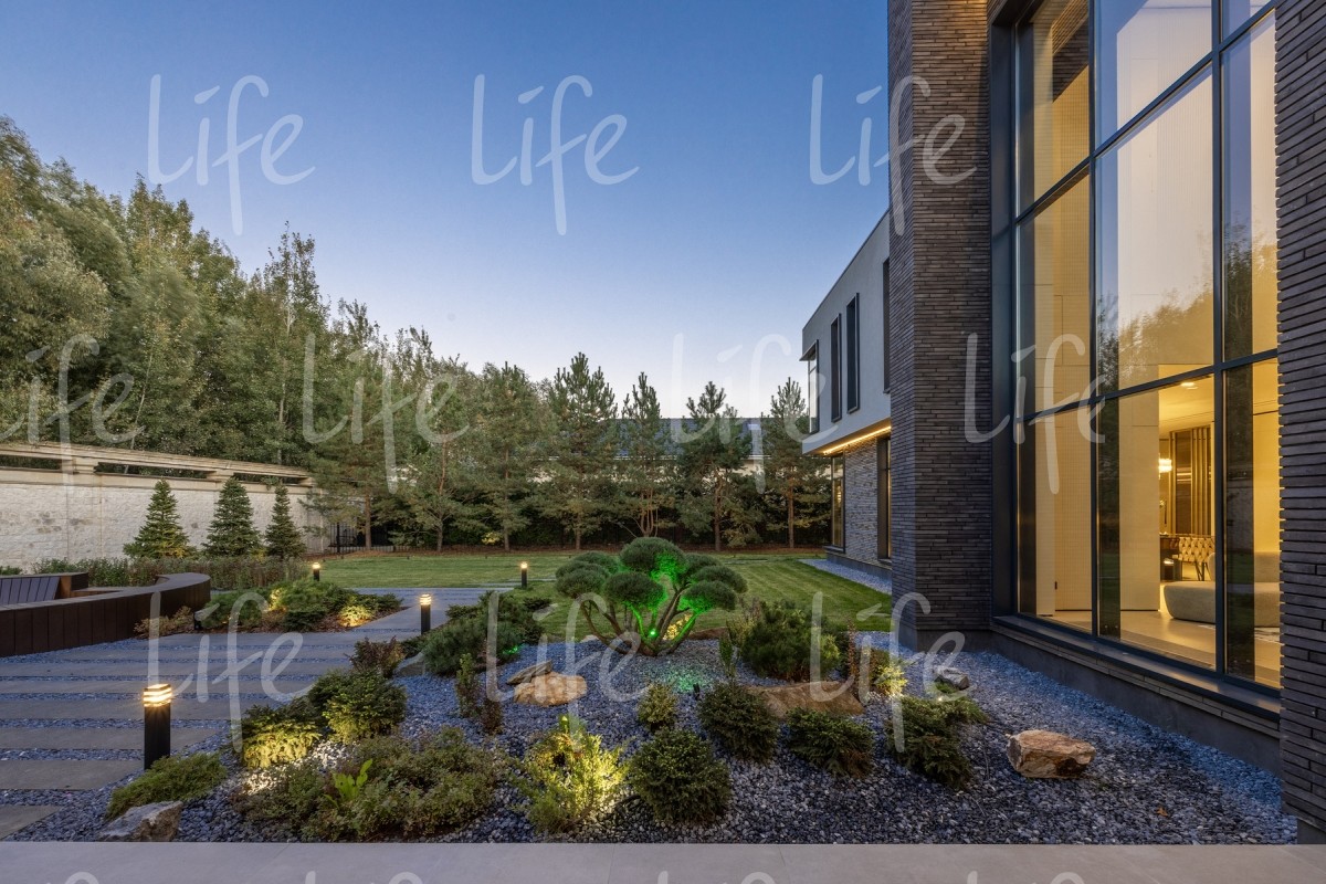 Участок правильной прямоугольной формы, выполнен ландшафтный дизайн, произрастают многолетние деревья, обустроена зона отдыха. Красивое ночное освещение.