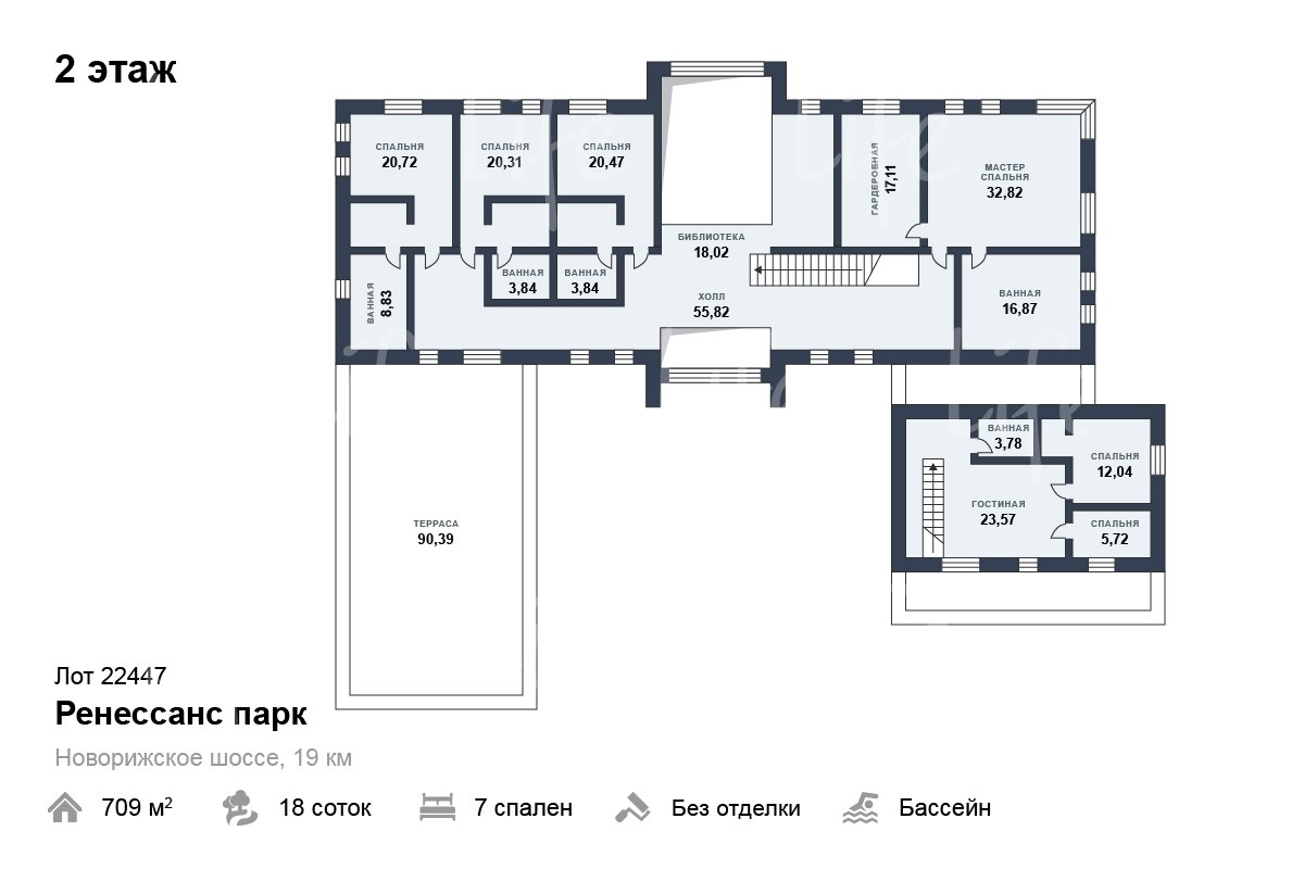 2 этаж: холл, мастер-спальня с санузлом и гардеробной, две спальни с санузлом, гардеробная, спальня с гардеробной и санузлом, терраса, блок для персонала.