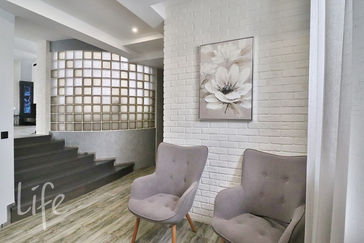 Современный интерьер в мягких тонах, с элементами лофта. Со вкусом подобрана мебель и аксессуары. Гостиная со вторым светом, с дровяным камином.