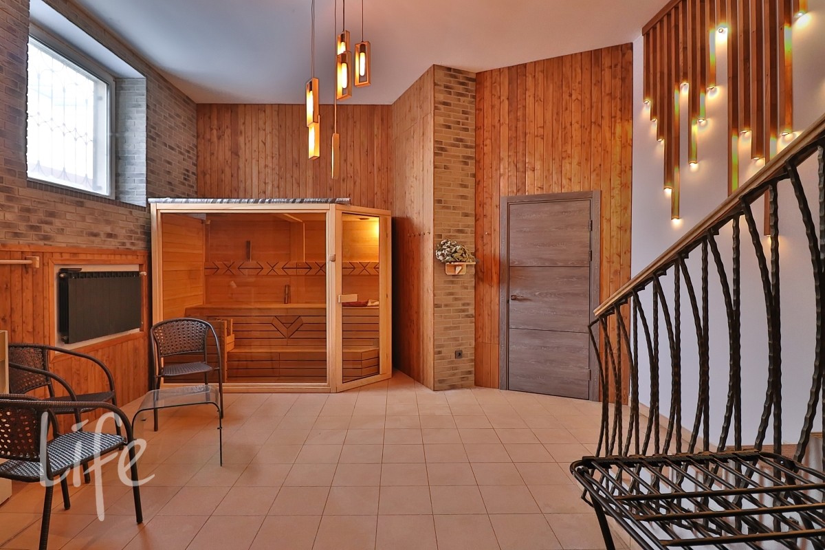Цоколь: холл, гараж, зона отдыха с сауной, котельная, постирочная, гараж на два автомобиля.