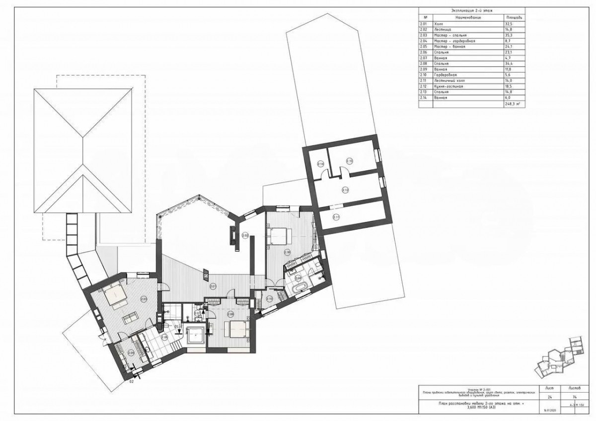 2 этаж: холл, мастер-спальня с с/у и гардеробной, спальня с с/у и гардеробной, спальня с с/у, блок для персонала со спальней, с/у и кухней, своим входом с первого этажа.