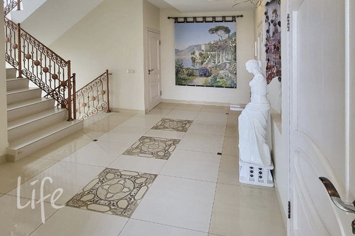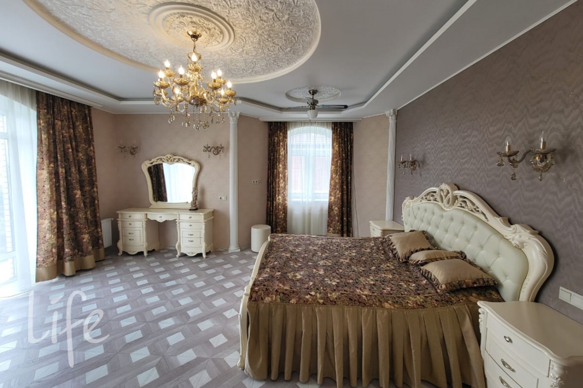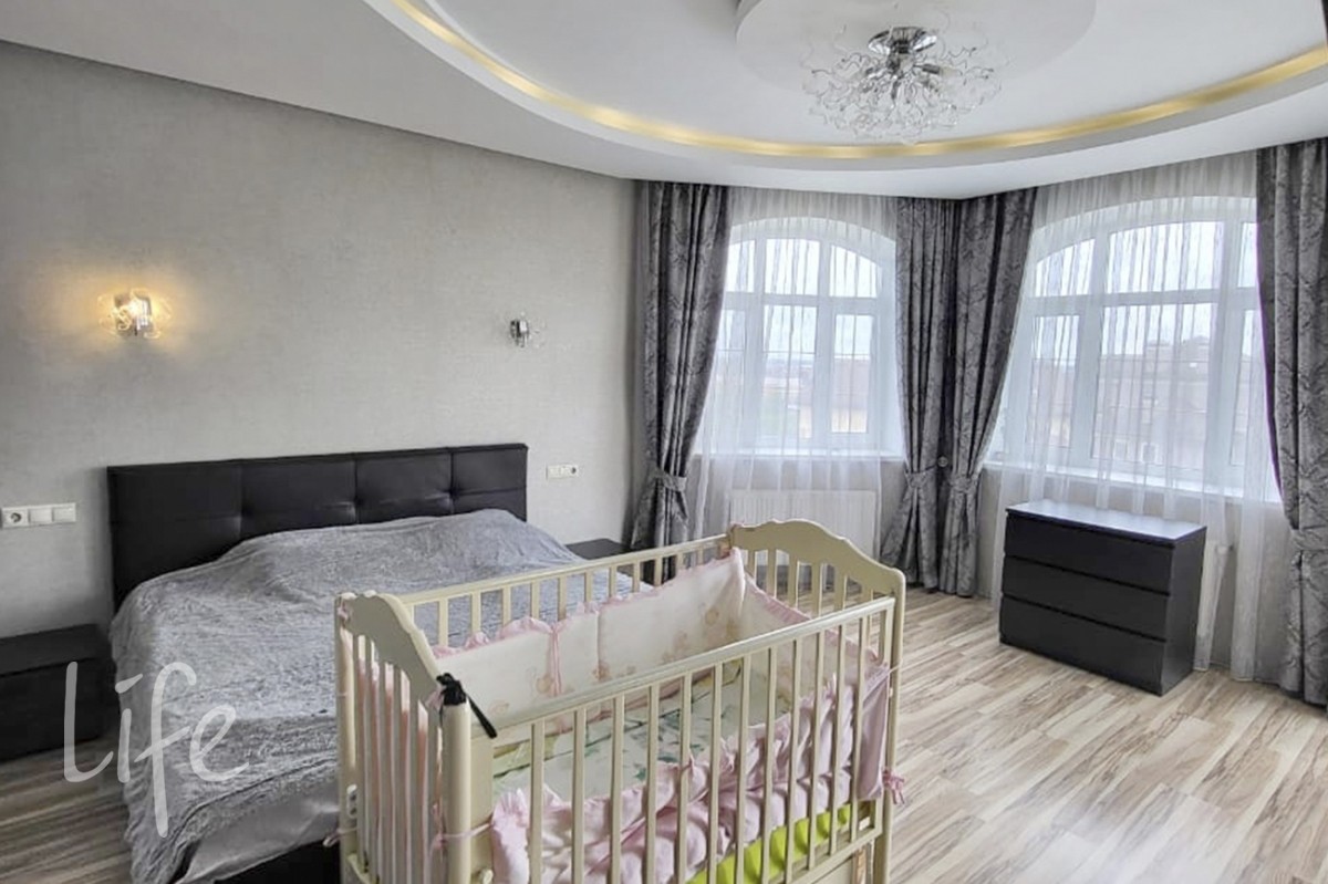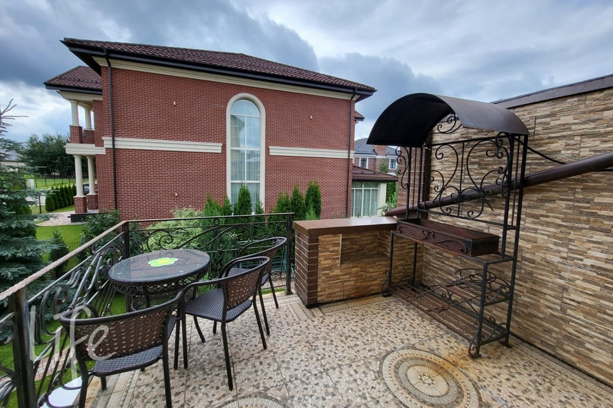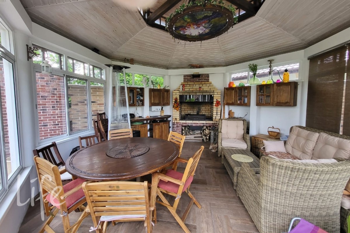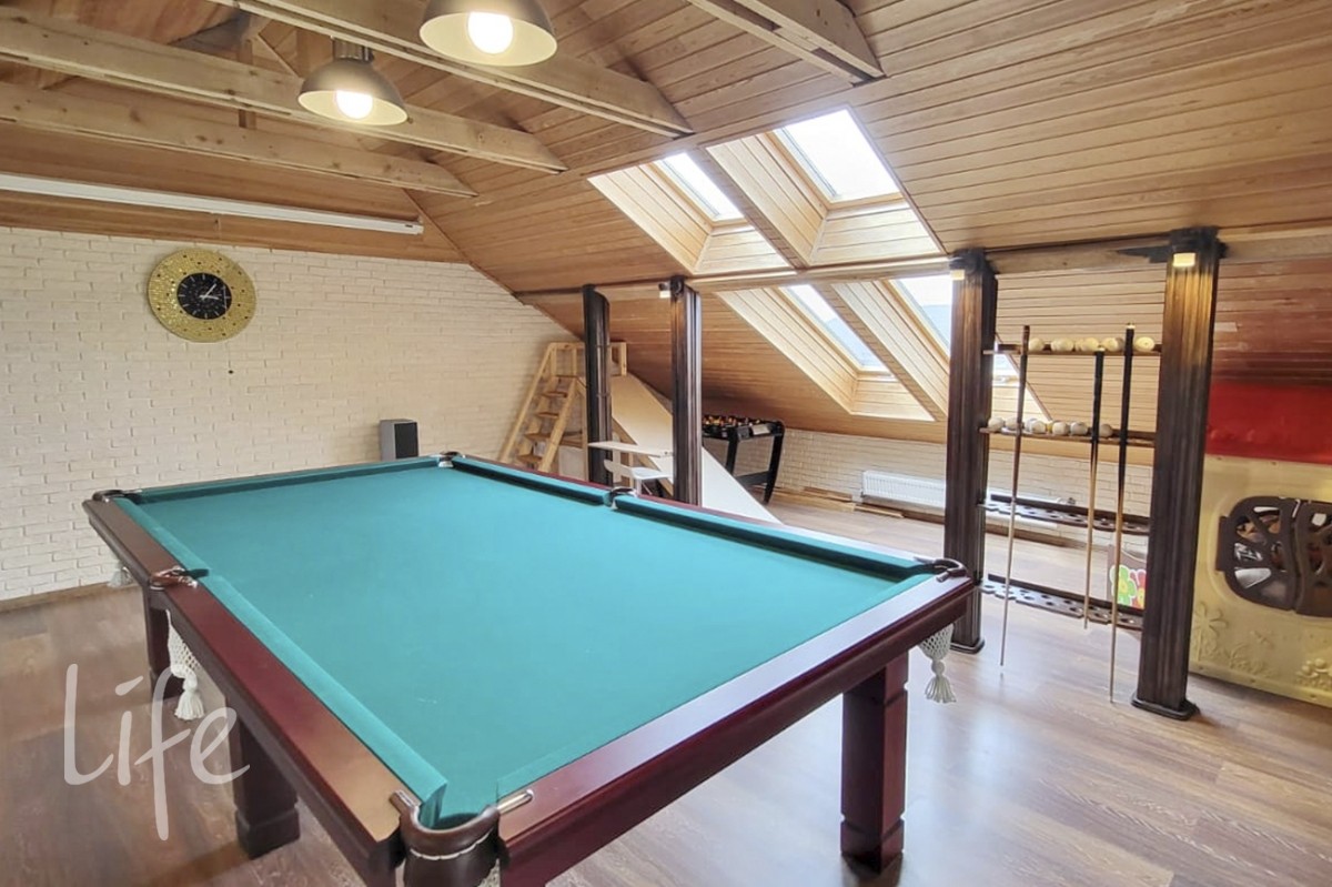 Комфортная планировка, состоящая из пяти спален, гостиной-кухни-столовой, домашним кинотеатром и бильярдной. В доме четыре санузла. Все коммуникации центральные. Теплые полы.
