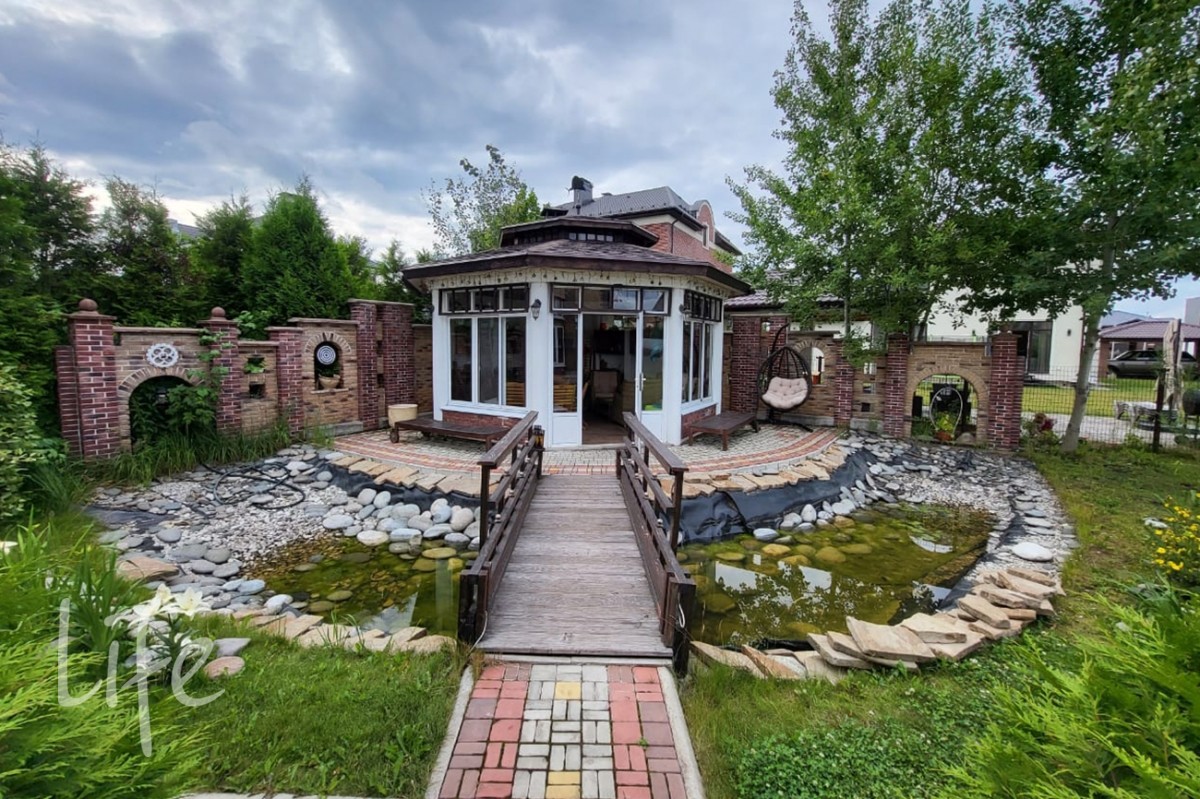 Участок правильной прямоугольной формы, с ландшафтным дизайном. Дорожки, парковка для автомобилей, небольшой прудик с мостиком через него. На территории расположена беседка-барбекю с мини-кухней.