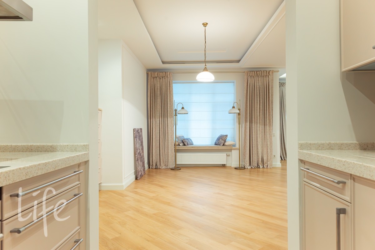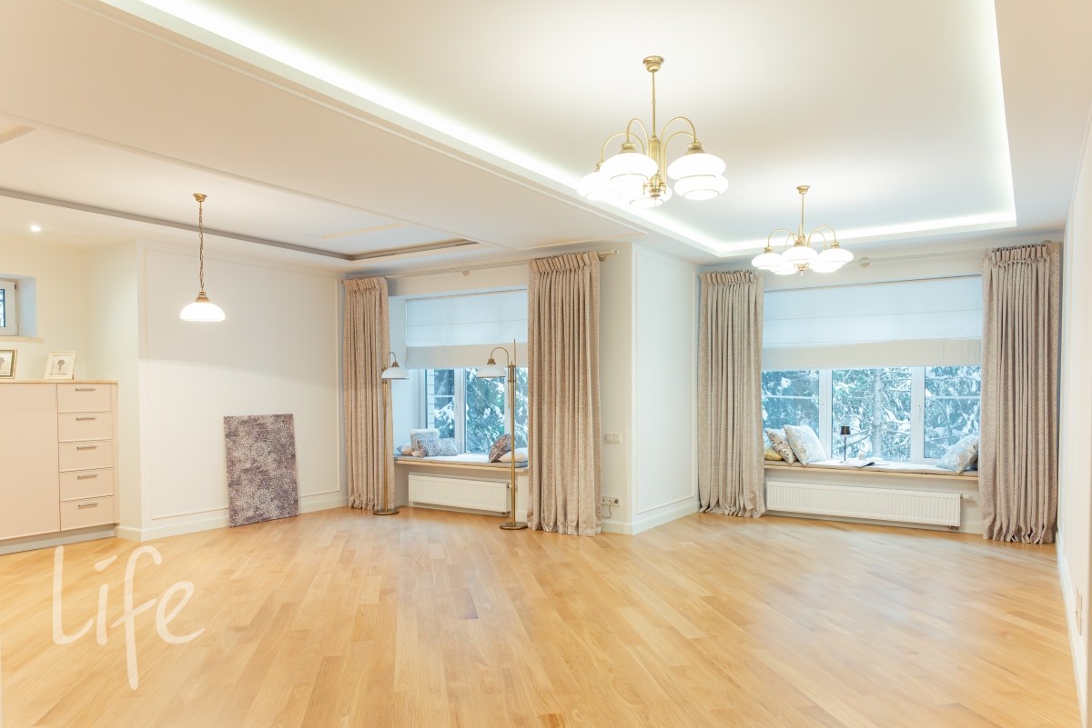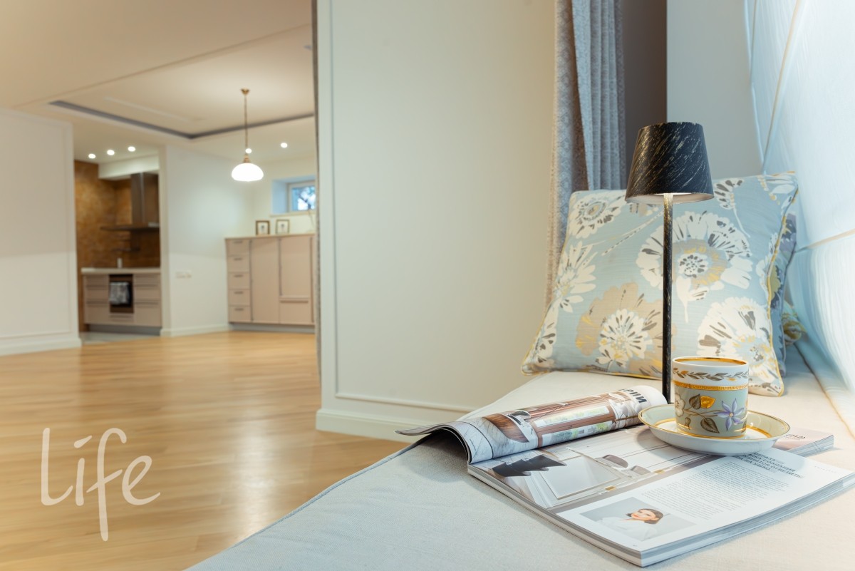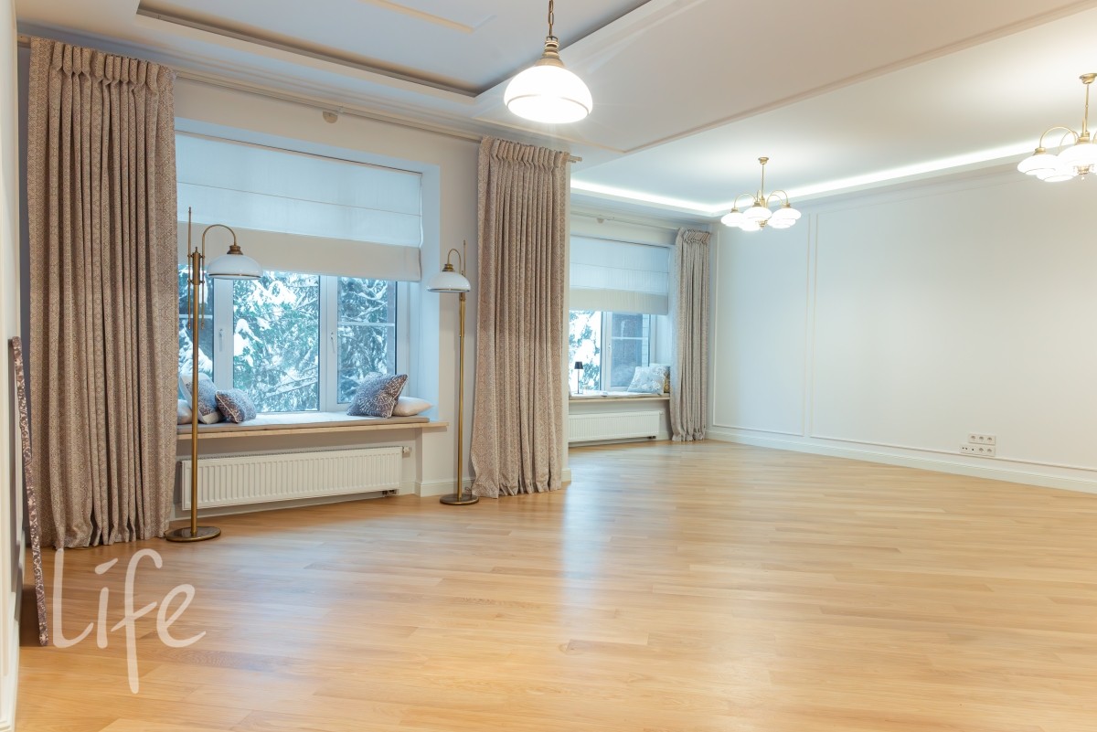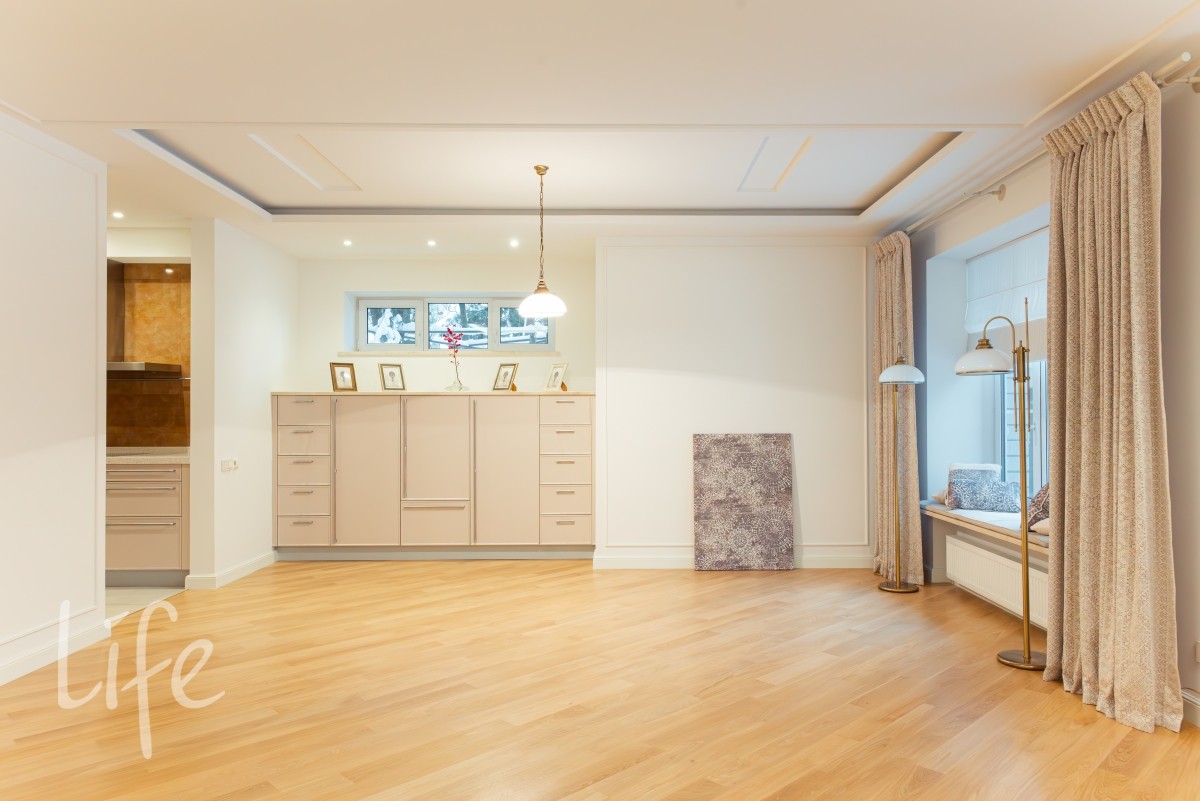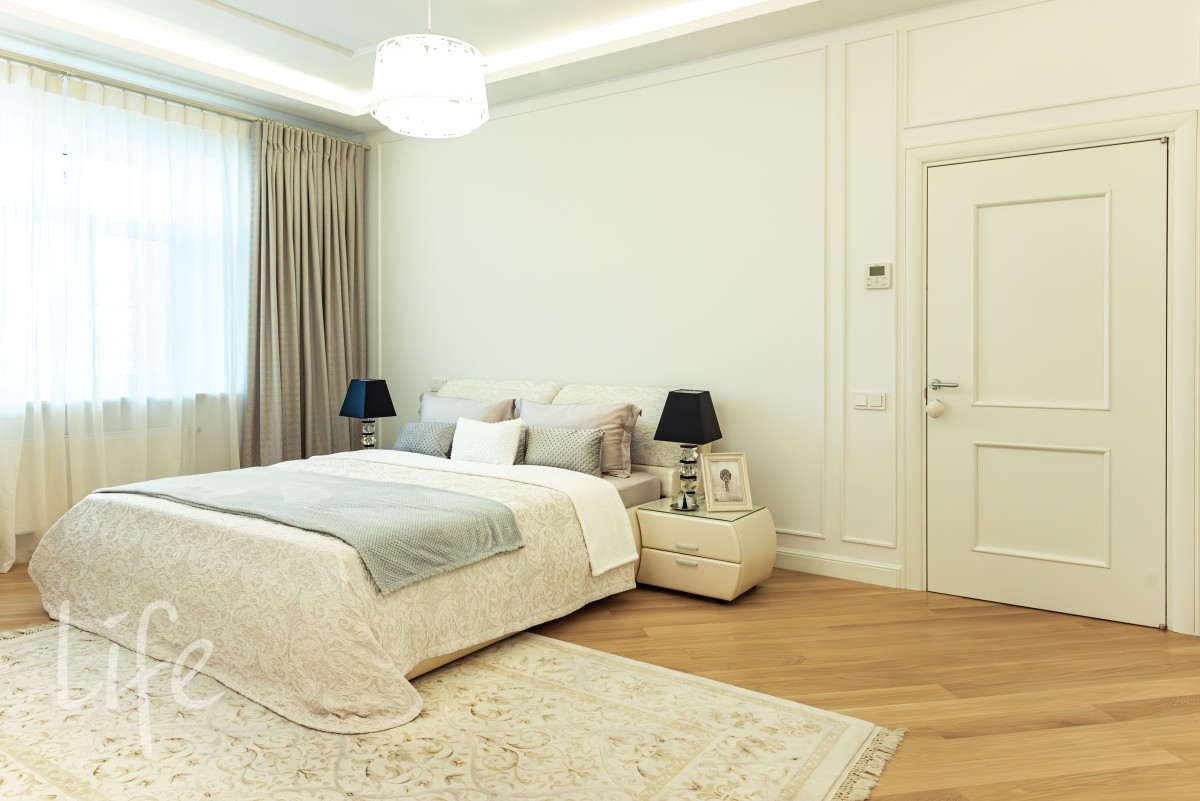 Интерьер выполнен в современном классическом стиле, в светлых тонах, со вкусом подобрана мебель. Напольное покрытие из массива дуба, мраморные подоконники. Установлена система кондиционирования помещений, теплые полы. Есть спутниковое телевидение, высокоскоростной интернет.
