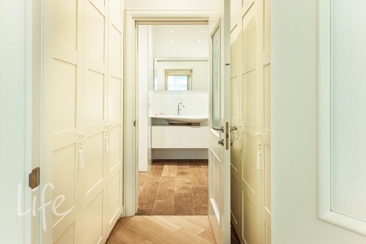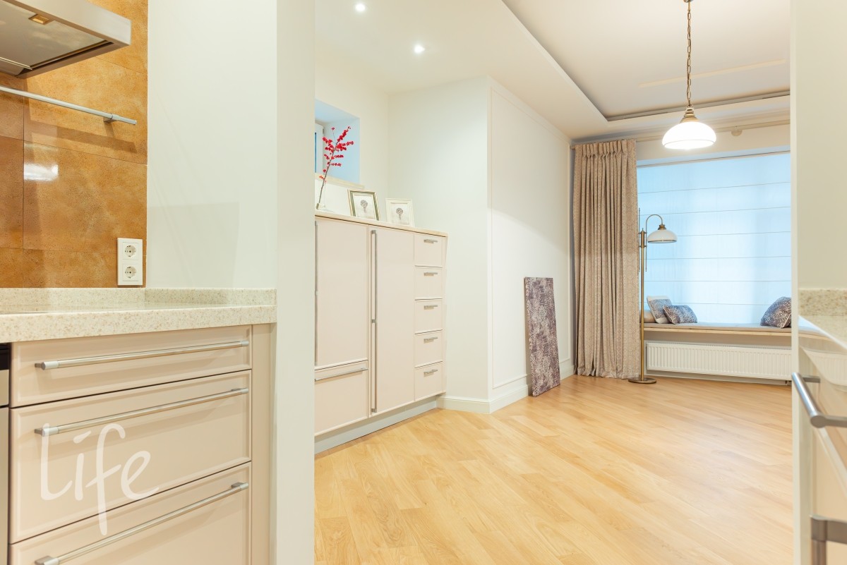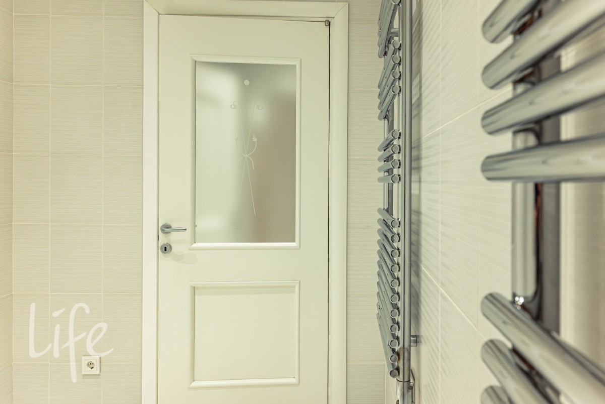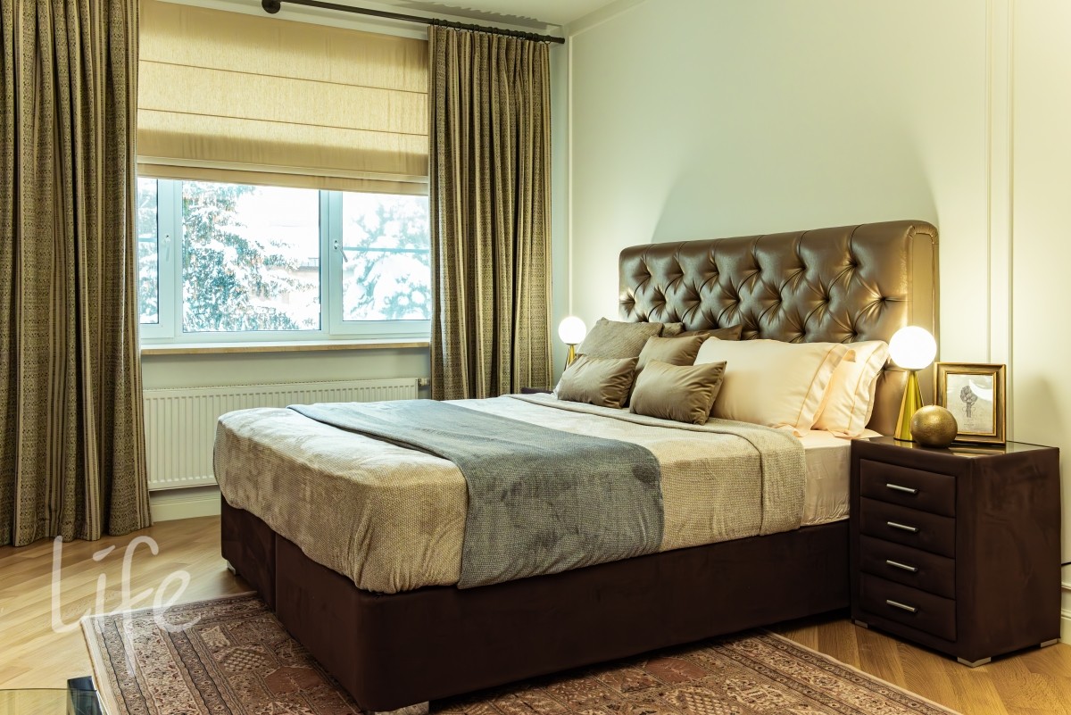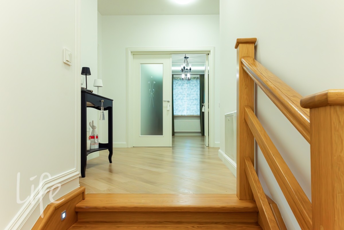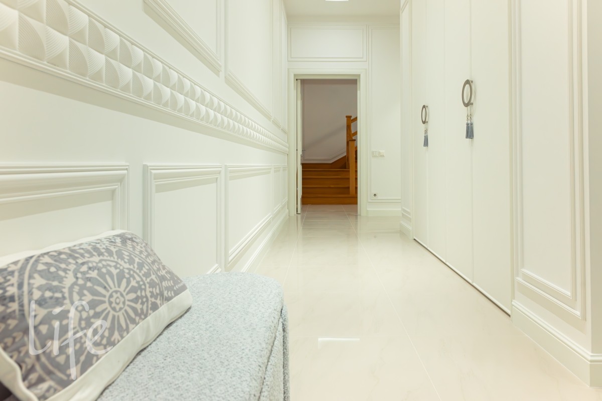 Интерьер выполнен в современном классическом стиле, в светлых тонах, со вкусом подобрана мебель. Напольное покрытие из массива дуба, мраморные подоконники. Установлена система кондиционирования помещений, теплые полы. Есть спутниковое телевидение, высокоскоростной интернет.