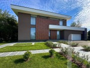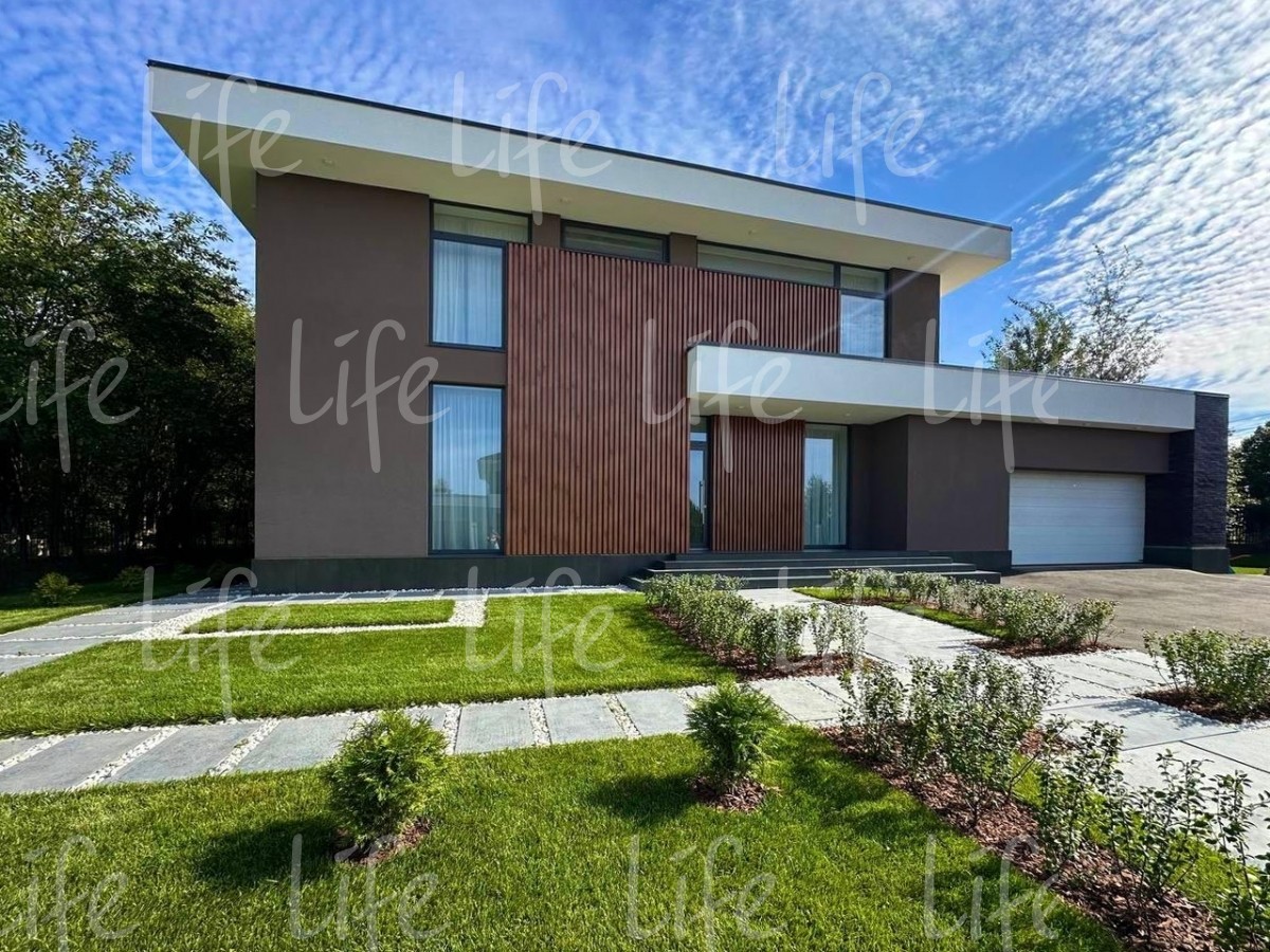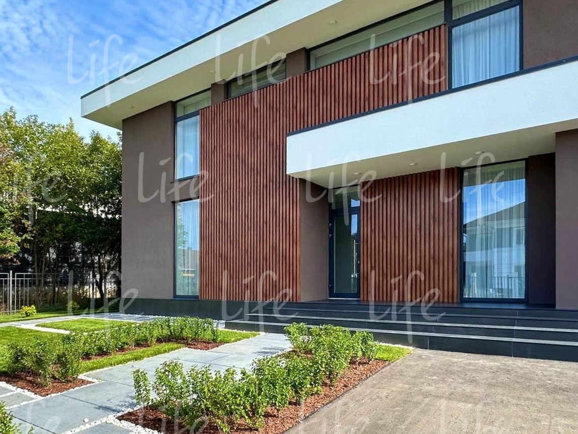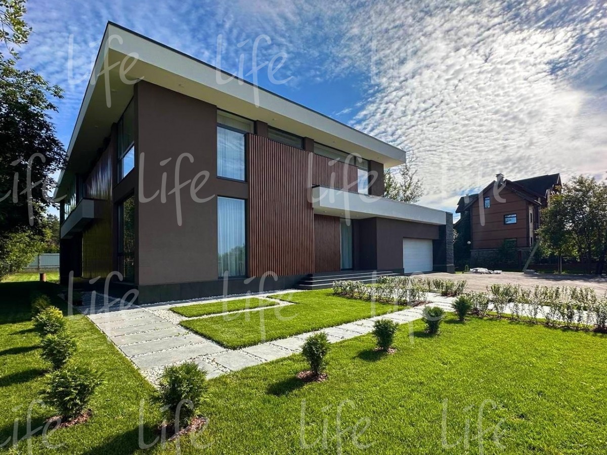 Коттеджный поселок «Русская деревня». Новый дом в стиле хай-тек, полностью под ключ, меблирован и оборудован всей необходимой техникой. Конструктив: монолитные фундамент и перекрытия, стены — кирпич, панорамное остекление, плоская кровля.