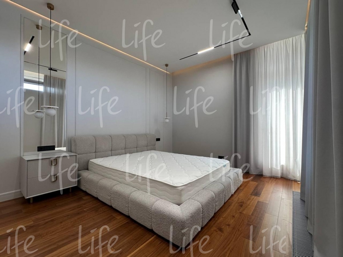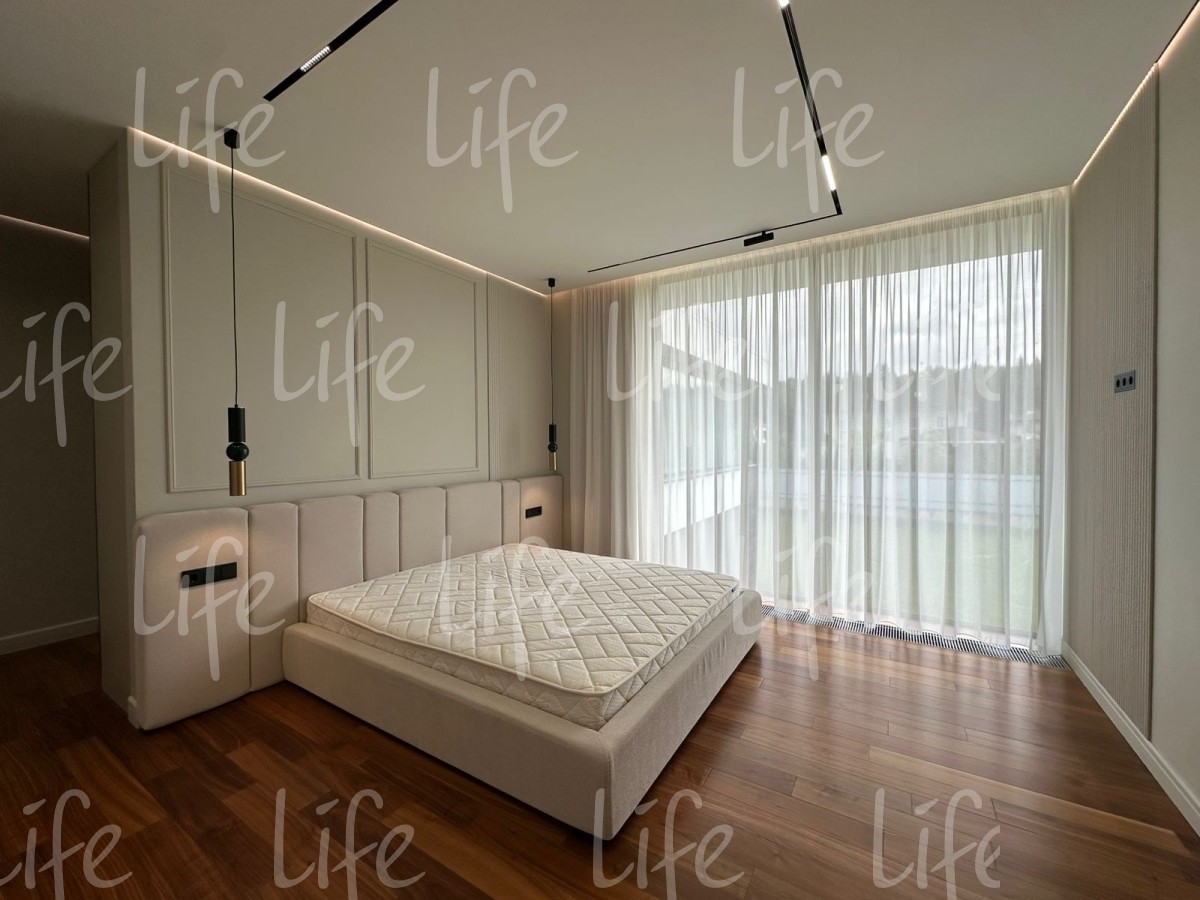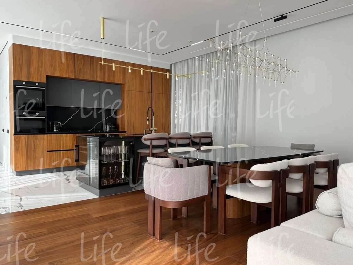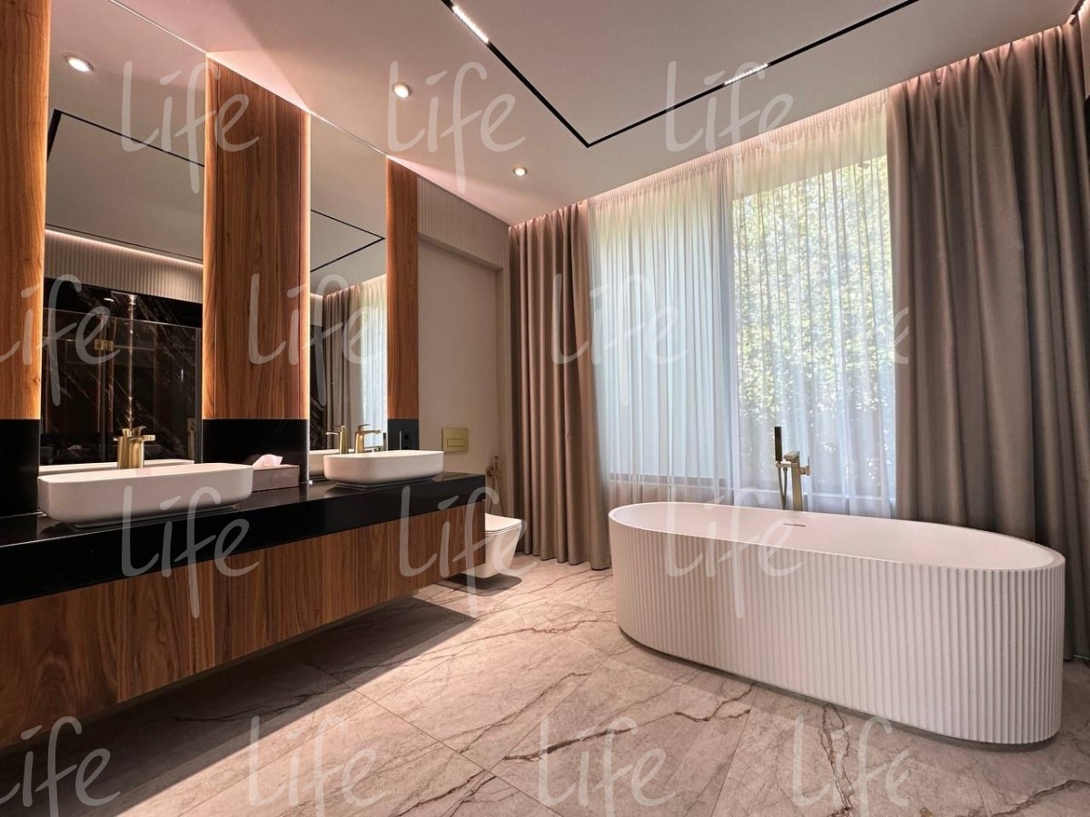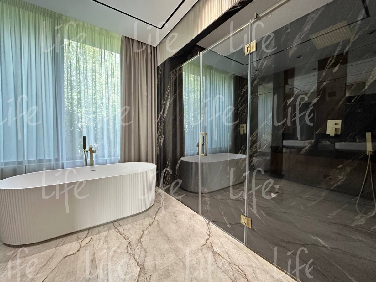 Дизайнерская отделка с использованием премиальных материалов. Со вкусом подобраны мебель и аксессуары. Благодаря панорамному остеклению в доме всегда светло, даже в пасмурные дни.