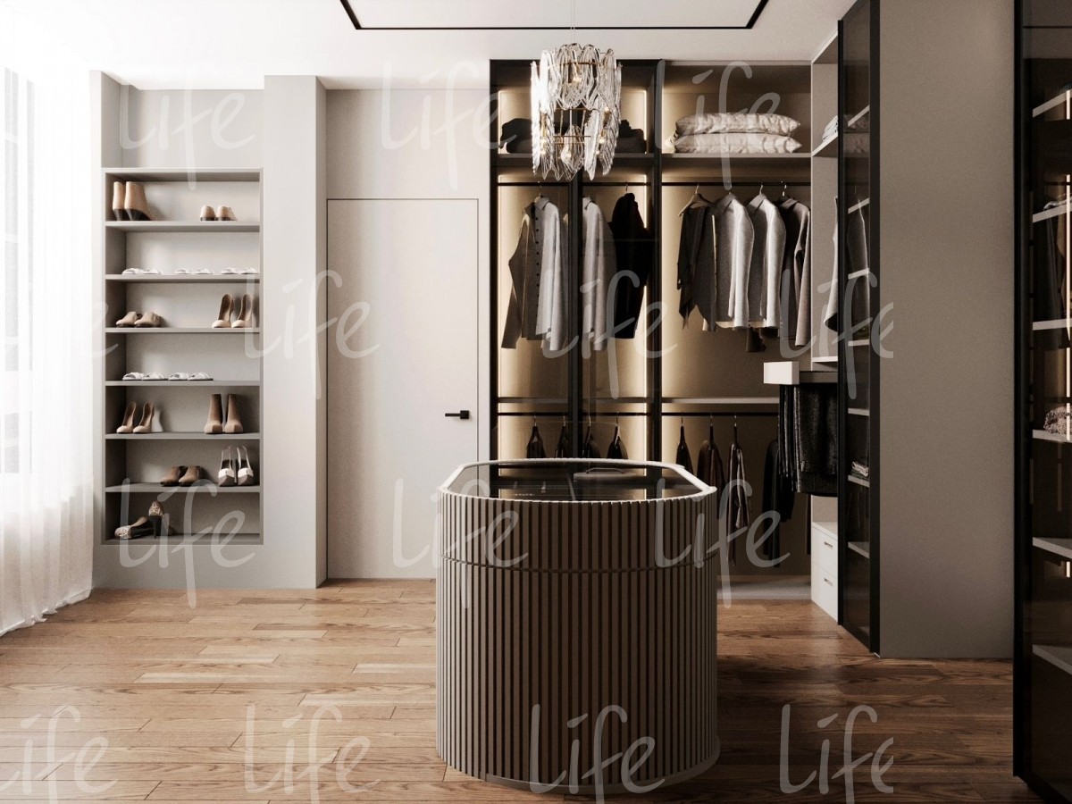 2 этаж: холл, четыре спальни, каждая с гардеробной и с/у, мастер-спальня с просторной проходной гардеробной и ванной комнатой.