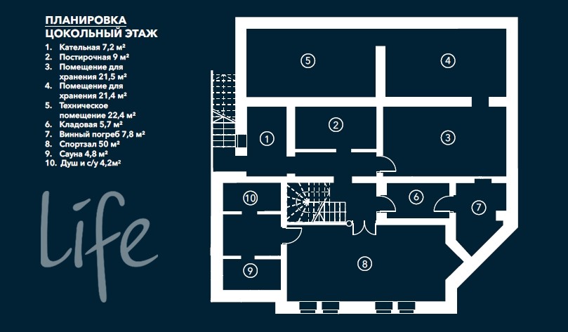 Цоколь: сауна с душевой, тренажерный зал, винный погреб, постирочная, технические и подсобные помещения.