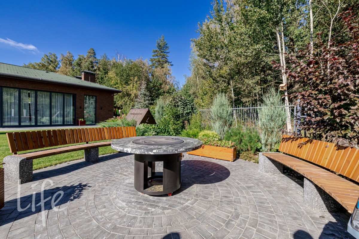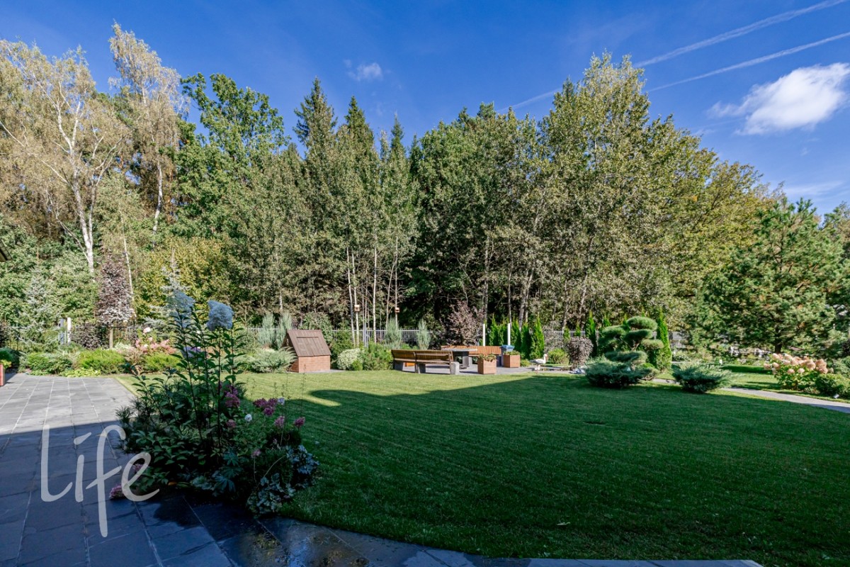 Продуманный ландшафтный дизайн - газон, много цветущих растений и кустарников, плодовый сад, по границам участка - вечнозеленные туи, зона барбекю с оригинальной костровой чашей-столом, колодец, дорожки, освещение, своя калитка в ухоженный лес! Дом и участок находятся под охраной и видеонаблюдением.