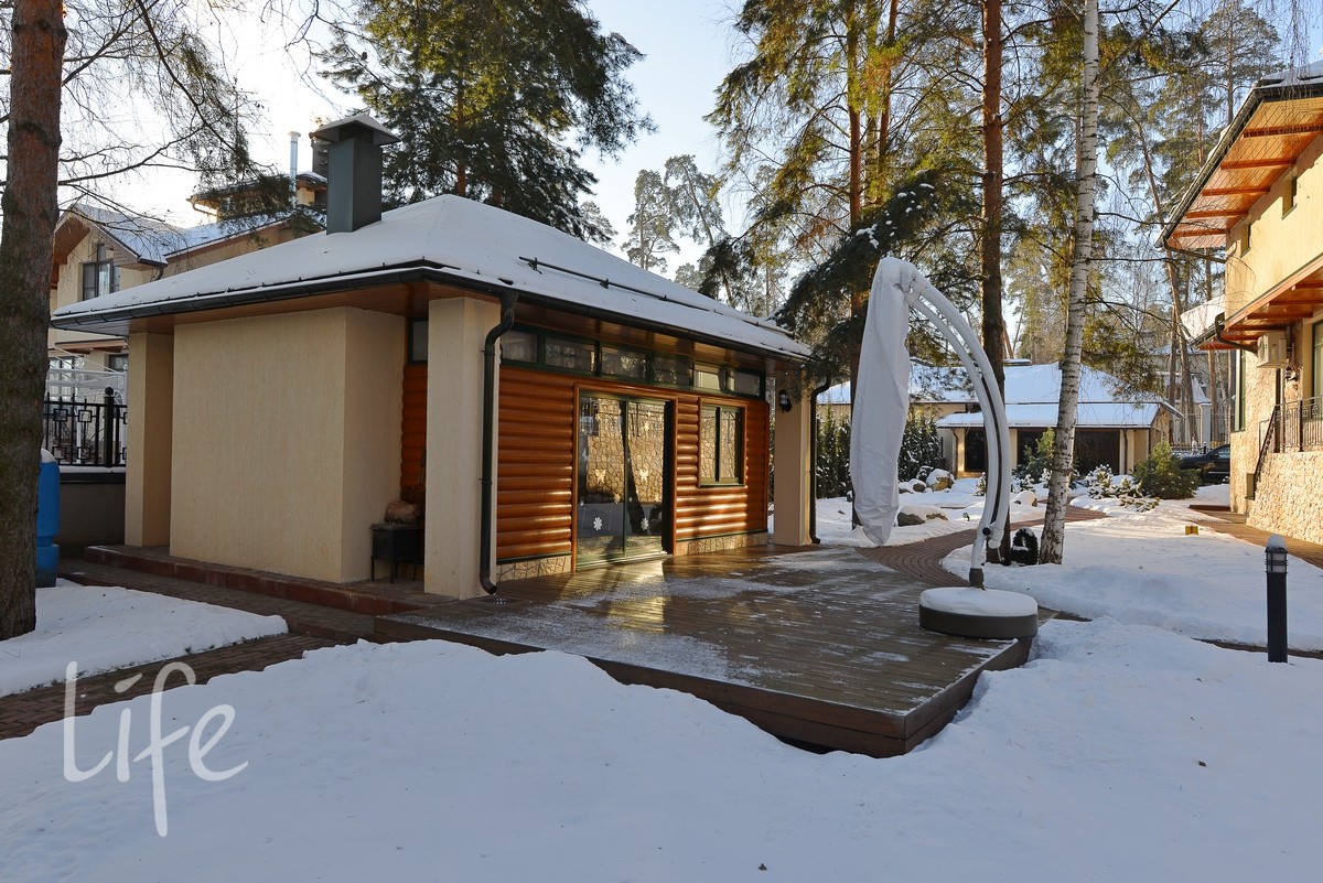 На участке дополнительно расположен бассейн с русской баней, чайный домик с барбекю, гараж с квартирой для охраны или прислуги.