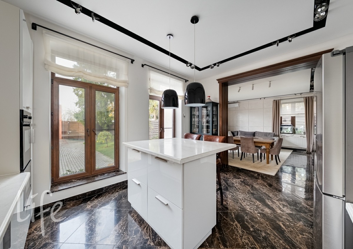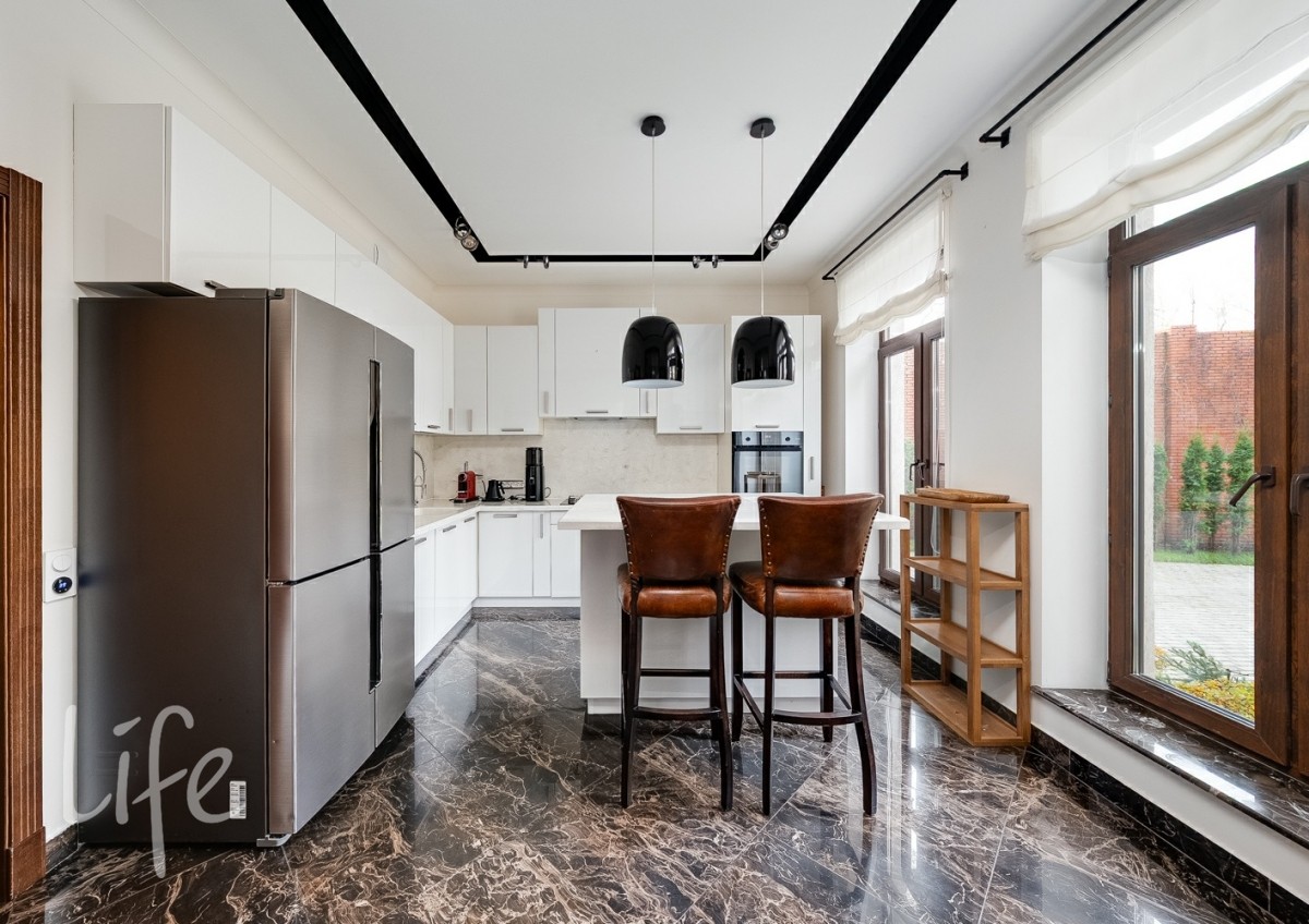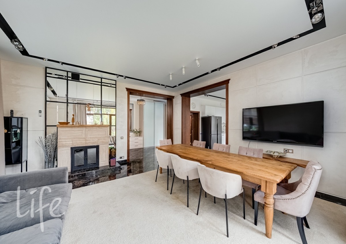 1 этаж: уютная и очень светлая кухня с премиальным техническим оснащением и островком. Просторная столовая-гостиная с удобным диваном, большим обеденным столом и дровяным камином создаёт непередаваемое чувство комфорта и уюта. Спальня с санузлом, постирочная и гладильная комната с кладовой. Холл с местами для хранения верхней одежды, а также гараж на 2 машиноместа с зарядками для электрокаров.