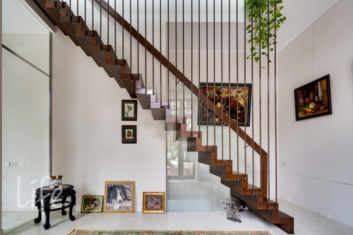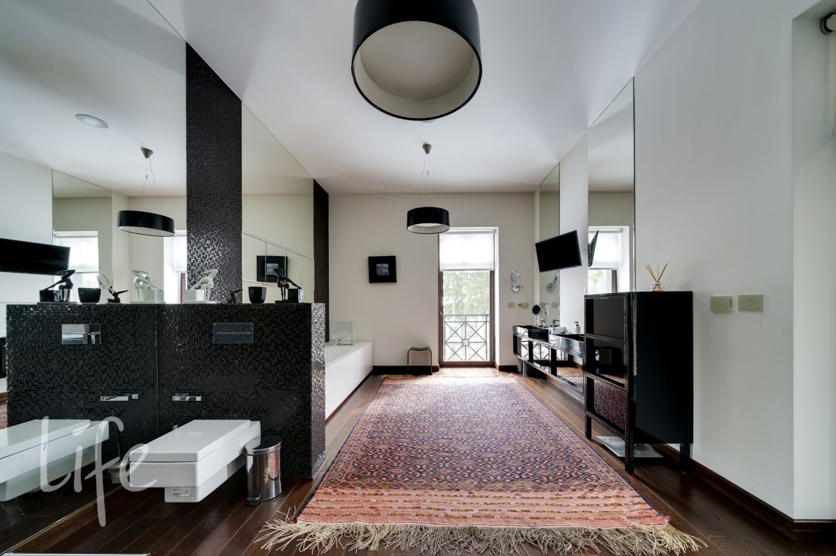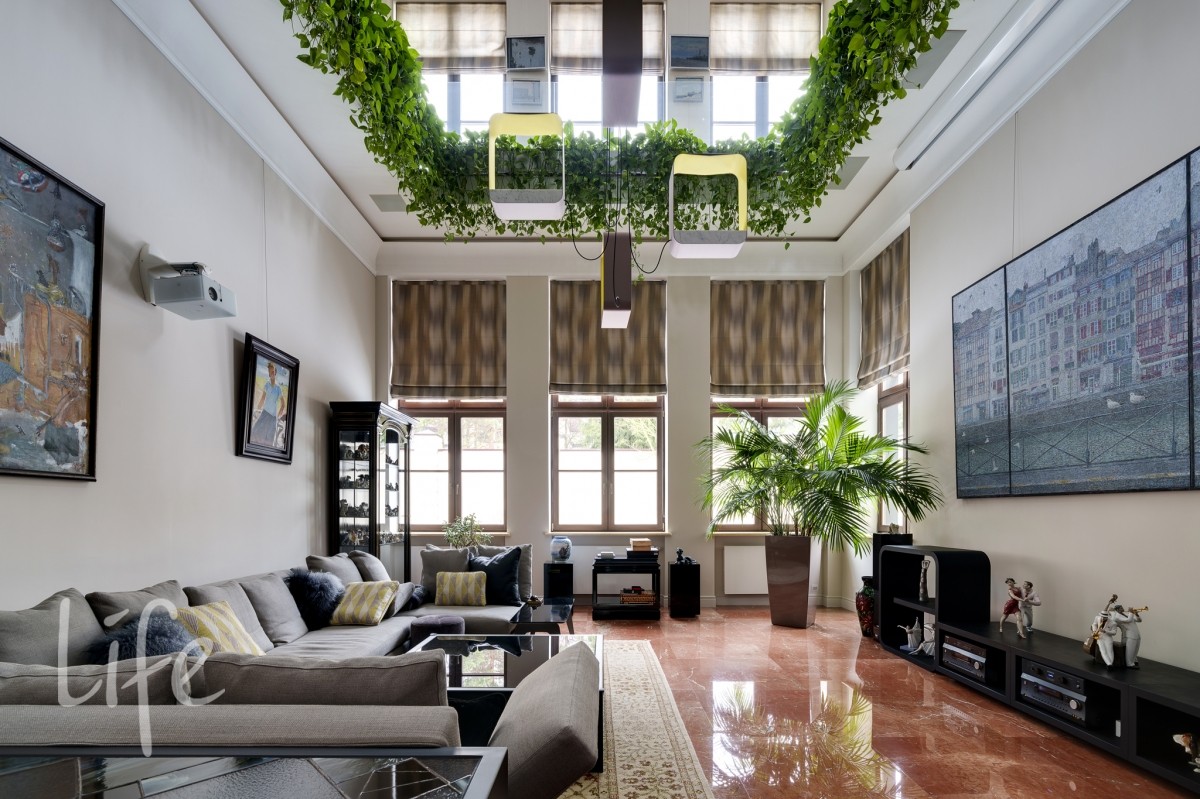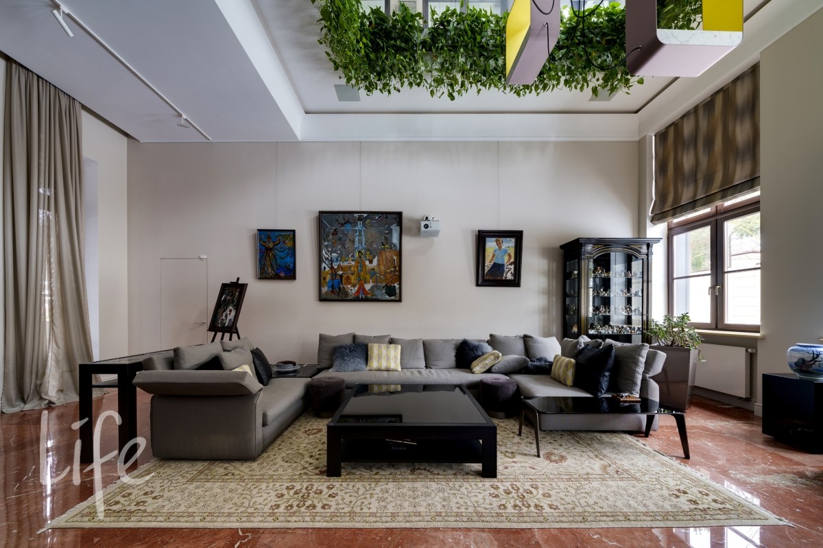 С очень качественной дизайнерской отделкой, дорогой эксклюзивной мебелью, коврами и картинами.