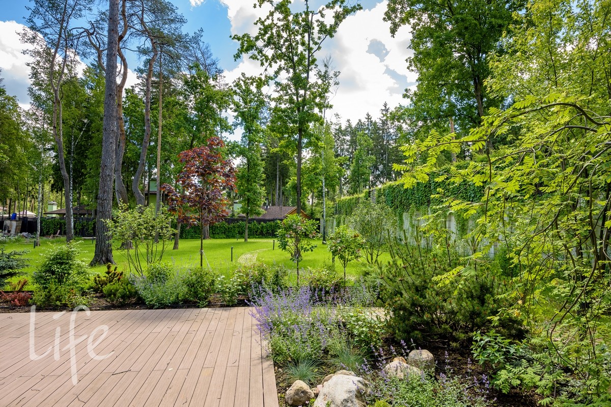 Лесной участок на котором проведены ландшафтные работы, с посадкой декоративных растений. Проведена система автопоилка, освещение, вымощены дорожки. Участок имеет несколько зон.(сад, декоративные растения, лесная зона).