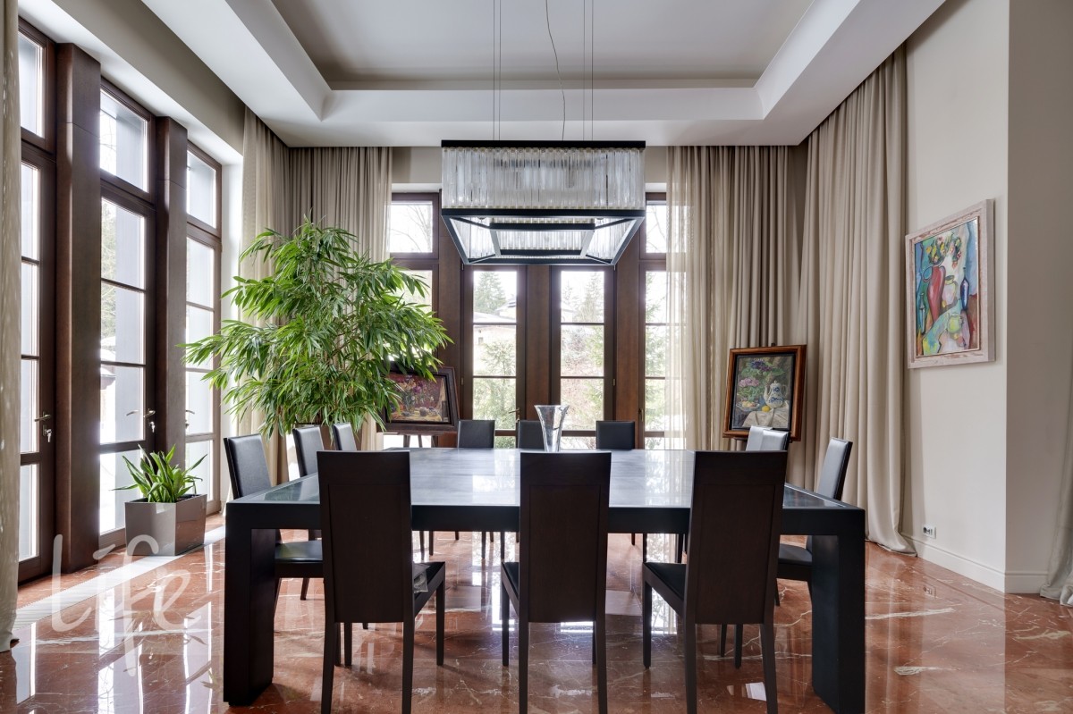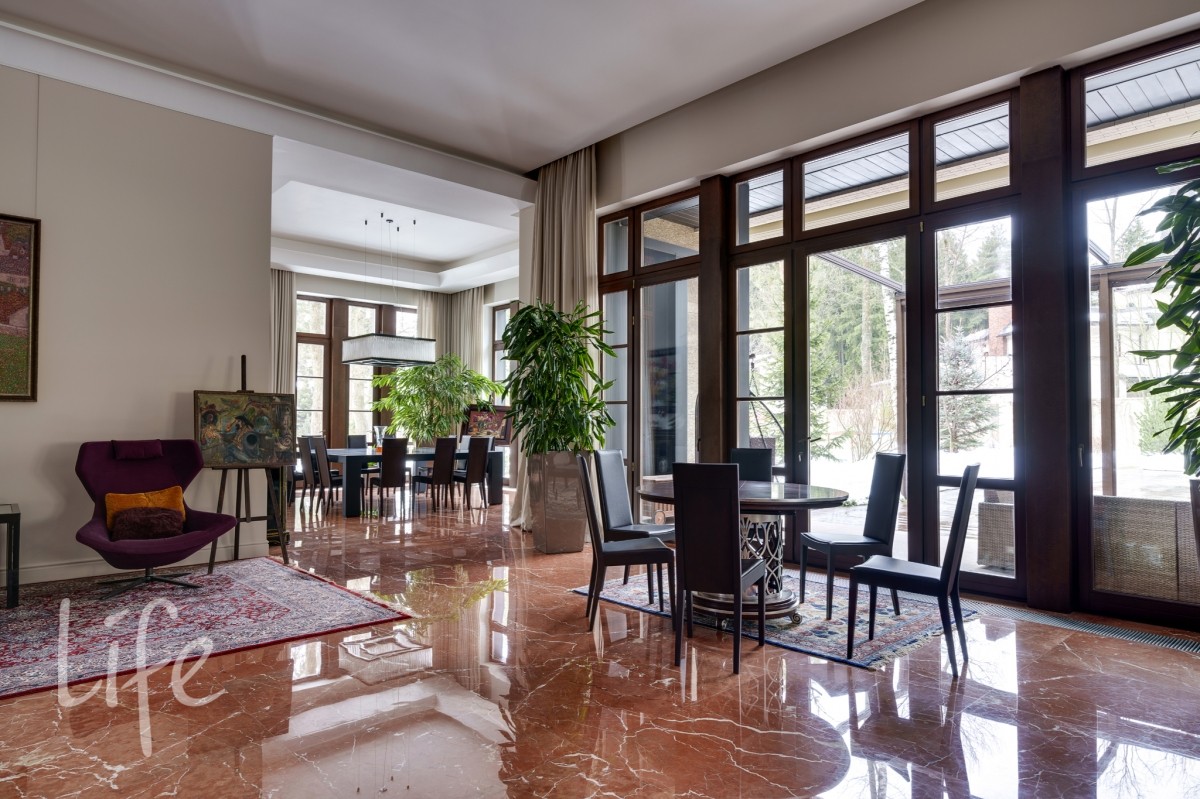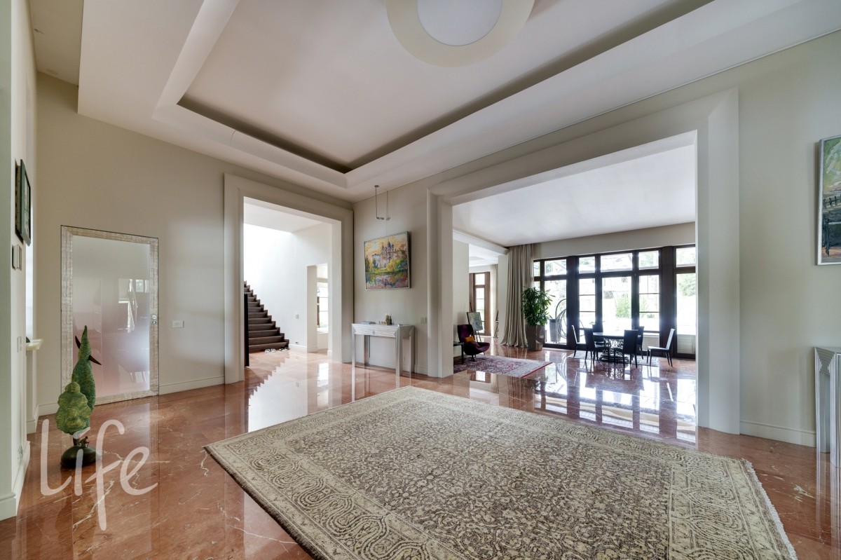 1 этаж: холл, гостиная со вторым светом и эксклюзивным мраморным камином, кухня,есть черновая кухня, столовая, гостевая спальня, гардеробная, 2 с/у, бассейн с выходом на веранду и c тренажерным залом, сауна, хамам.