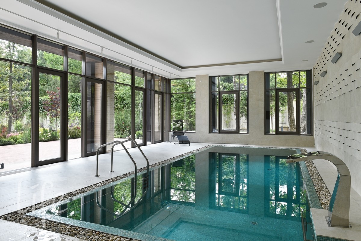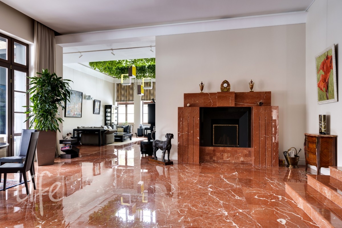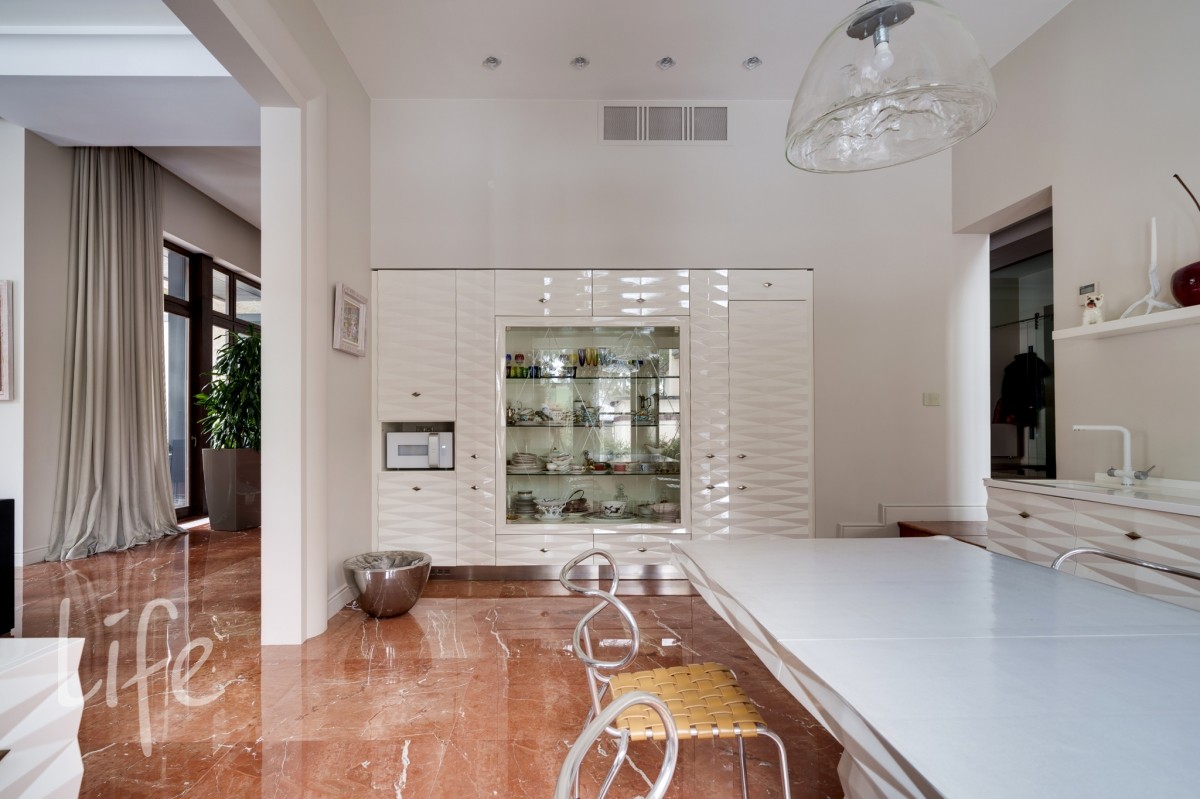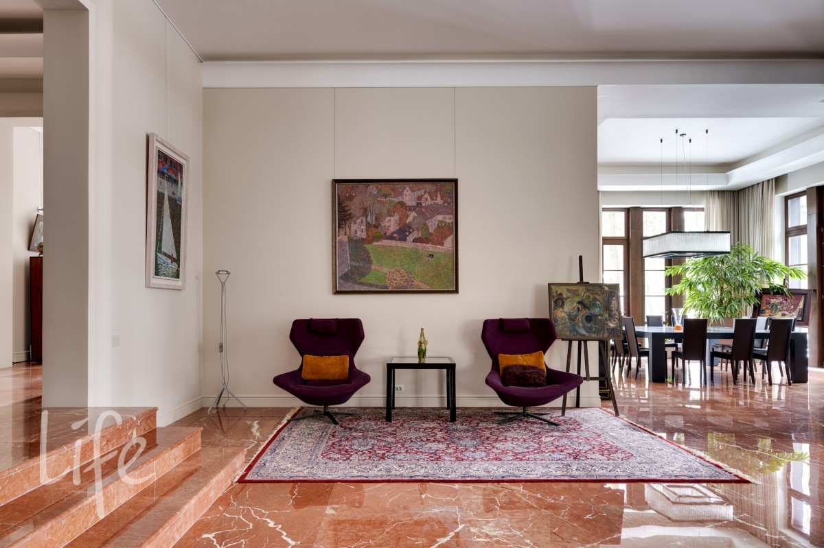 1 этаж: холл, гостиная со вторым светом и эксклюзивным мраморным камином, кухня,есть черновая кухня, столовая, гостевая спальня, гардеробная, 2 с/у, бассейн с выходом на веранду и c тренажерным залом, сауна, хамам.