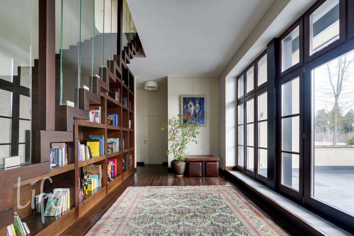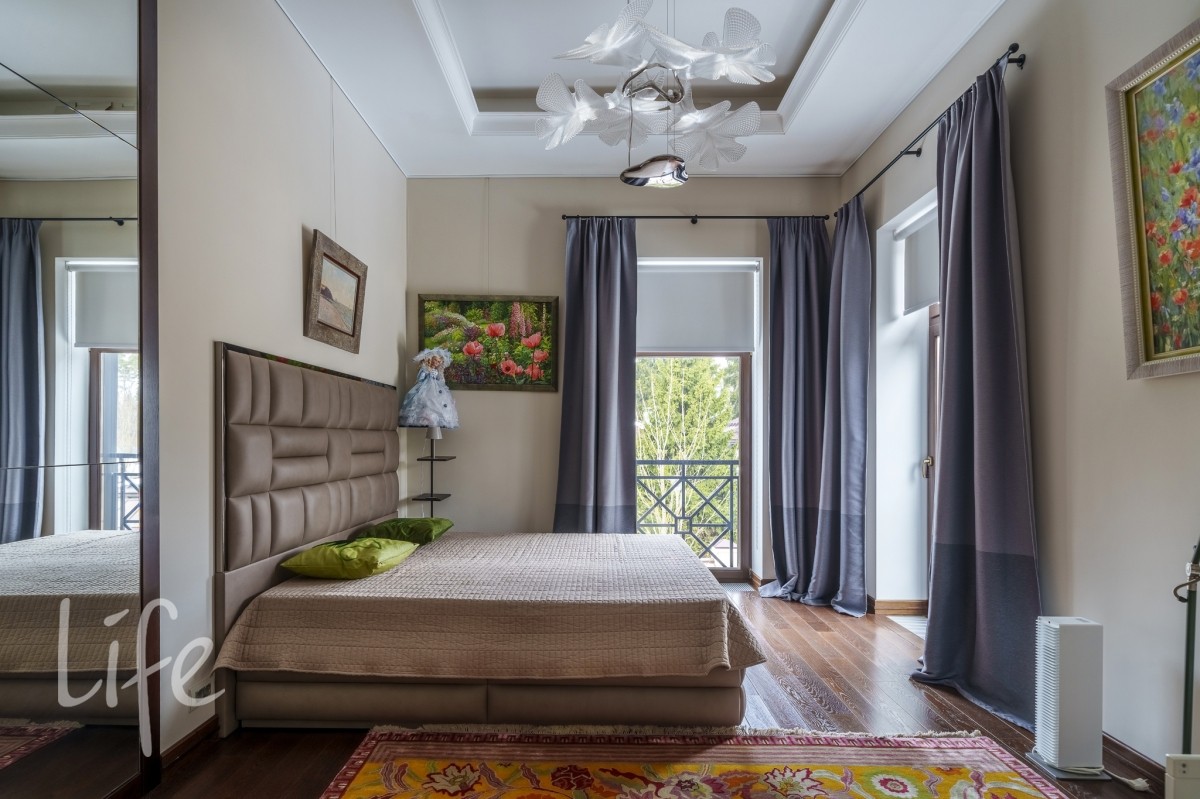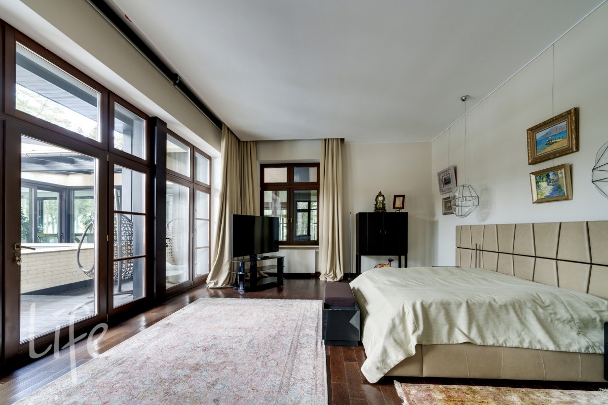 2 этаж: холл с выходом на веранду, хозяйская спальня с выходом на веранду, с/у и гардеробной, 2 спальни со своими с/у и гардеробными, кабинет, 2-я гостиная с панорамными окнами, камином, русским бильярдом, домашним кинотеатром.