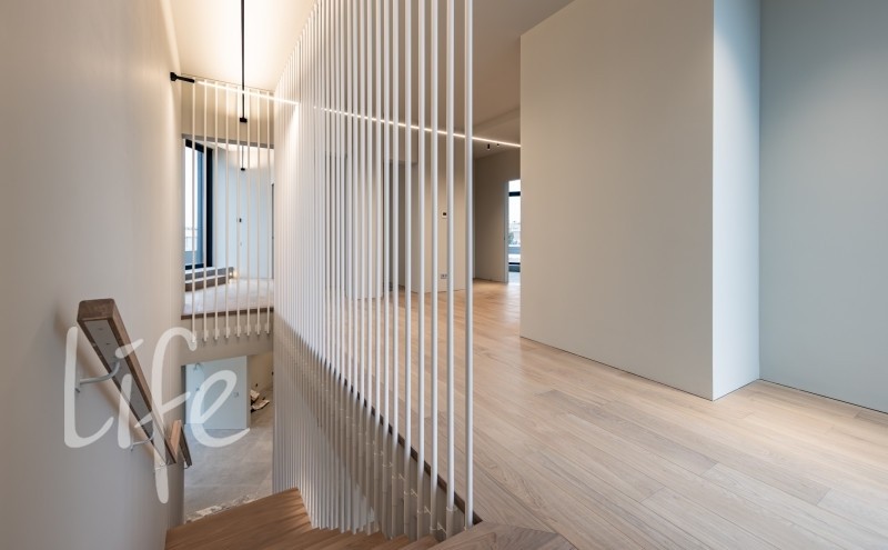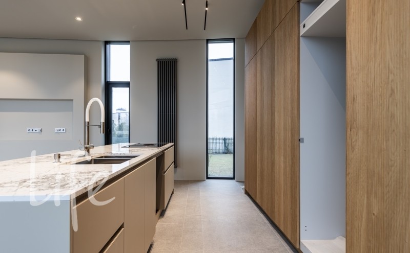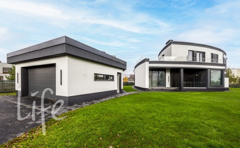 Фасад дома отделан лиственницей, просторная терраса оснащена системой обогрева и выдвижной маркизой. Внутренняя отделка выполнена из качественных дорогих материалов: на полу инженерная доска из дуба, немецкая кухня из массива дуба Leicht, светильники Vibia, в