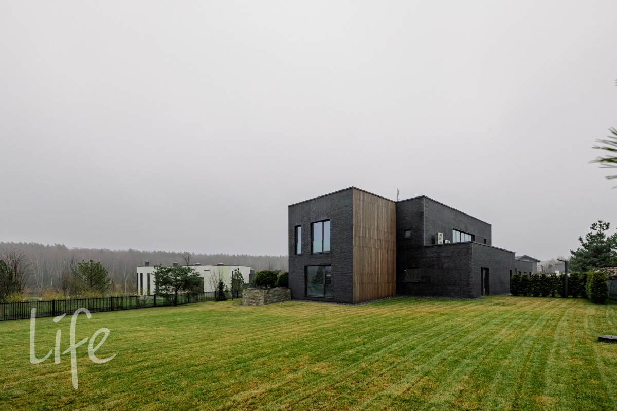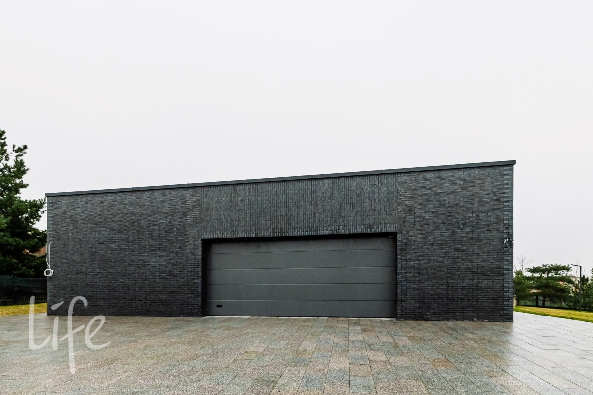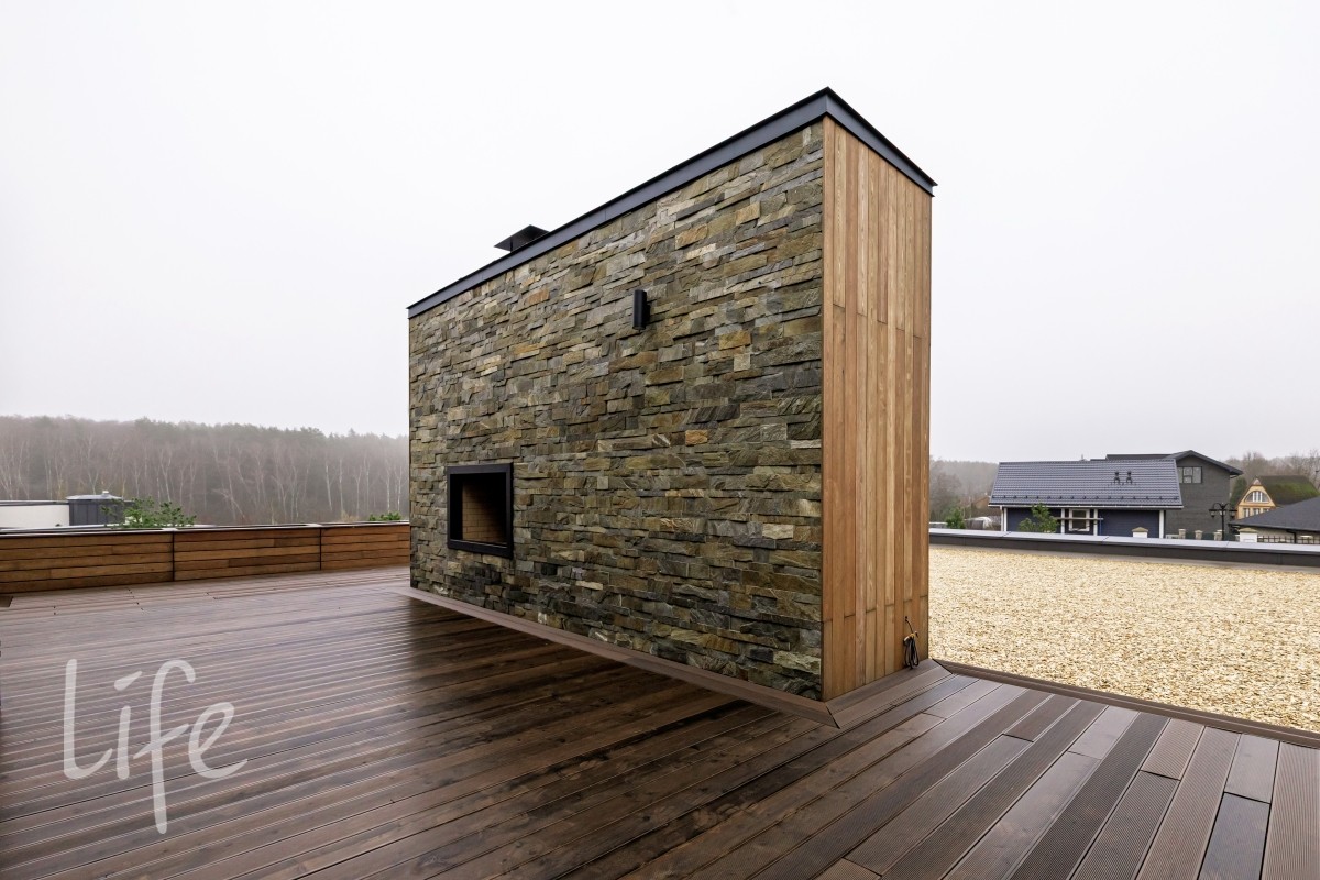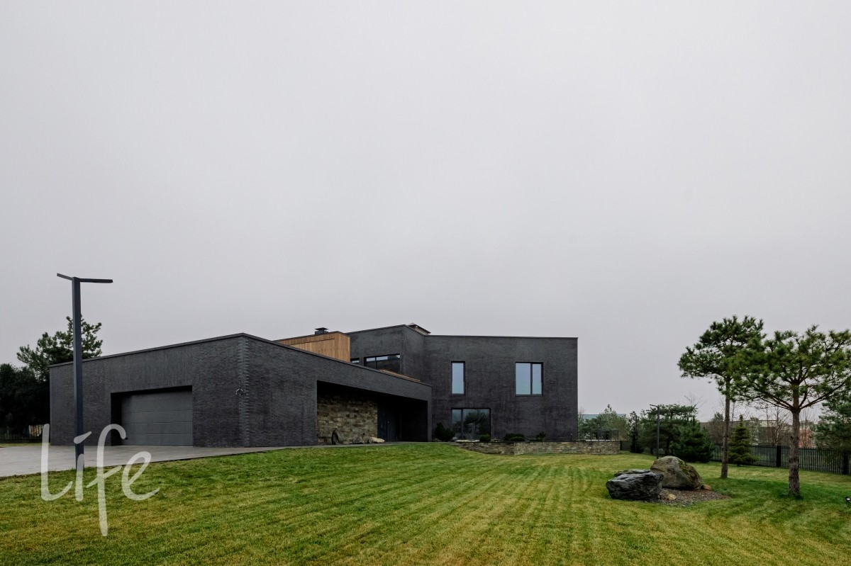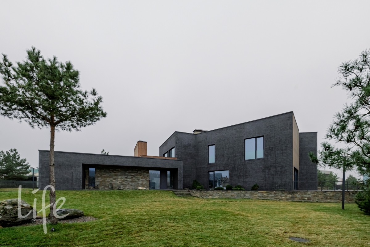 Красивый современный дом с панорамным остеклением и плоской кровлей. Фасад выполнен из клинкерной плитки Feldhaus Klinker, камня и лиственницы, окна от компании Schuco.