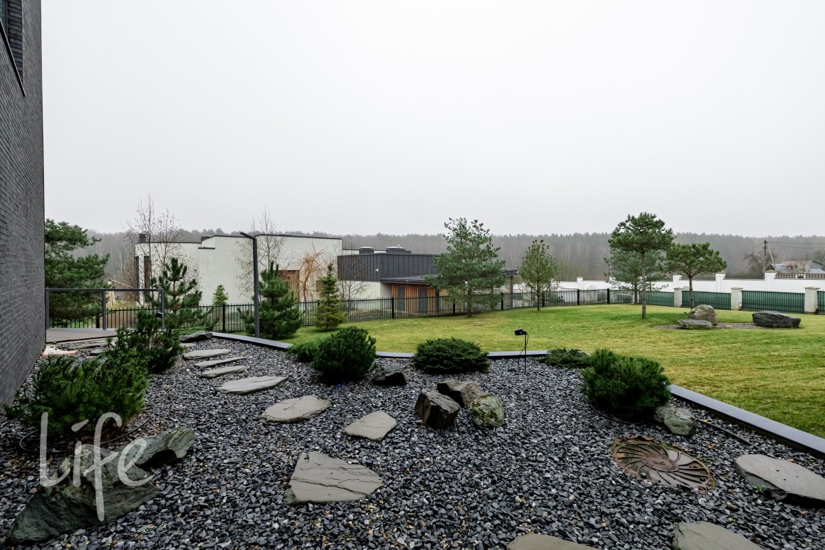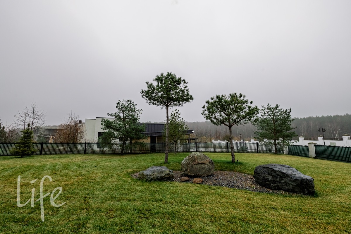 Участок правильной прямоугольной формы, выровнен. Сделан ландшафтный дизайн. Газон, декоративные деревья и кустарники, ночное освещение. Дренажная система, ливневая канализация, установлена система автополива.