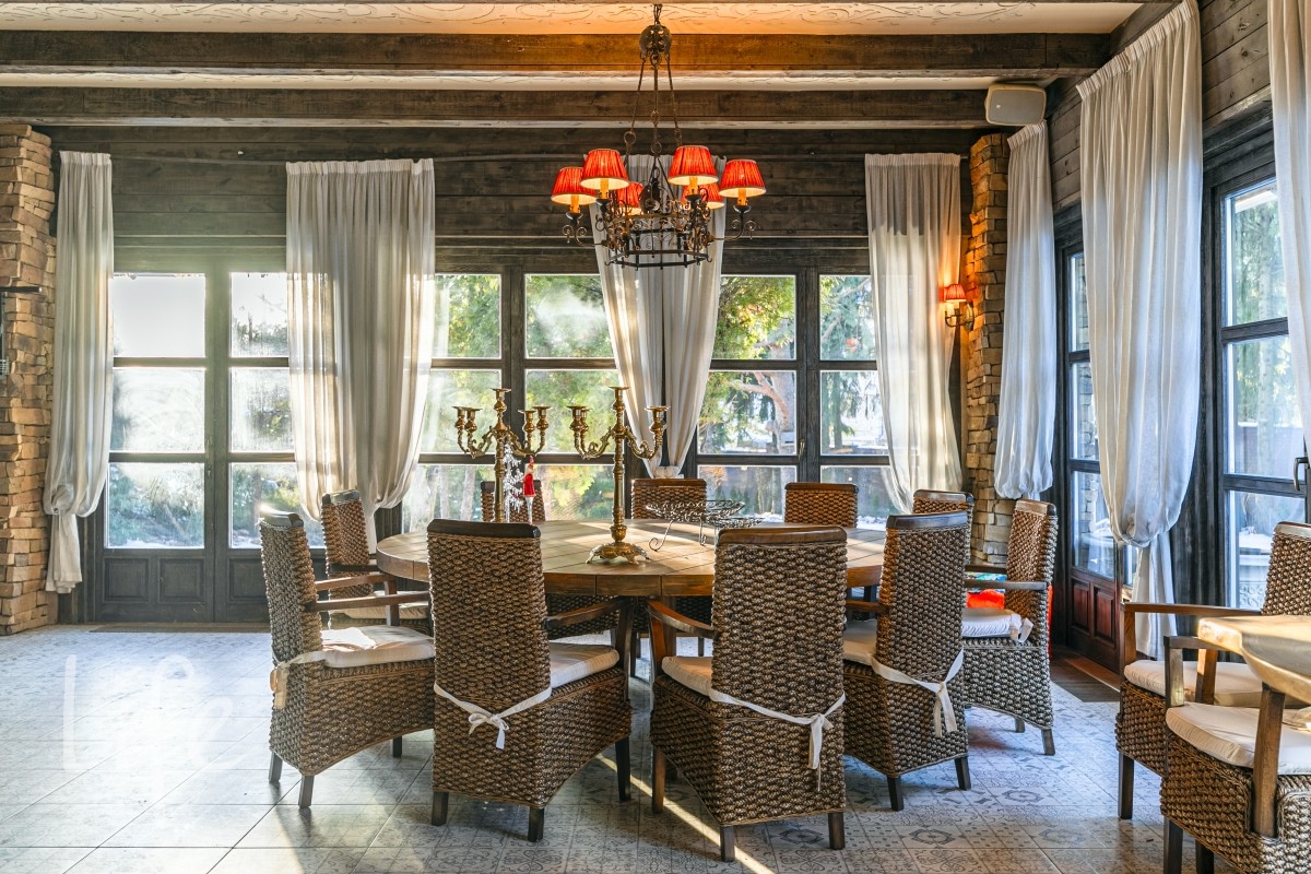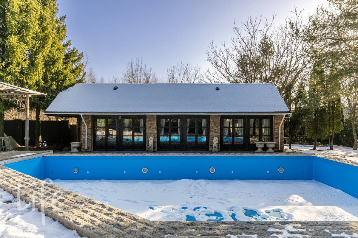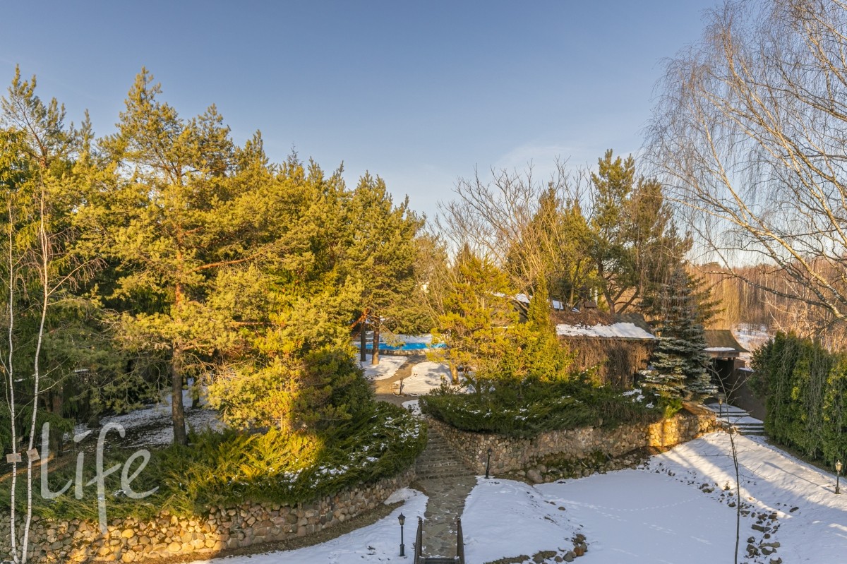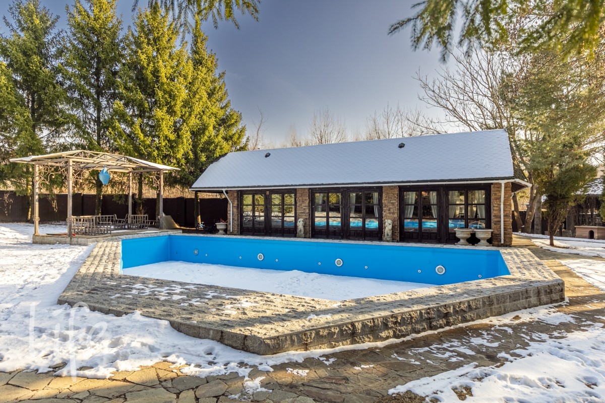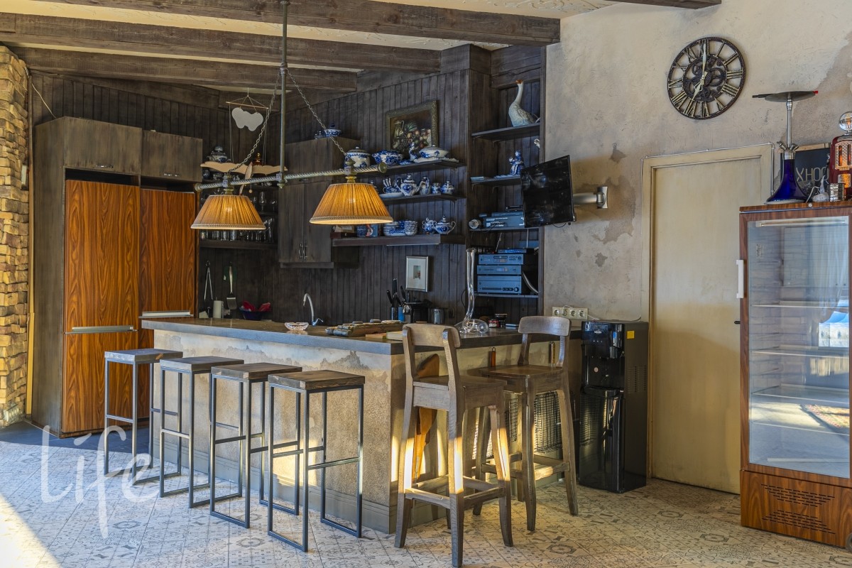 2-й ярус - беседка для барбекю, с мангалом , вертелом и тандыром. Открытый бассейн с подогревом 100кв.м. Абсолютно автономный павильон 110м2 в тосканском стиле, полностью остеклённый и обогреваемый. Все окна/ двери в пол, на лето полностью открываются.