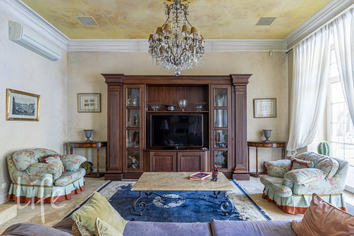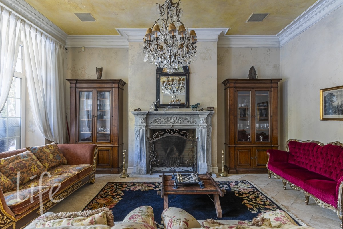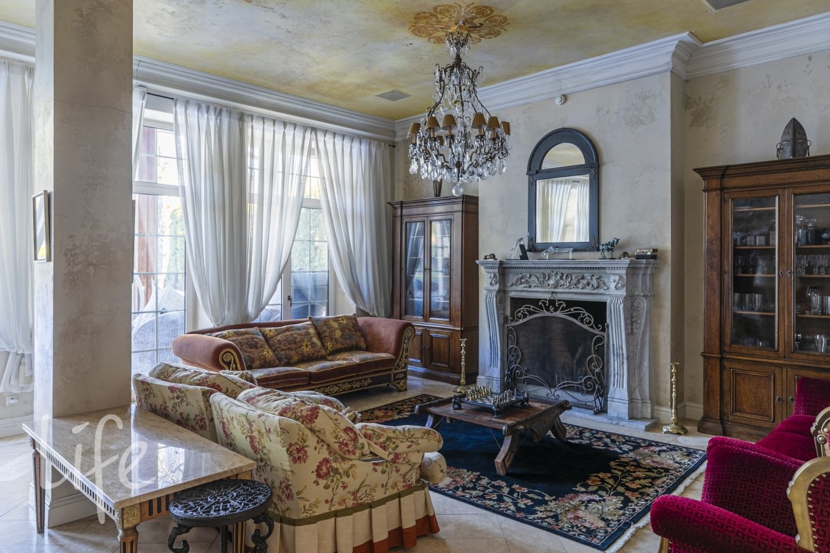 Холл 30 м2, гардеробная , гостевой с/у, гостиная 65 м2 с 6- ти метровыми потолками, антикварной итальянской мебелью ,люстрами , мурановскими светильниками и тосканским мраморным камином, с видом на пруд с водопадом , лужайкой и выходом на патио 60 м2. Потолок имеет высокохудожественную состаренную роспись.