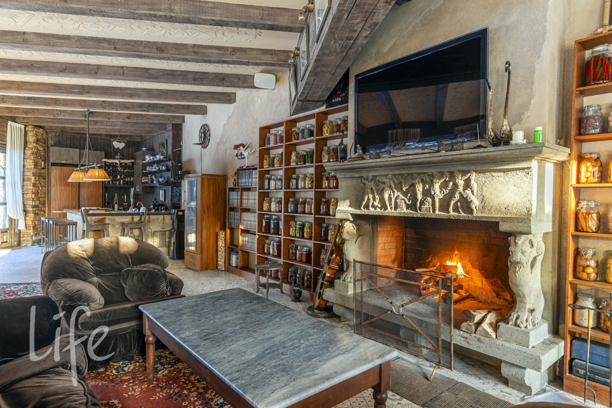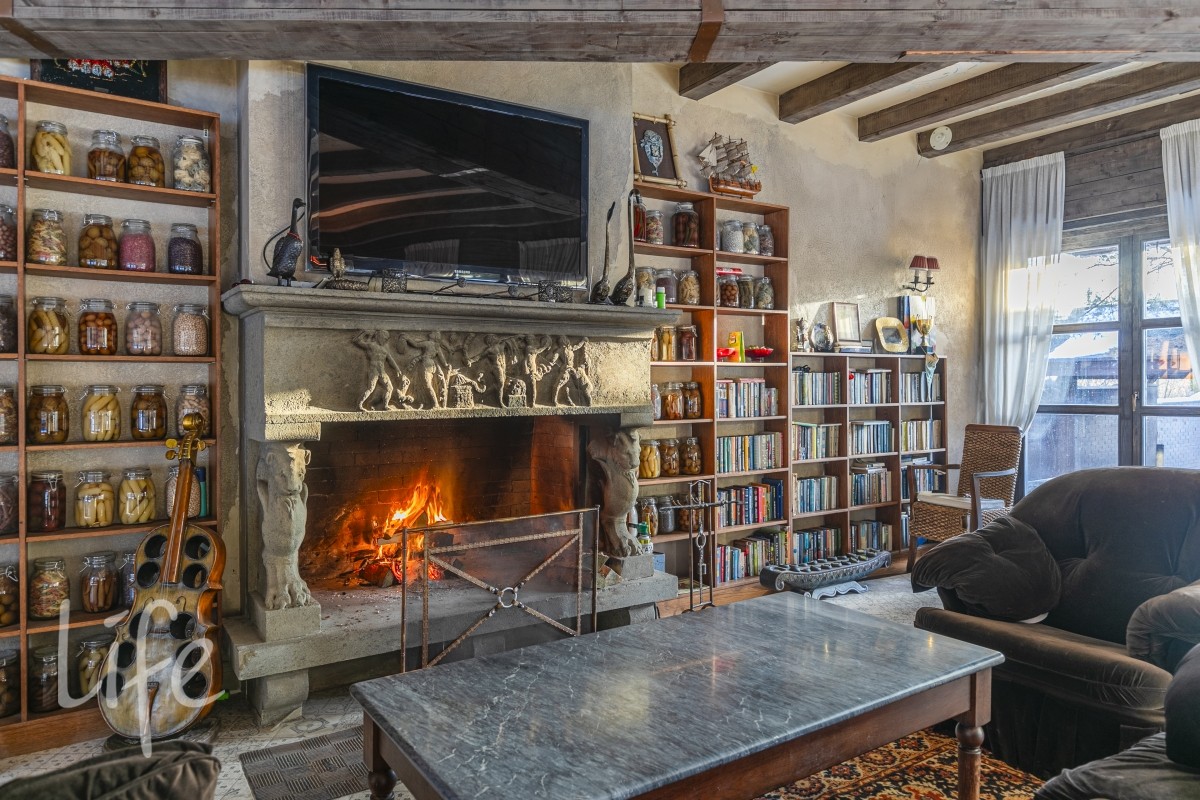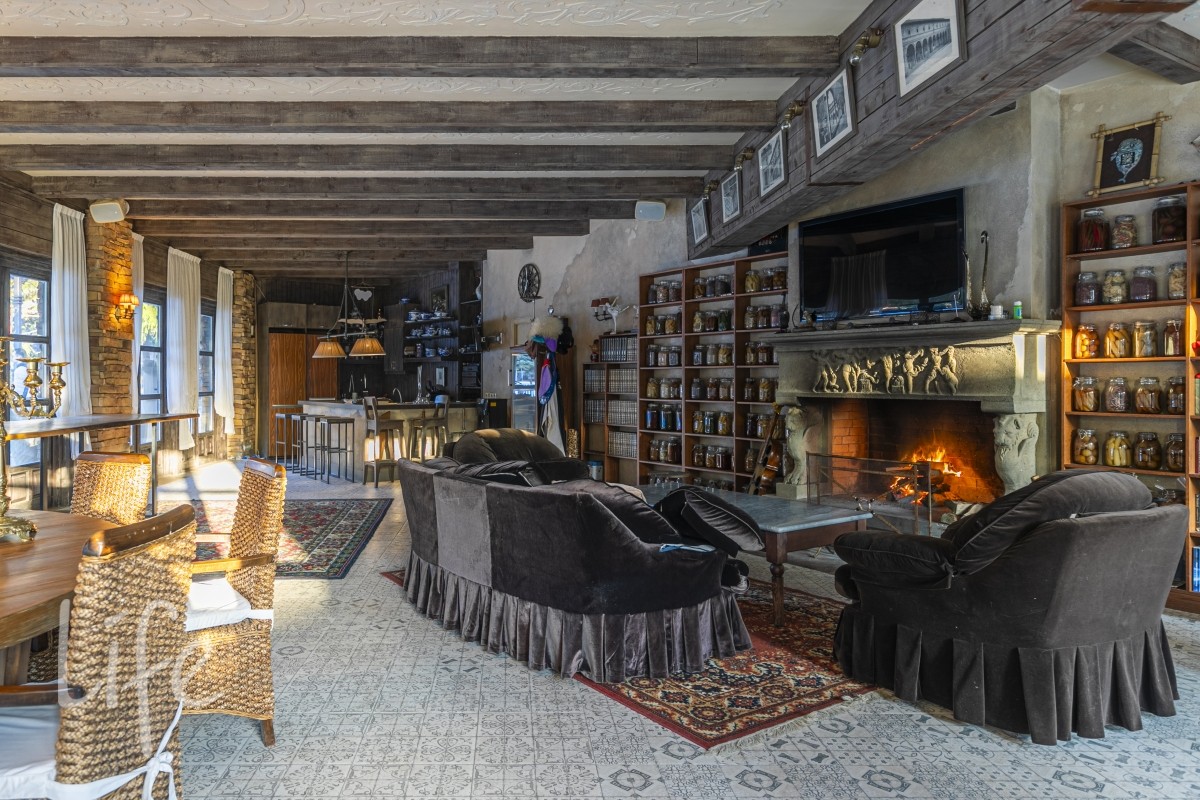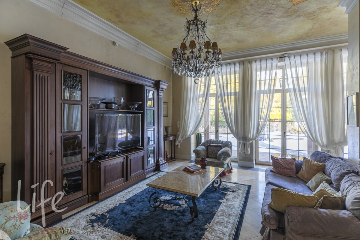 Холл 30 м2, гардеробная , гостевой с/у, гостиная 65 м2 с 6- ти метровыми потолками, антикварной итальянской мебелью ,люстрами , мурановскими светильниками и тосканским мраморным камином, с видом на пруд с водопадом , лужайкой и выходом на патио 60 м2. Потолок имеет высокохудожественную состаренную роспись.