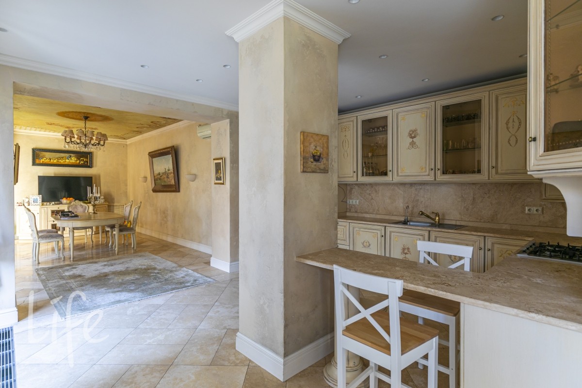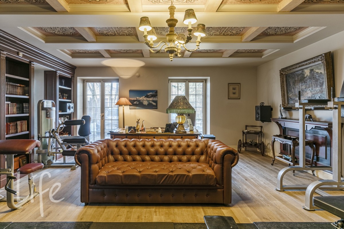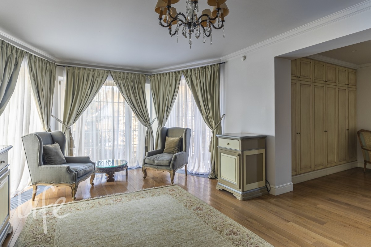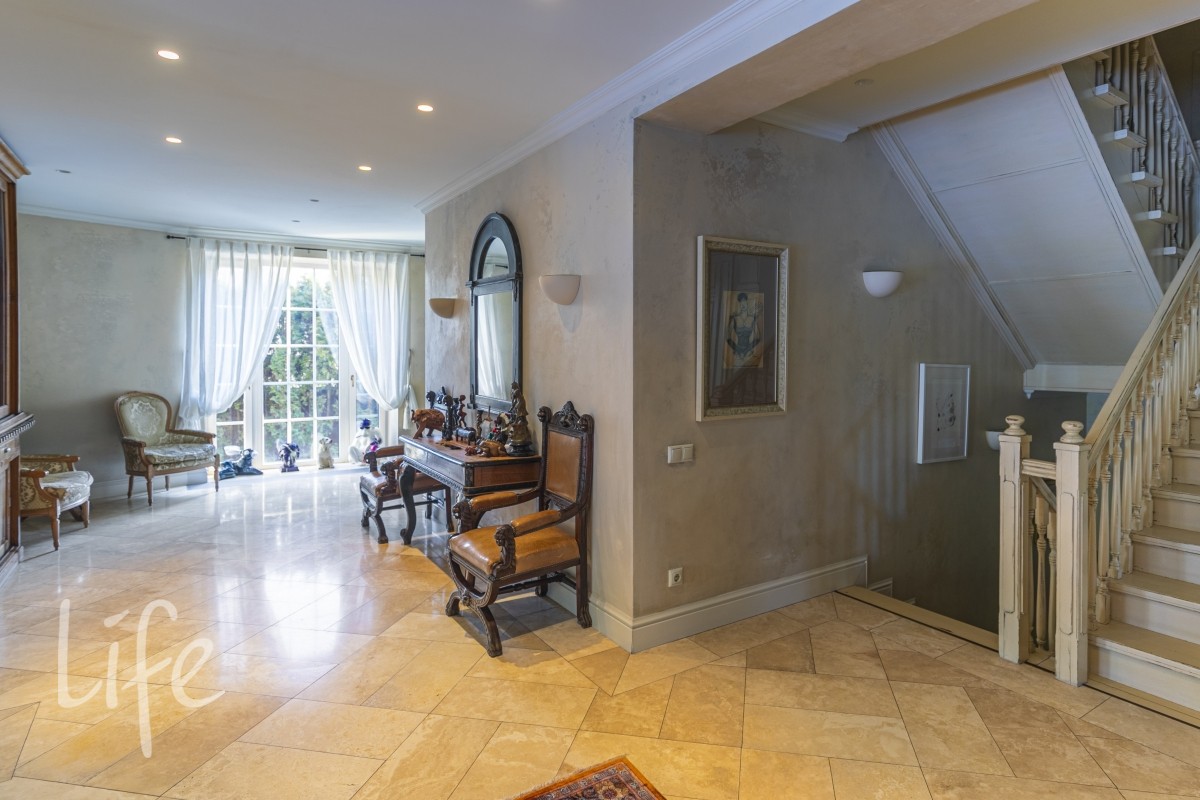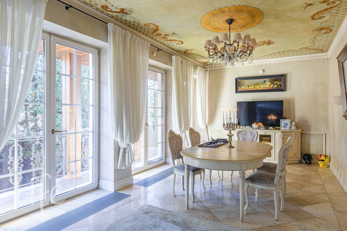 1 этаж: гостиная с итальянским мраморным камином, кухня, столовая, кабинет/библиотека с домашним кинотеатром, санузел. Окна в пол по всему периметру. Художественная роспись потолков и стен, пол-мрамор, старинная антикварная мебель, дорогие антикварные хрустальные люстры.