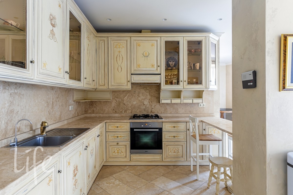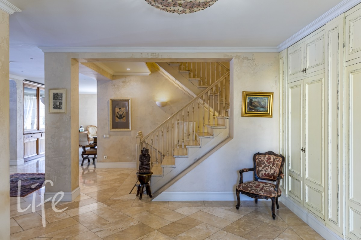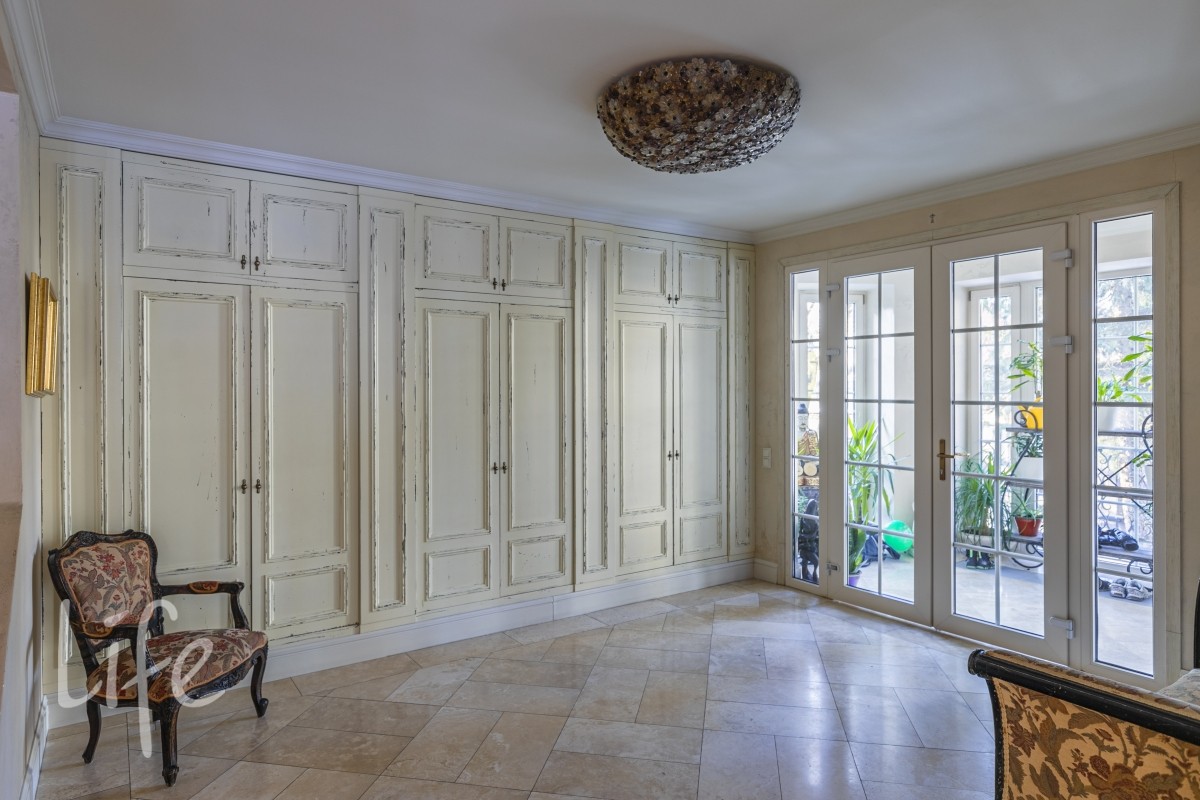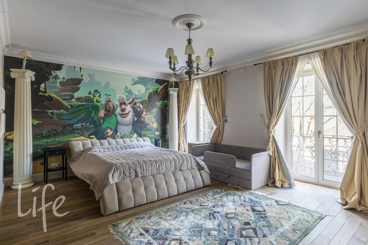 1 этаж: гостиная с итальянским мраморным камином, кухня, столовая, кабинет/библиотека с домашним кинотеатром, санузел. Окна в пол по всему периметру. Художественная роспись потолков и стен, пол-мрамор, старинная антикварная мебель, дорогие антикварные хрустальные люстры.