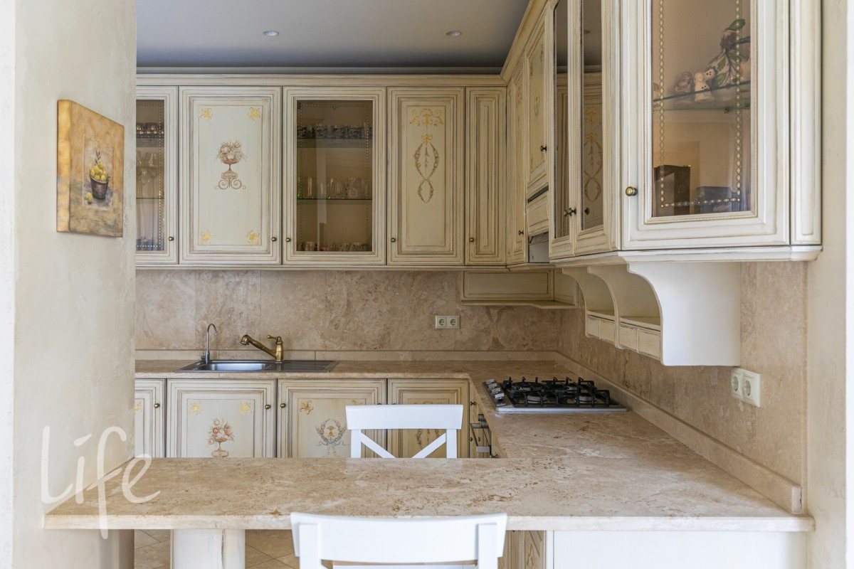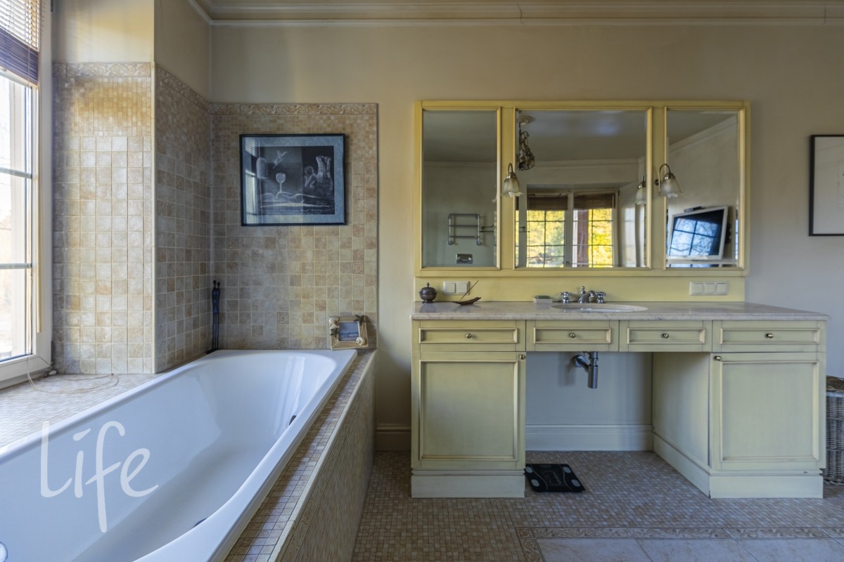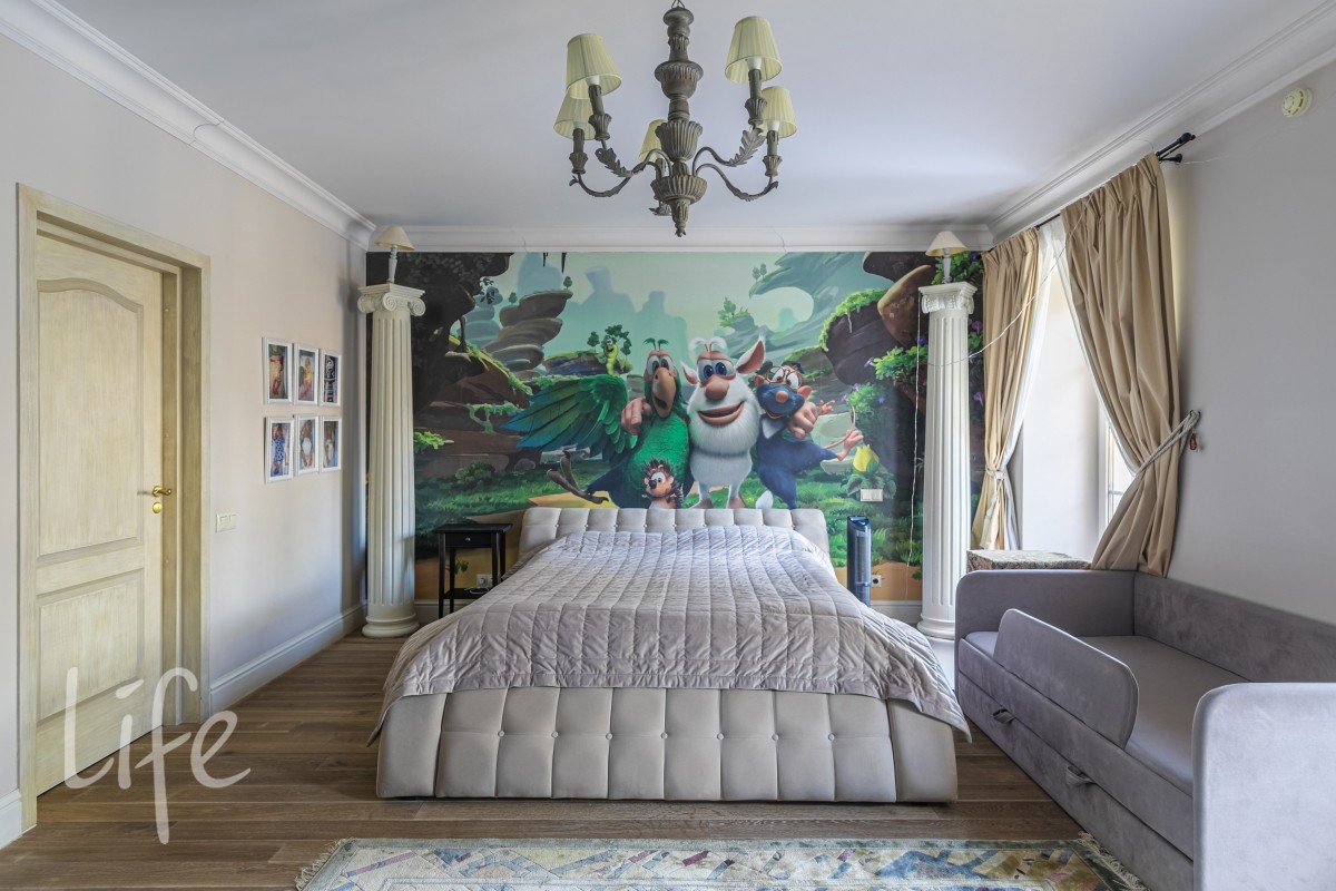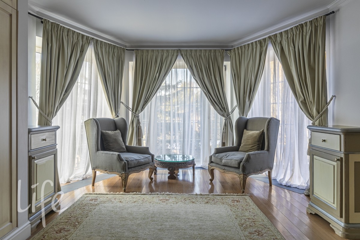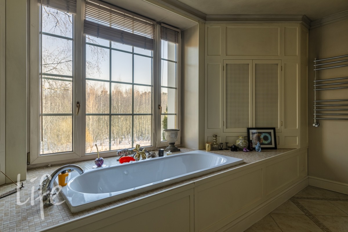 1 этаж: гостиная с итальянским мраморным камином, кухня, столовая, кабинет/библиотека с домашним кинотеатром, санузел. Окна в пол по всему периметру. Художественная роспись потолков и стен, пол-мрамор, старинная антикварная мебель, дорогие антикварные хрустальные люстры.