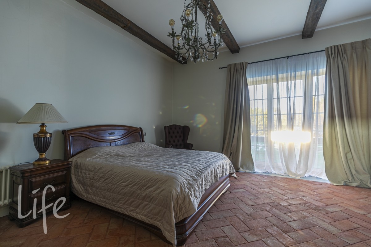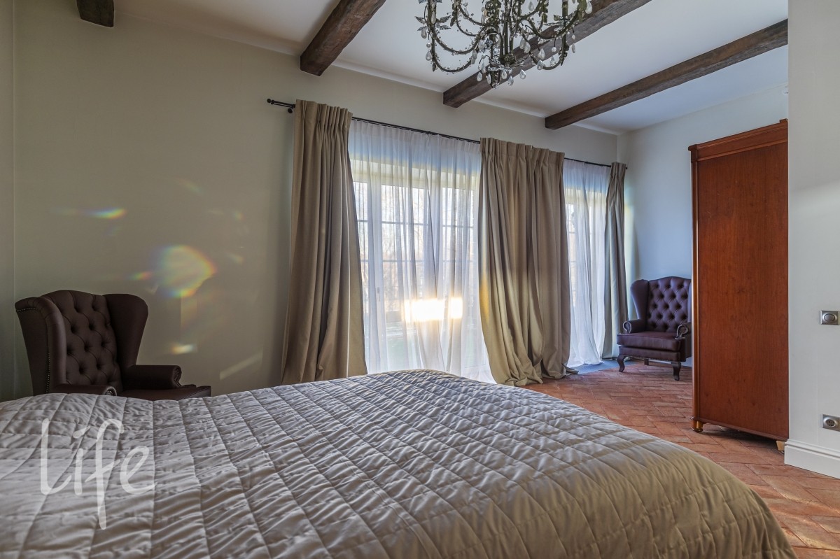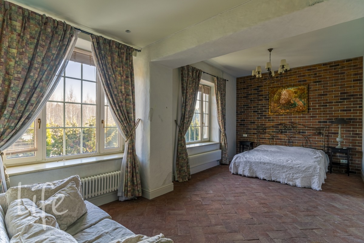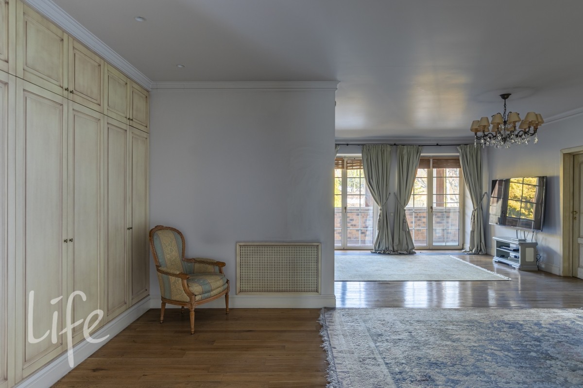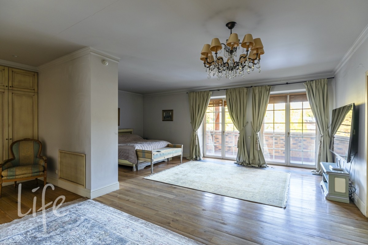 Master спальня 75 м2 с двумя с/у 16 и 17 м2, большой гардеробной и выходом на балкон 20м2 с видом на участок.