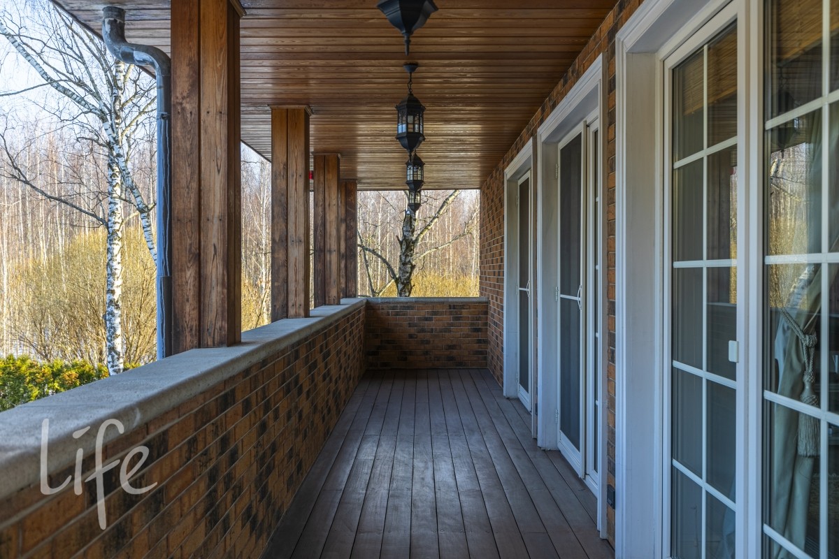 Общее для обеих спален патио 80м2 с потрясающим видом на участок и березовую рощу. Патио свободного назначения , правильной прямоугольной формы . Можно использовать как зону барбекью или для отдыха и загара . Можно застеклить и превратить в зимний сад или любая другая идея .