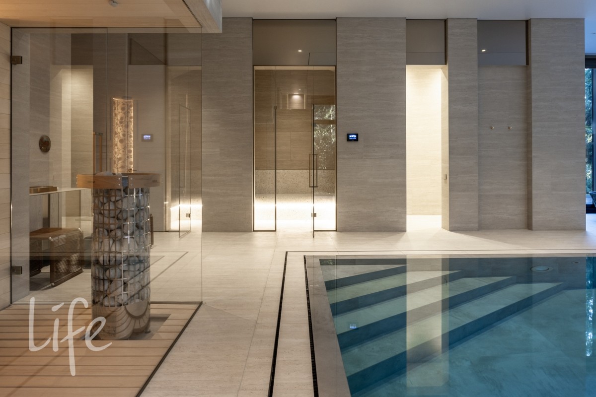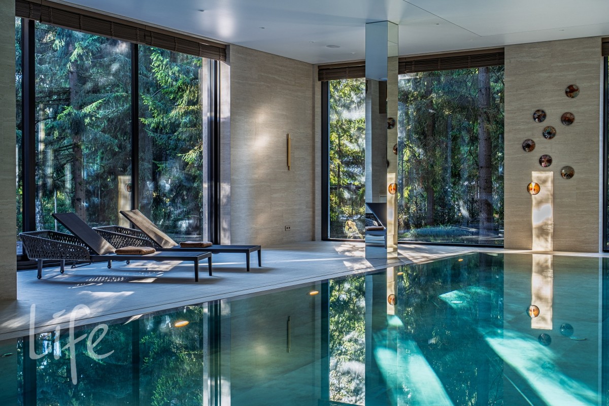 Акустика: встроенная акустическая система в основных зонах (гостиная, кухня, бассейн) для фоновой музыки.