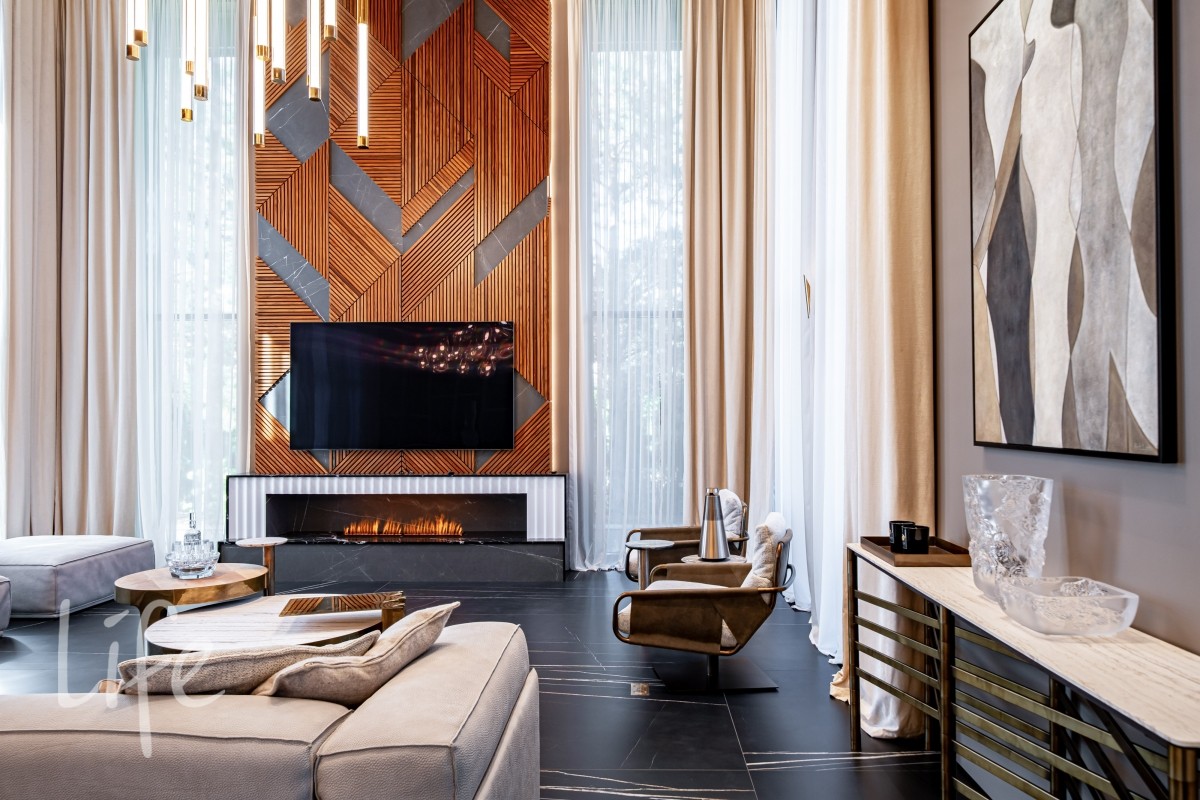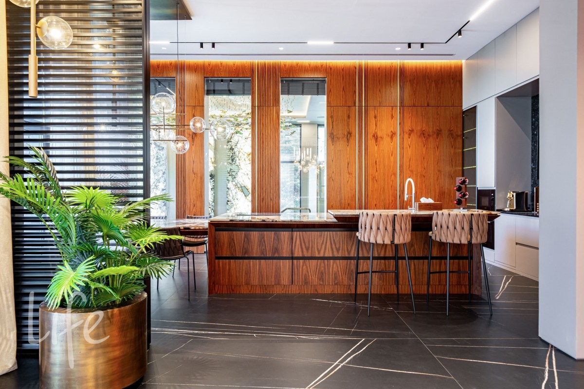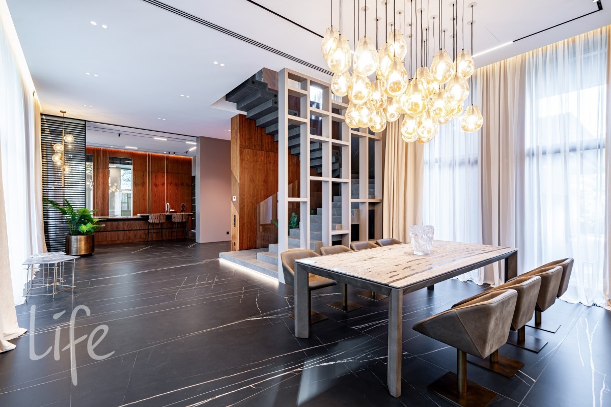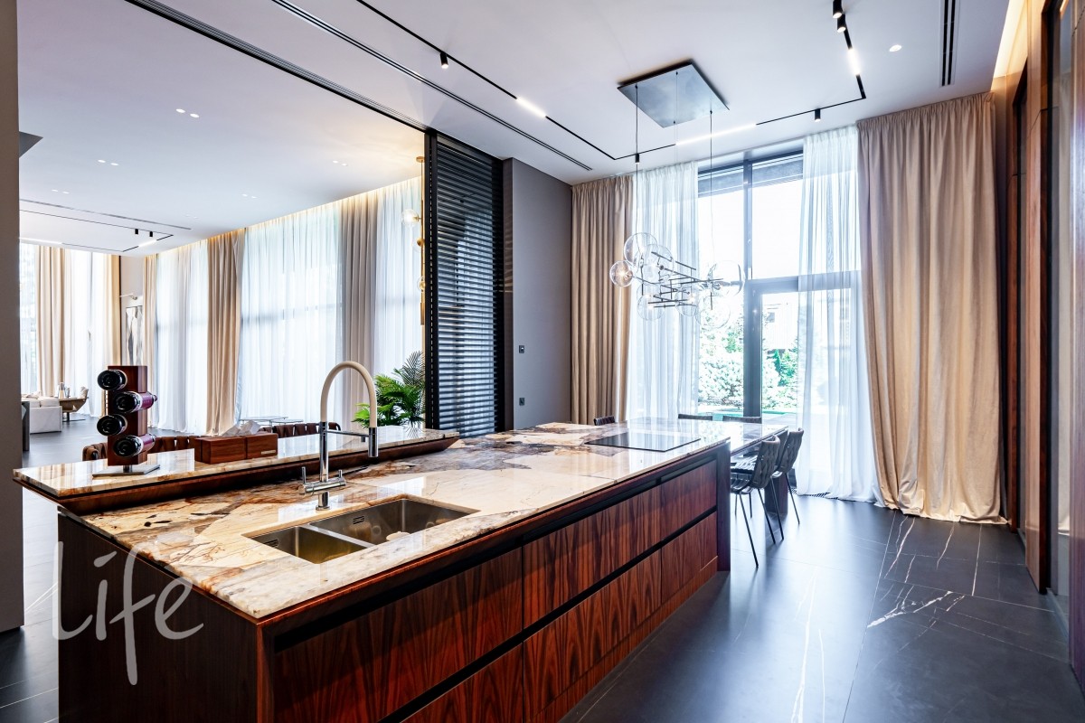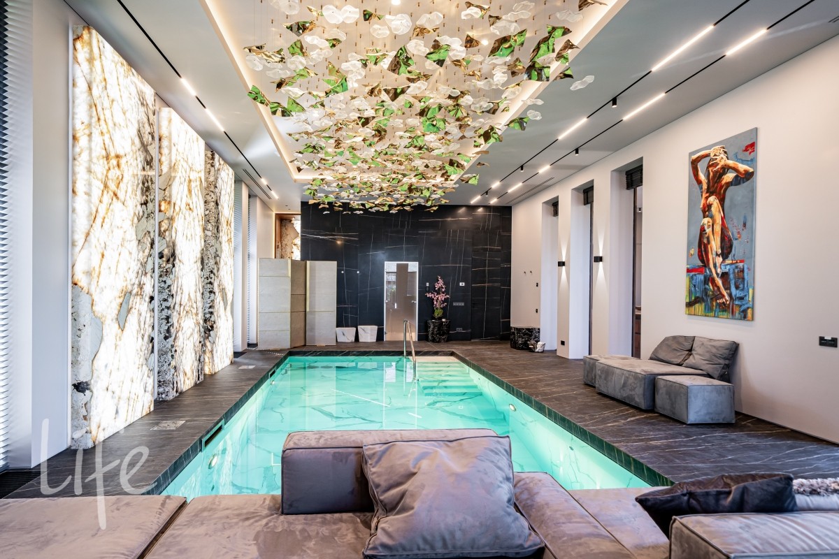 Современный интерьер продуман до мелочей, со вкусом подобрана мебель и предметы быта. Исключительно для собственного проживания, не на продажу. Мебель от таких компаний, как португальская Frato, итальянская Henge. Сантехника — от итальянских брендов CEA и Antonio Lupi. Продвинутое освещение — люстры и светильники от компании «Центрсвет», итальянских брендов. Для отделки столешницы кухни, бассейна и санузла выбран благородный кварцит. Бытовая техника премиум-класса: Samsung, Bosch.