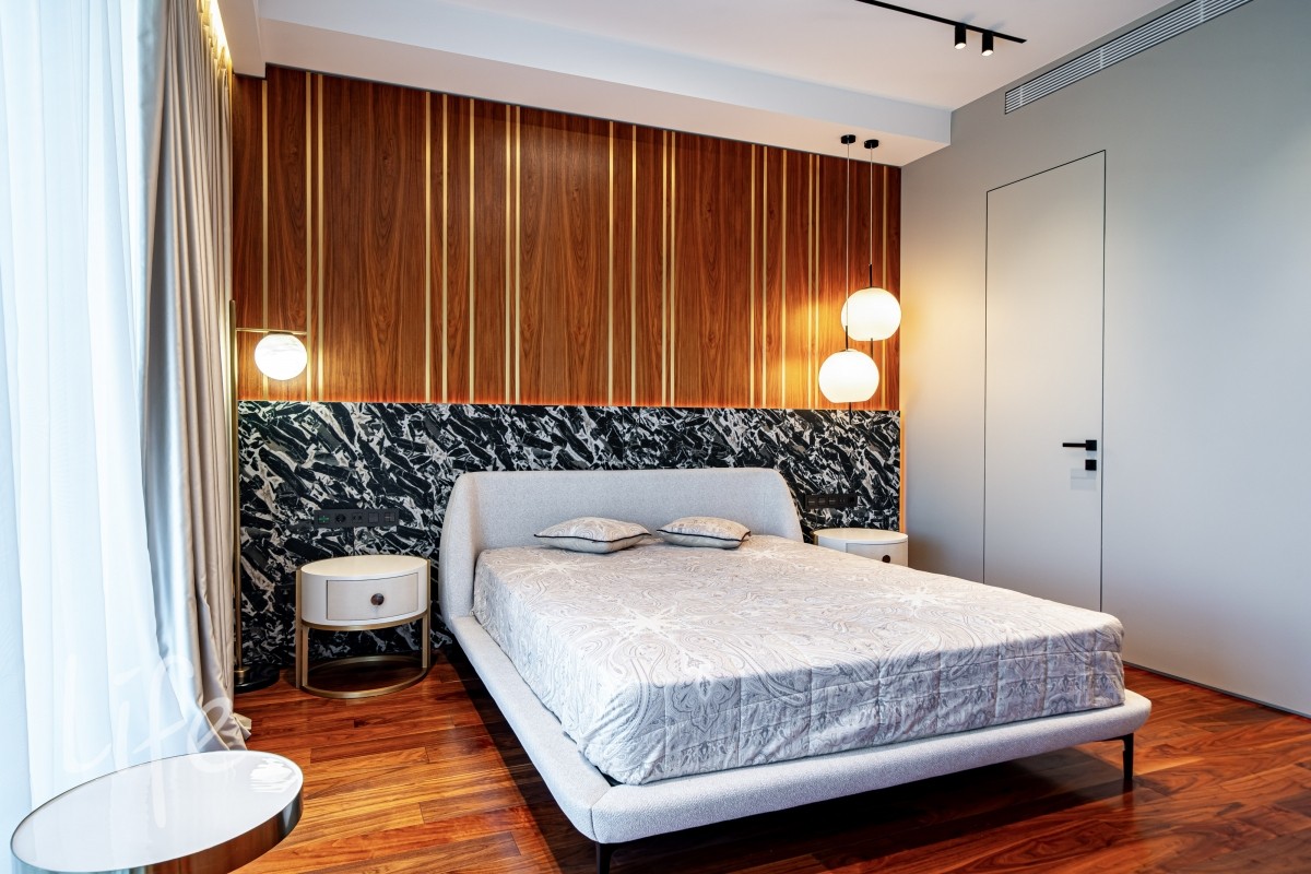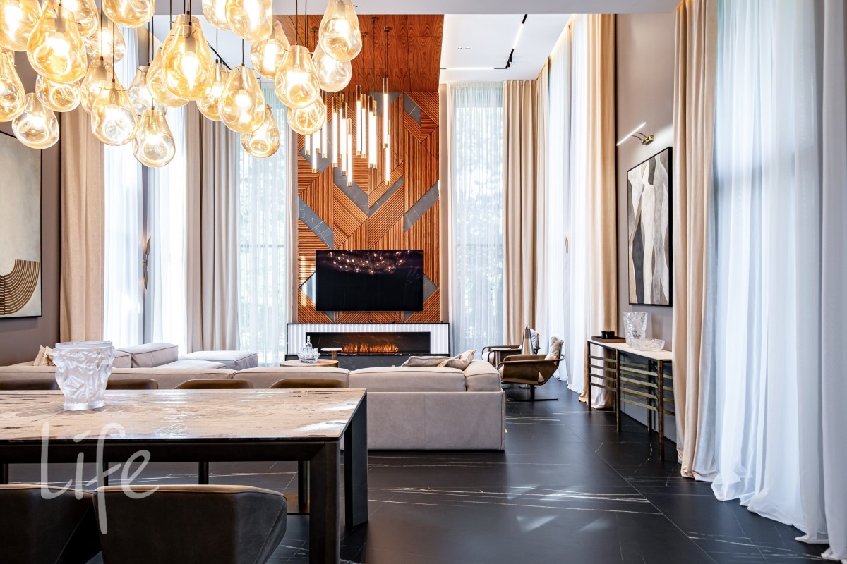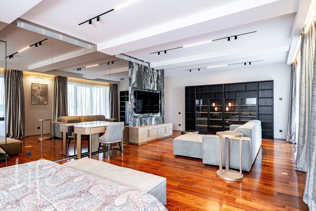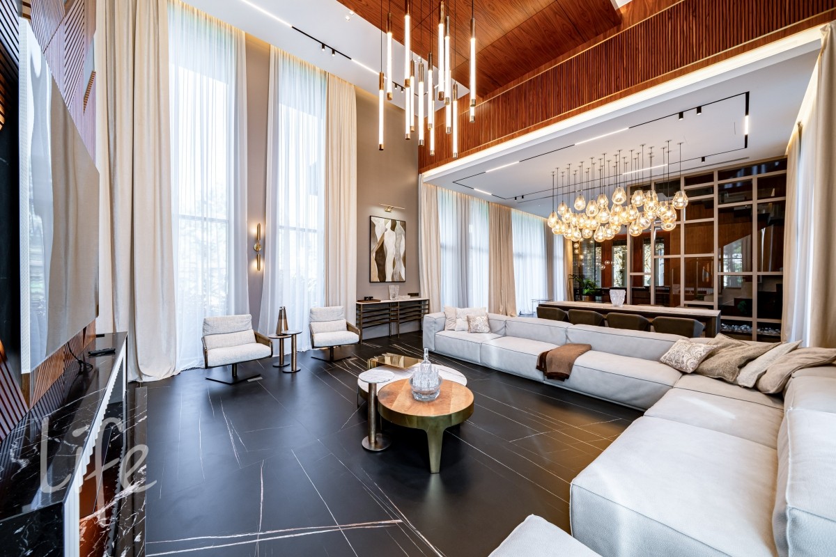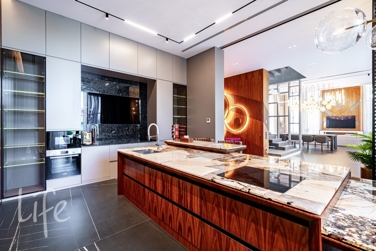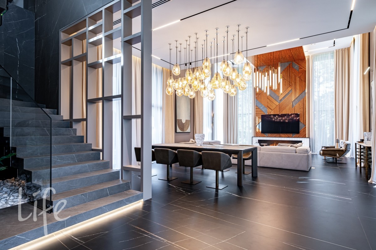 Современный интерьер продуман до мелочей, со вкусом подобрана мебель и предметы быта. Исключительно для собственного проживания, не на продажу. Мебель от таких компаний, как португальская Frato, итальянская Henge. Сантехника — от итальянских брендов CEA и Antonio Lupi. Продвинутое освещение — люстры и светильники от компании «Центрсвет», итальянских брендов. Для отделки столешницы кухни, бассейна и санузла выбран благородный кварцит. Бытовая техника премиум-класса: Samsung, Bosch.
