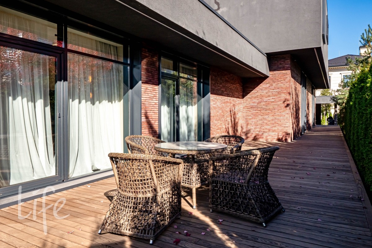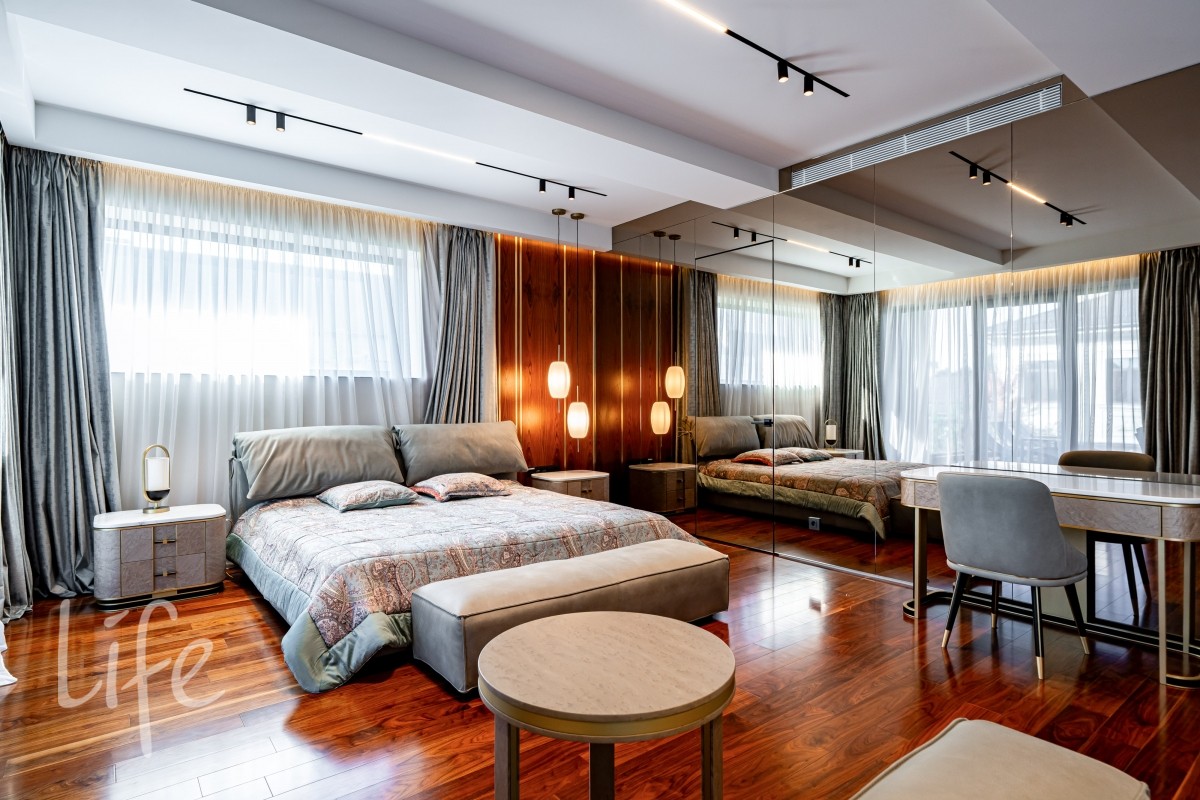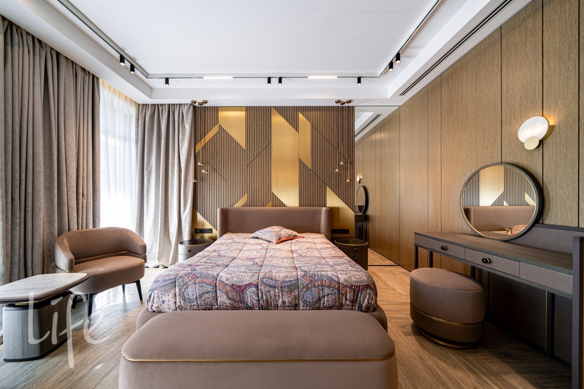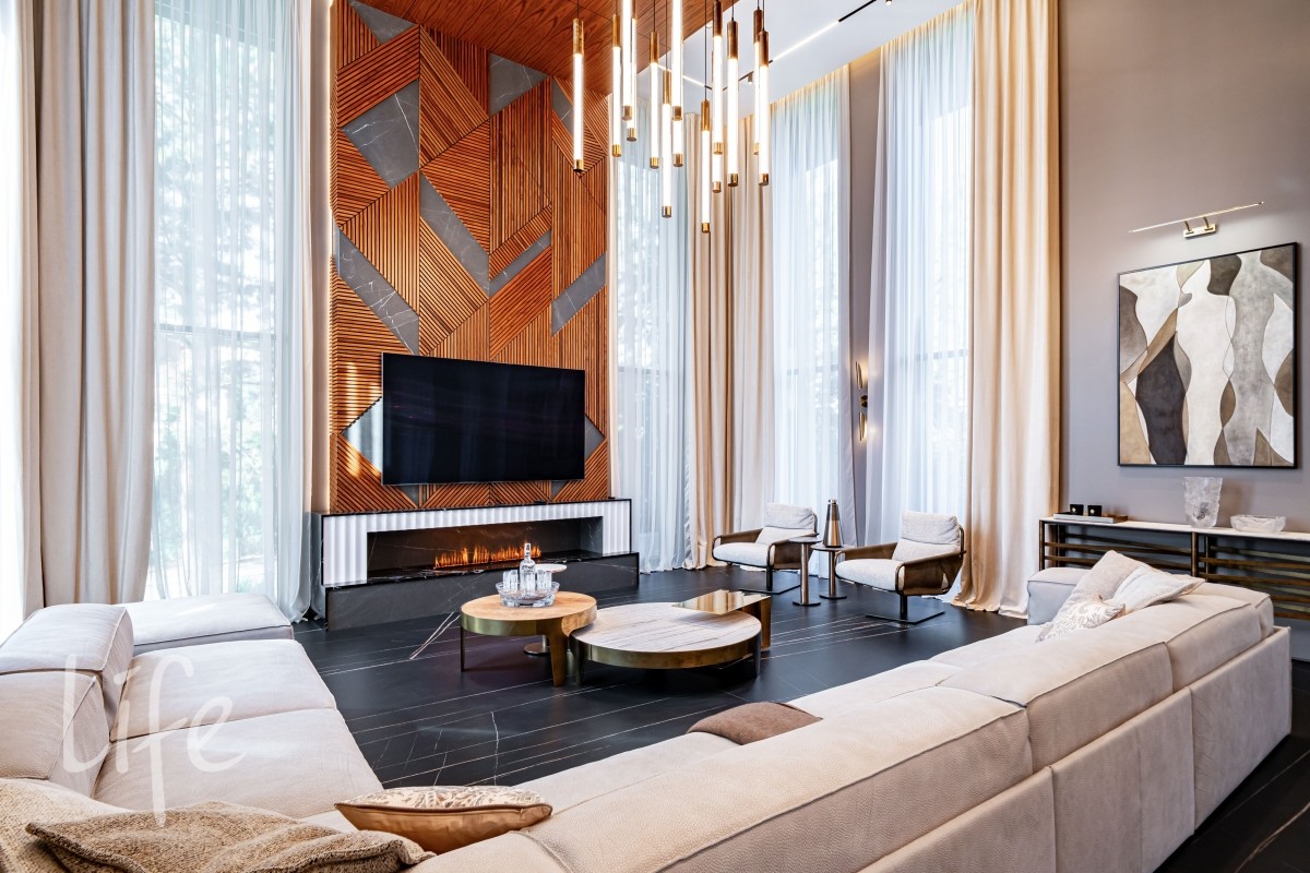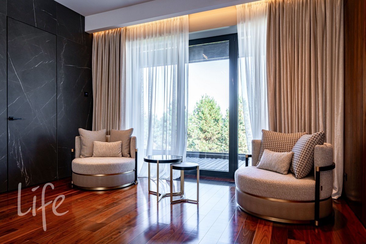 Современный интерьер продуман до мелочей, со вкусом подобрана мебель и предметы быта. Исключительно для собственного проживания, не на продажу. Мебель от таких компаний, как португальская Frato, итальянская Henge. Сантехника — от итальянских брендов CEA и Antonio Lupi. Продвинутое освещение — люстры и светильники от компании «Центрсвет», итальянских брендов. Для отделки столешницы кухни, бассейна и санузла выбран благородный кварцит. Бытовая техника премиум-класса: Samsung, Bosch.