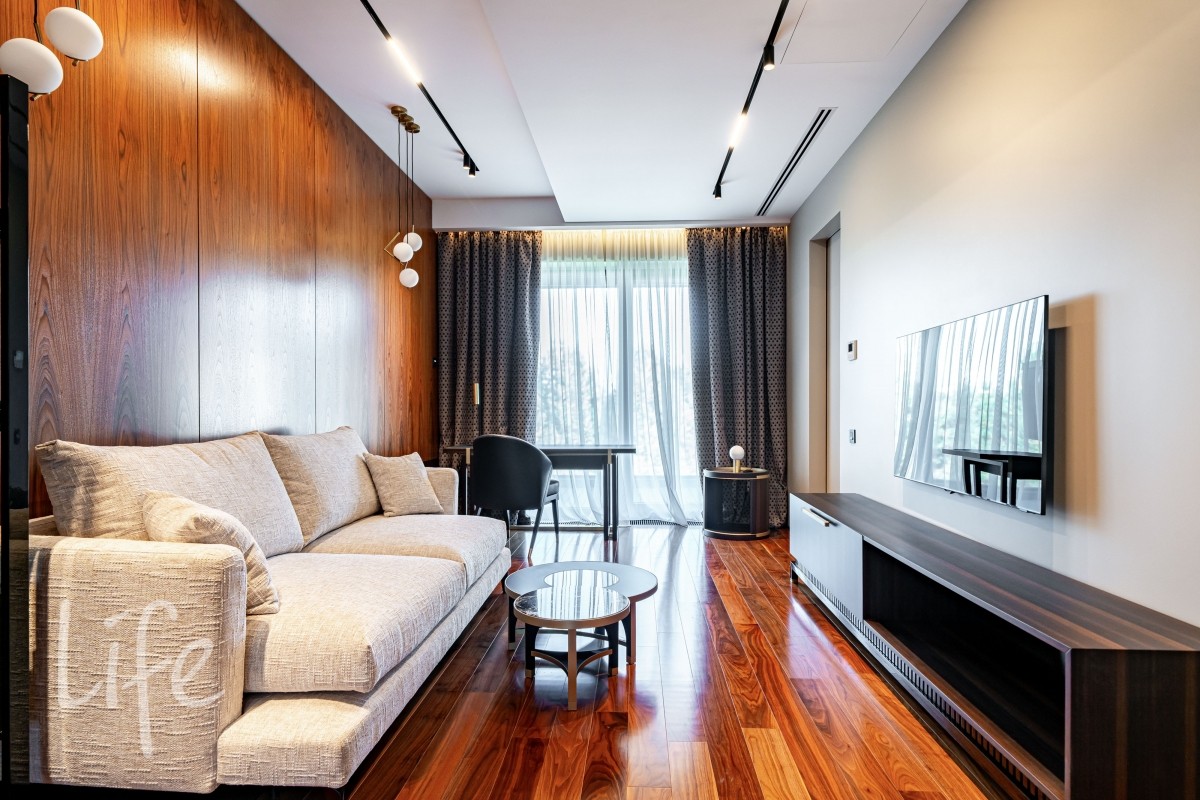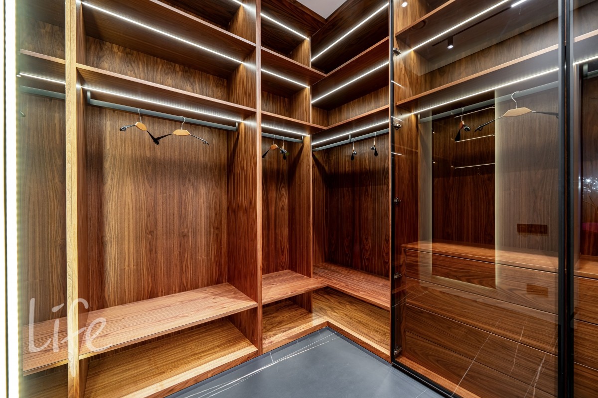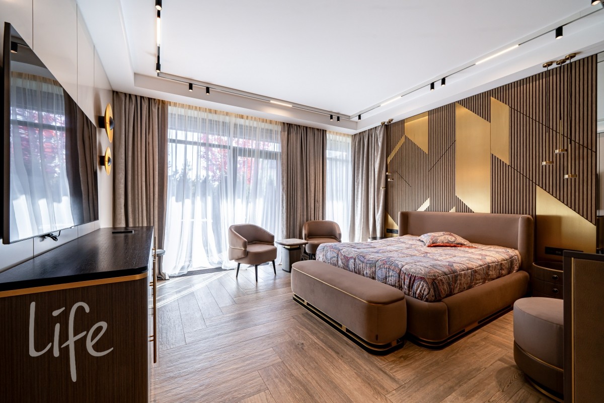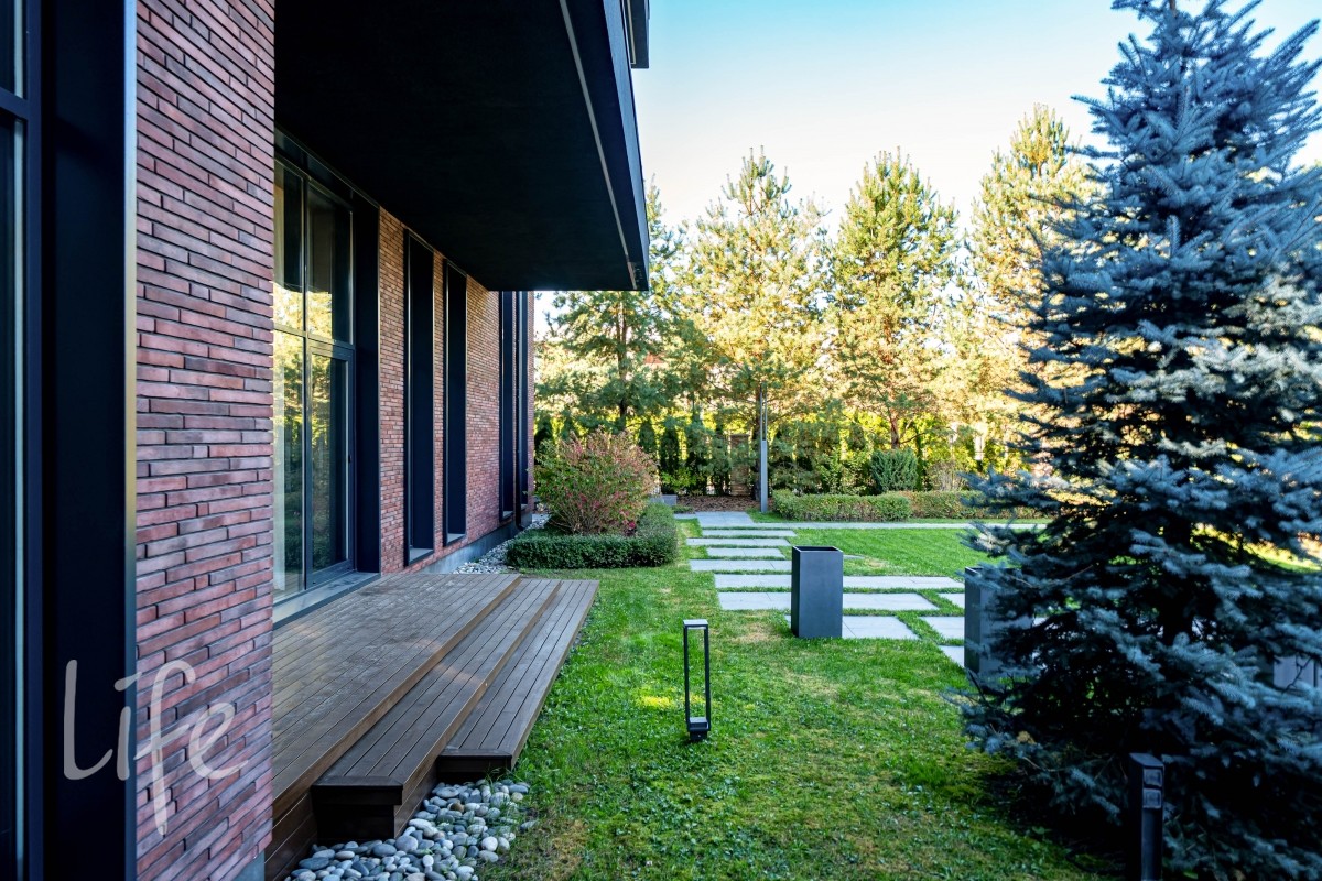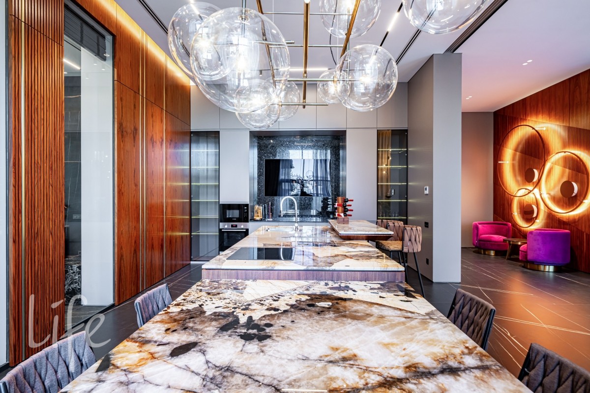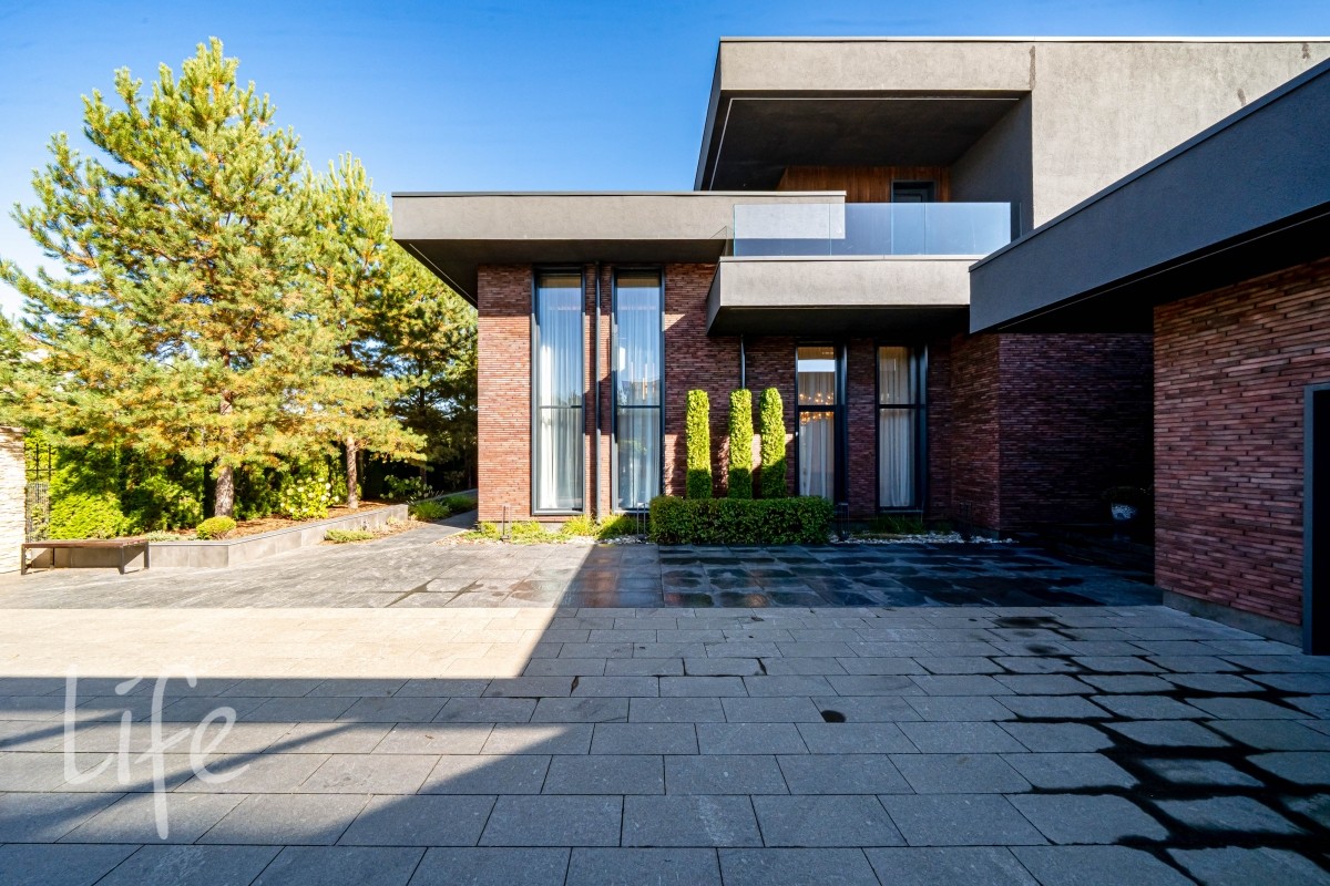 Современный интерьер продуман до мелочей, со вкусом подобрана мебель и предметы быта. Исключительно для собственного проживания, не на продажу. Мебель от таких компаний, как португальская Frato, итальянская Henge. Сантехника — от итальянских брендов CEA и Antonio Lupi. Продвинутое освещение — люстры и светильники от компании «Центрсвет», итальянских брендов. Для отделки столешницы кухни, бассейна и санузла выбран благородный кварцит. Бытовая техника премиум-класса: Samsung, Bosch.