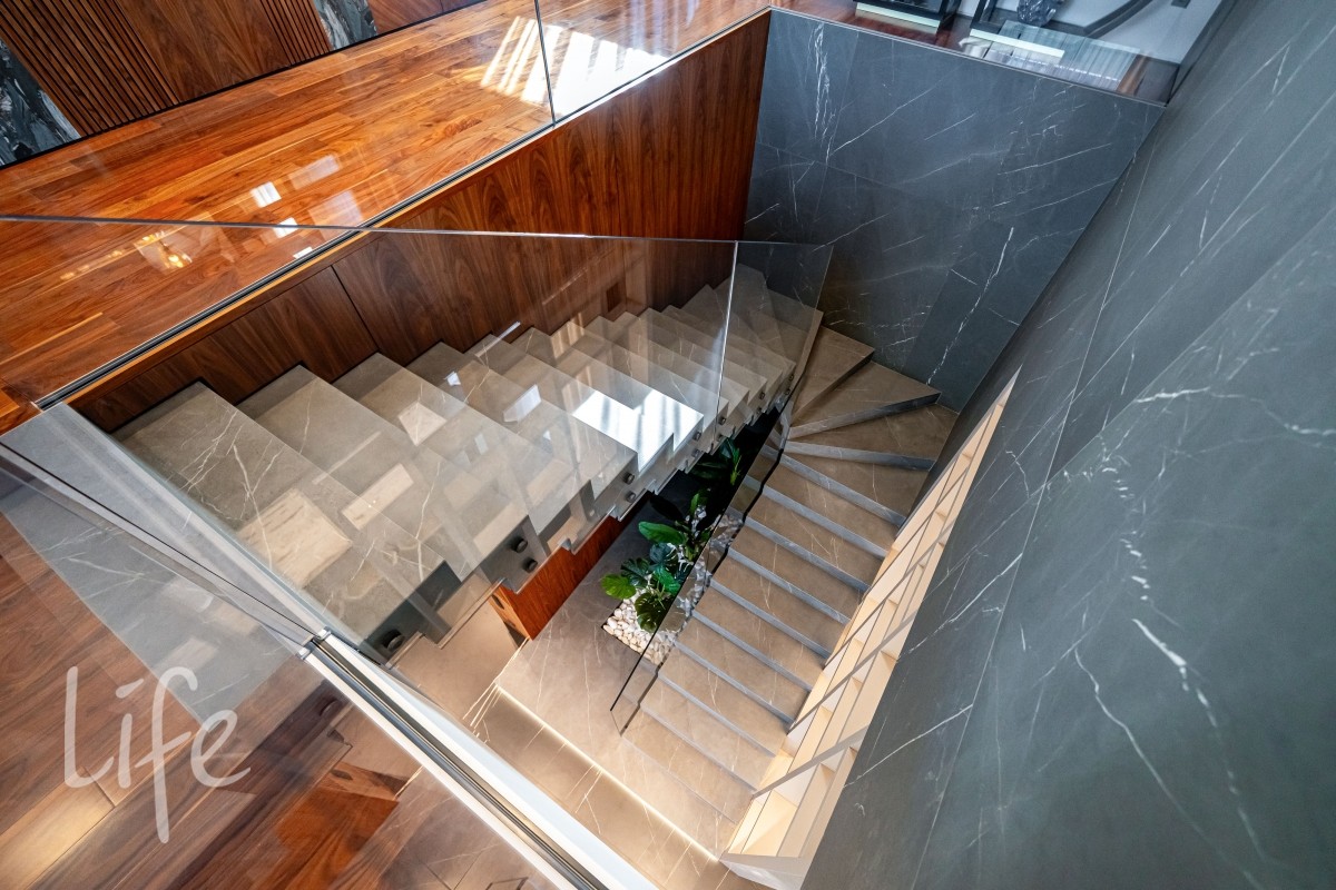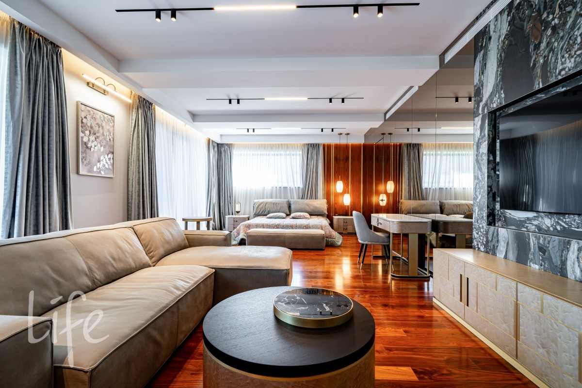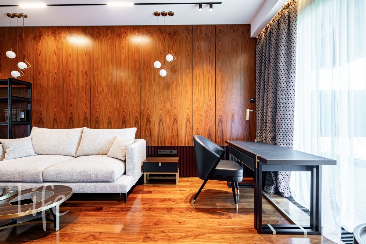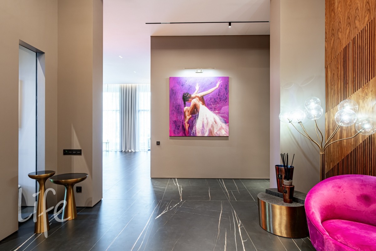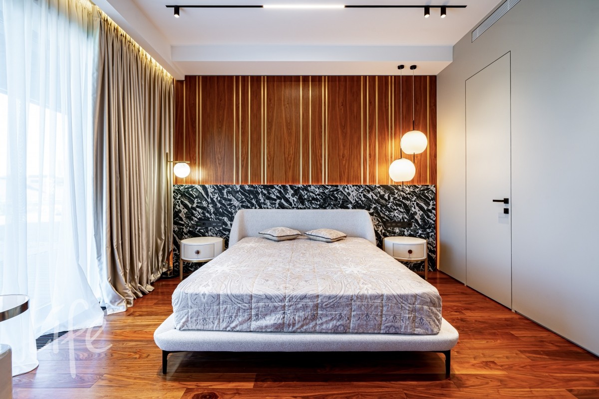 Современный интерьер продуман до мелочей, со вкусом подобрана мебель и предметы быта. Исключительно для собственного проживания, не на продажу. Мебель от таких компаний, как португальская Frato, итальянская Henge. Сантехника — от итальянских брендов CEA и Antonio Lupi. Продвинутое освещение — люстры и светильники от компании «Центрсвет», итальянских брендов. Для отделки столешницы кухни, бассейна и санузла выбран благородный кварцит. Бытовая техника премиум-класса: Samsung, Bosch.