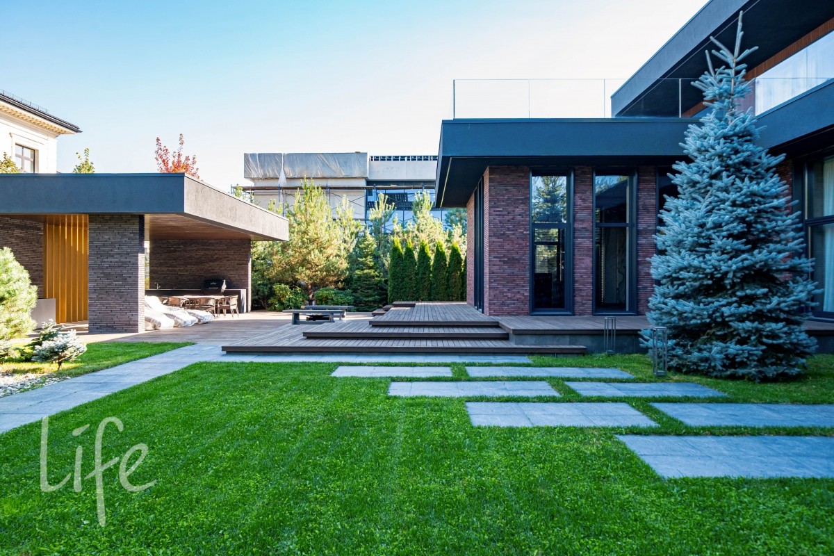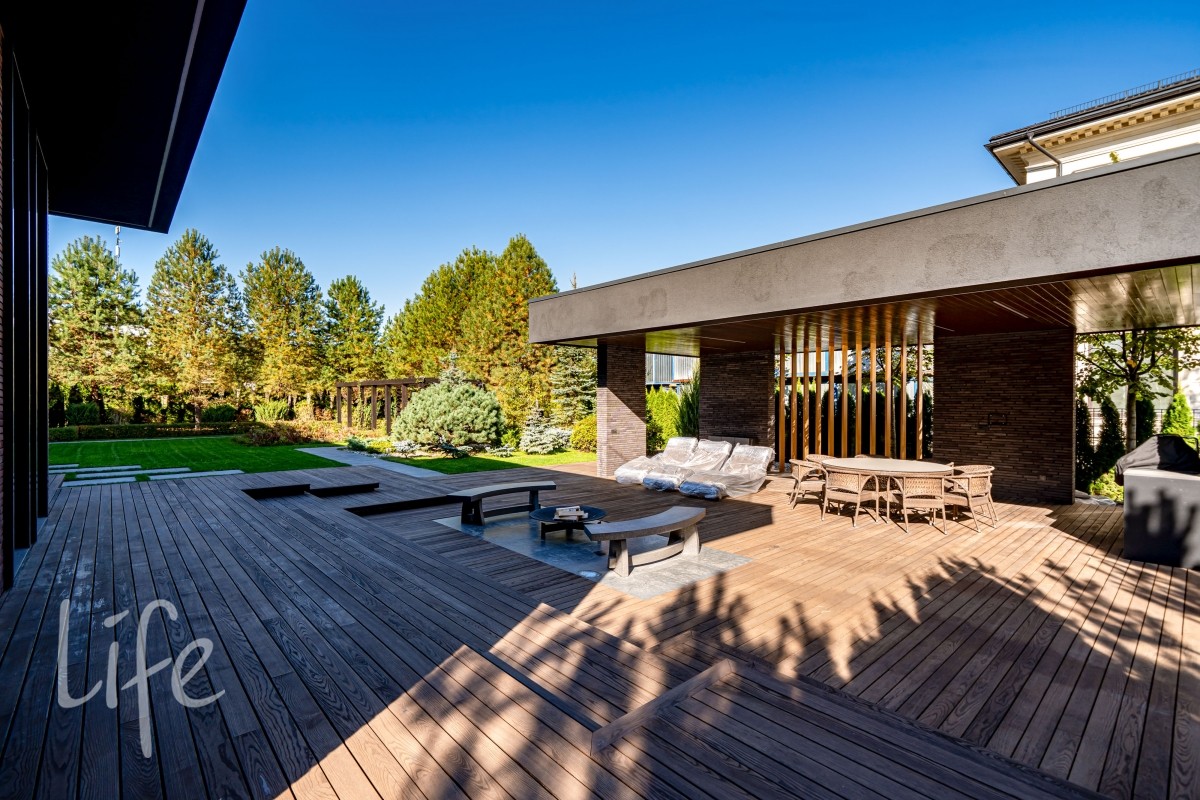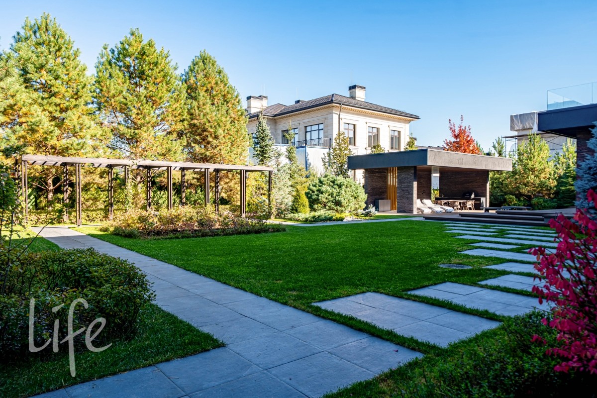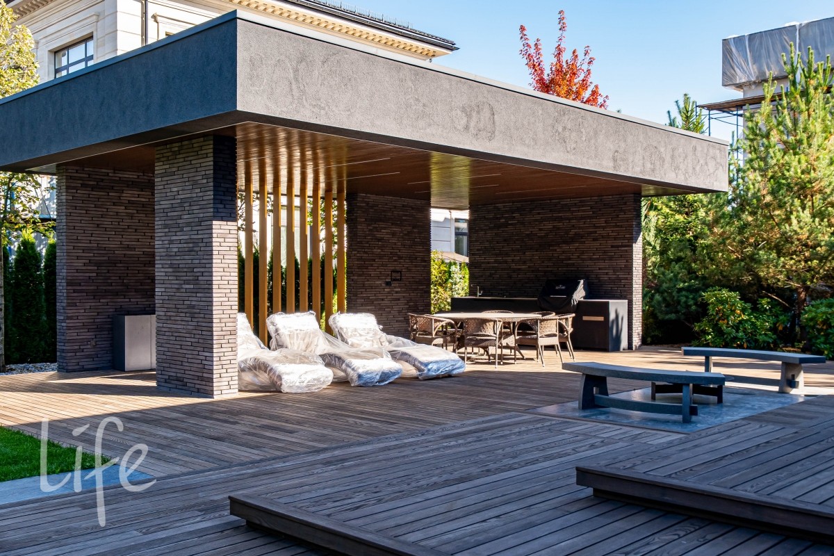 Участок правильной прямоугольной формы, выполнен ландшафтный дизайн. На территории расположены беседка, барбекю, уличная кухня оснащена техникой Bosch, грилем Napoleon, холодильником, посудомоечной машиной и грилем, навес на три автомобиля.