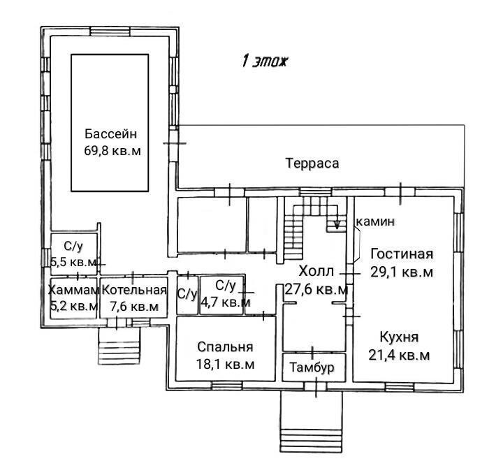 1 этаж: холл-прихожая, кухня-столовая-гостиная с выходом на террасу, гостевая комната, 2 гардеробных, SPA зона с бассейном и хаммамом и выходом на участок, 2 с/у, прачечная, котельная.