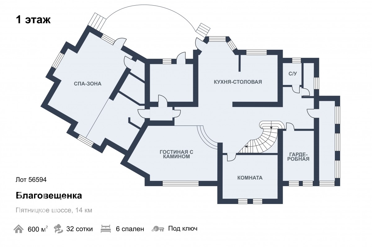 1й этаж: кладовка, с/у, прихожая, просторная гардеробная комната с окном, кинозал/комната, зал-гостиная с камином, кухня-столовая с выходом на веранду, спа-зона с сауной и джакузи с выходом на открытую веранду, котельная.