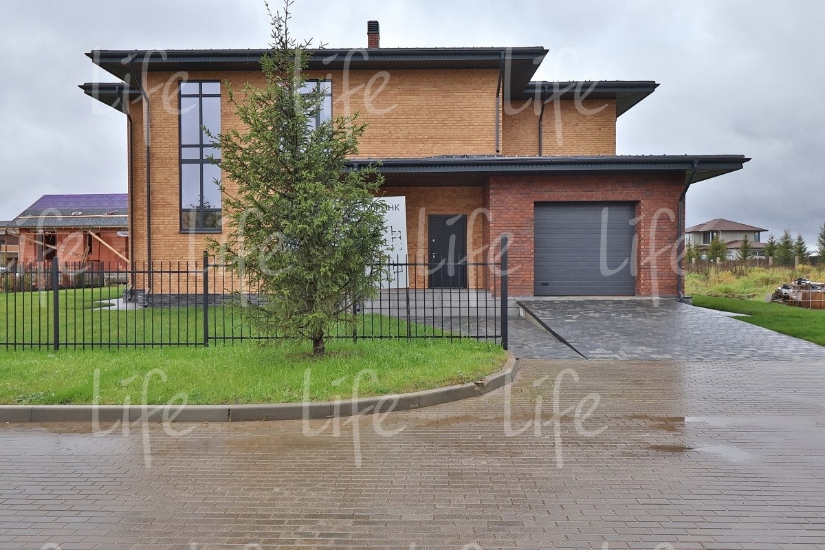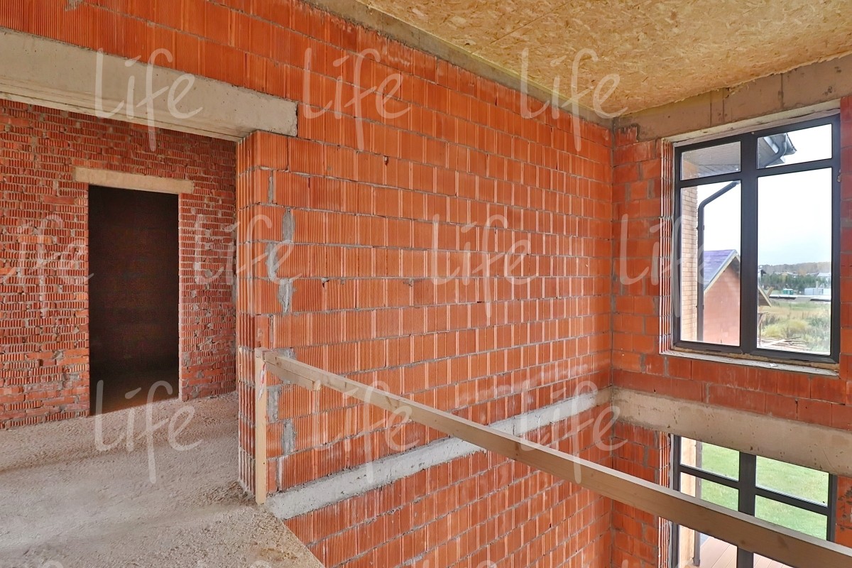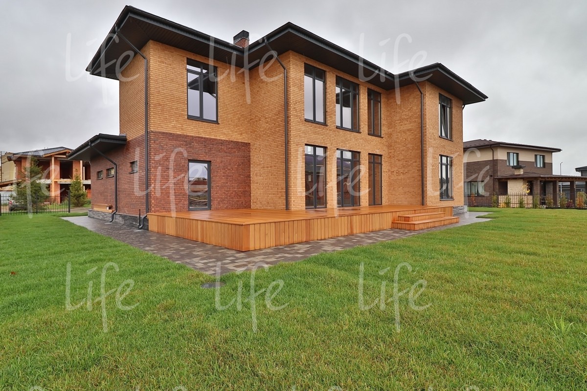 Конструктив: монолитный фундамент и межэтажные перекрытия, стены — керамический блок Porotherm с облицовкой кирпичом премиальной коллекции, 5-камерные окна с двухсторонней ламинацией, мягкая кровля, терраса — натуральная лиственница.