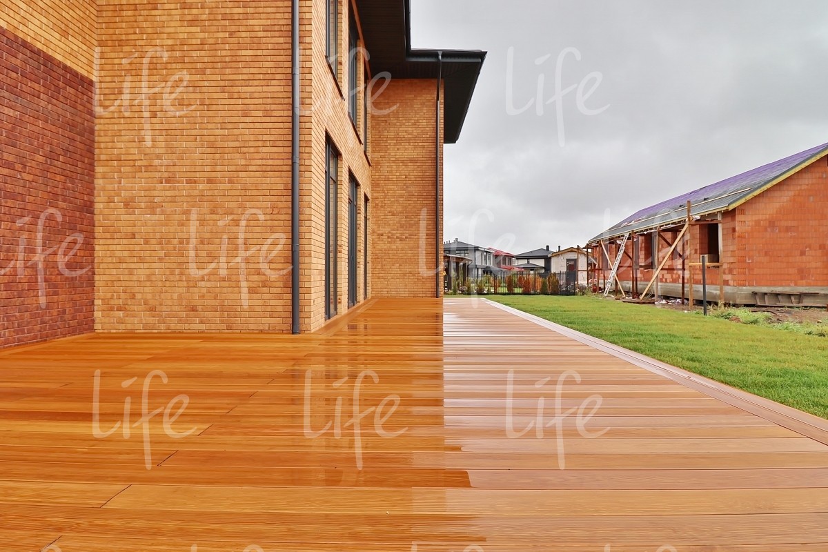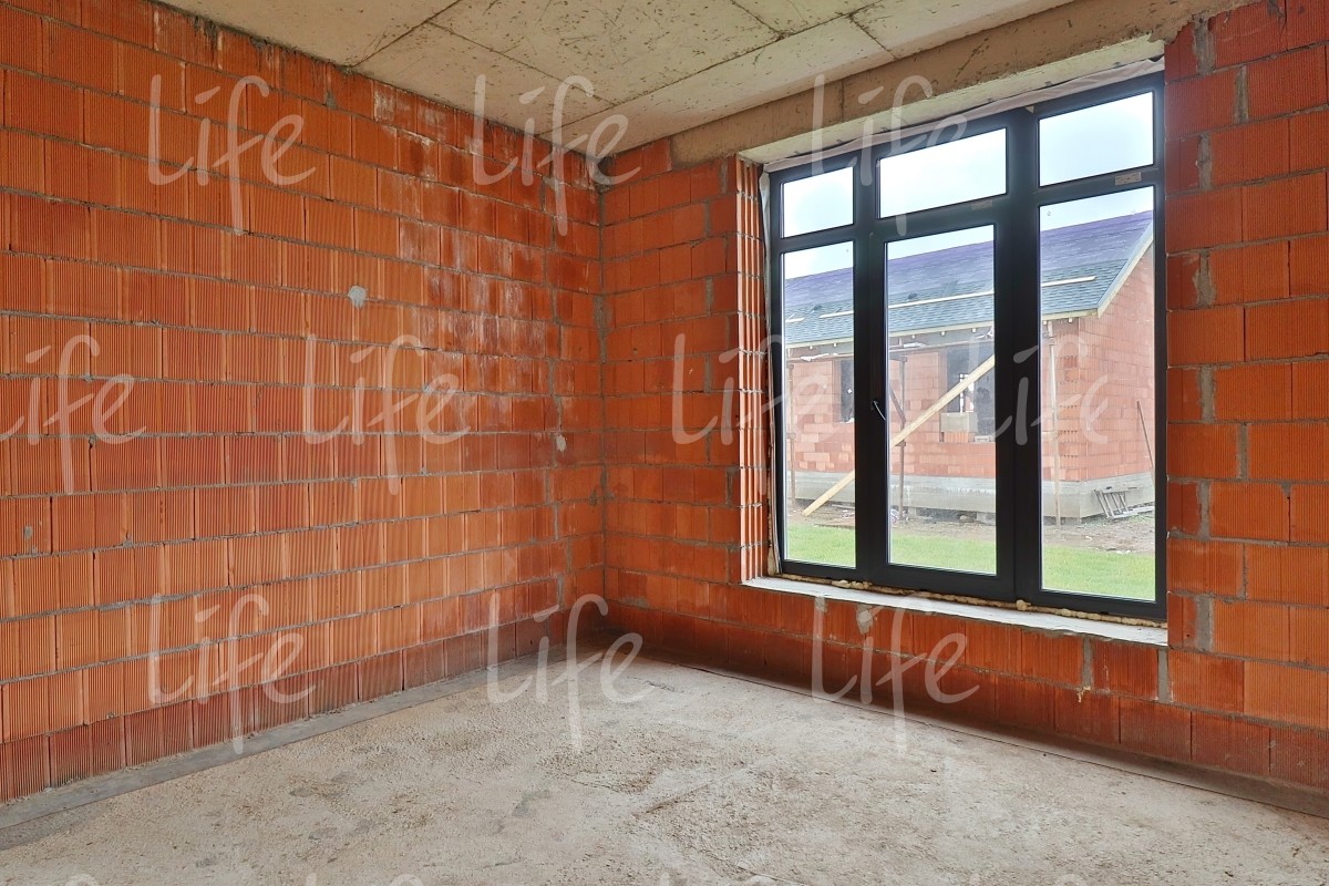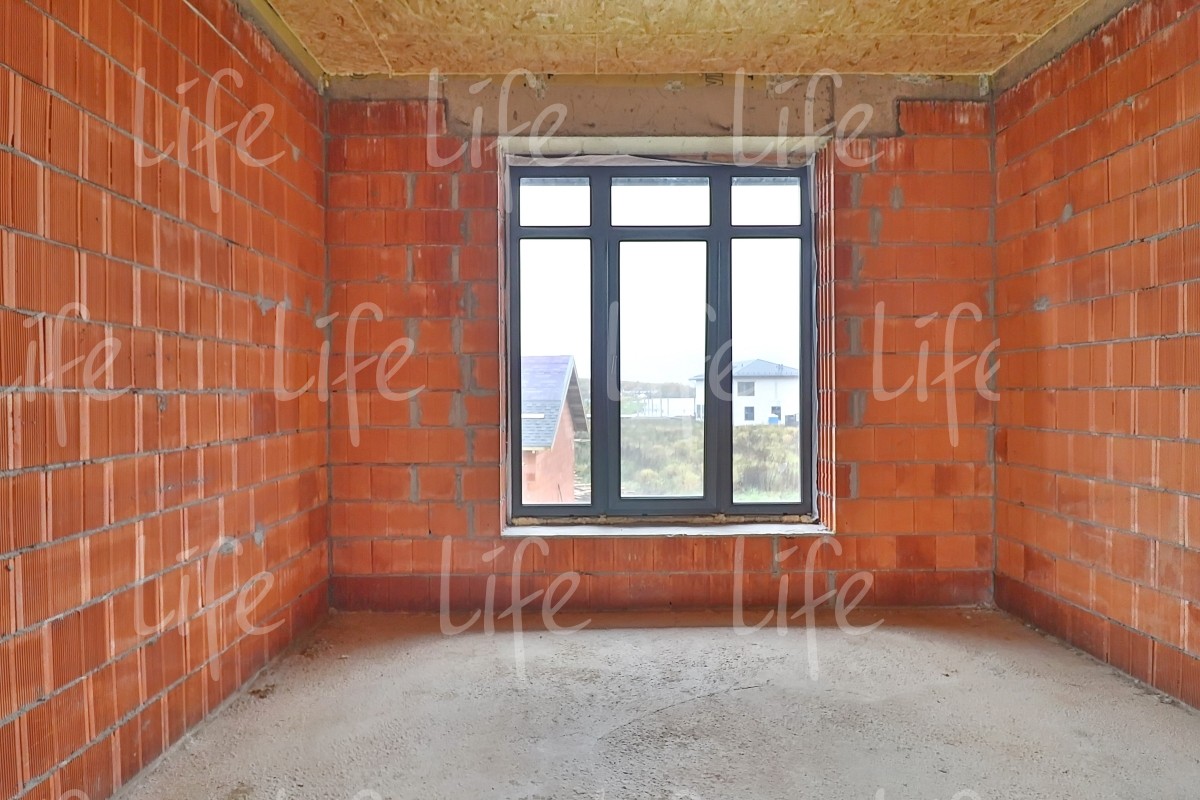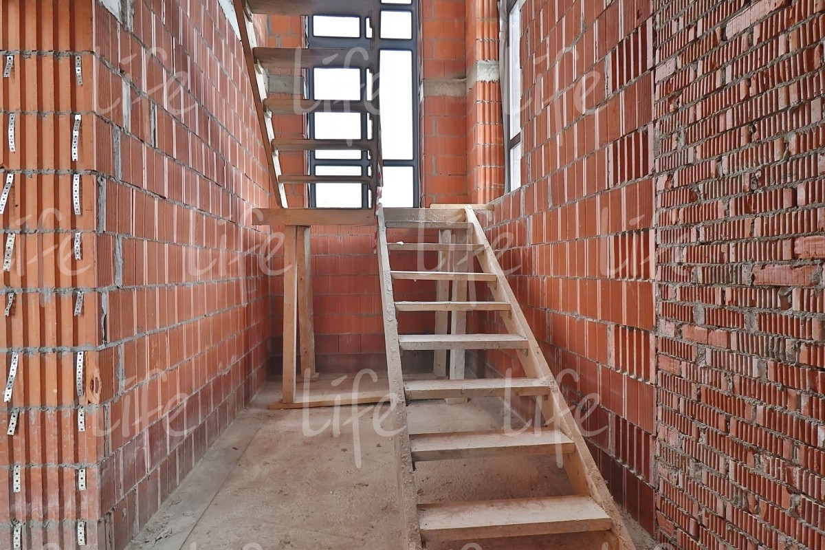 Конструктив: монолитный фундамент и межэтажные перекрытия, стены — керамический блок Porotherm с облицовкой кирпичом премиальной коллекции, 5-камерные окна с двухсторонней ламинацией, мягкая кровля, терраса — натуральная лиственница.