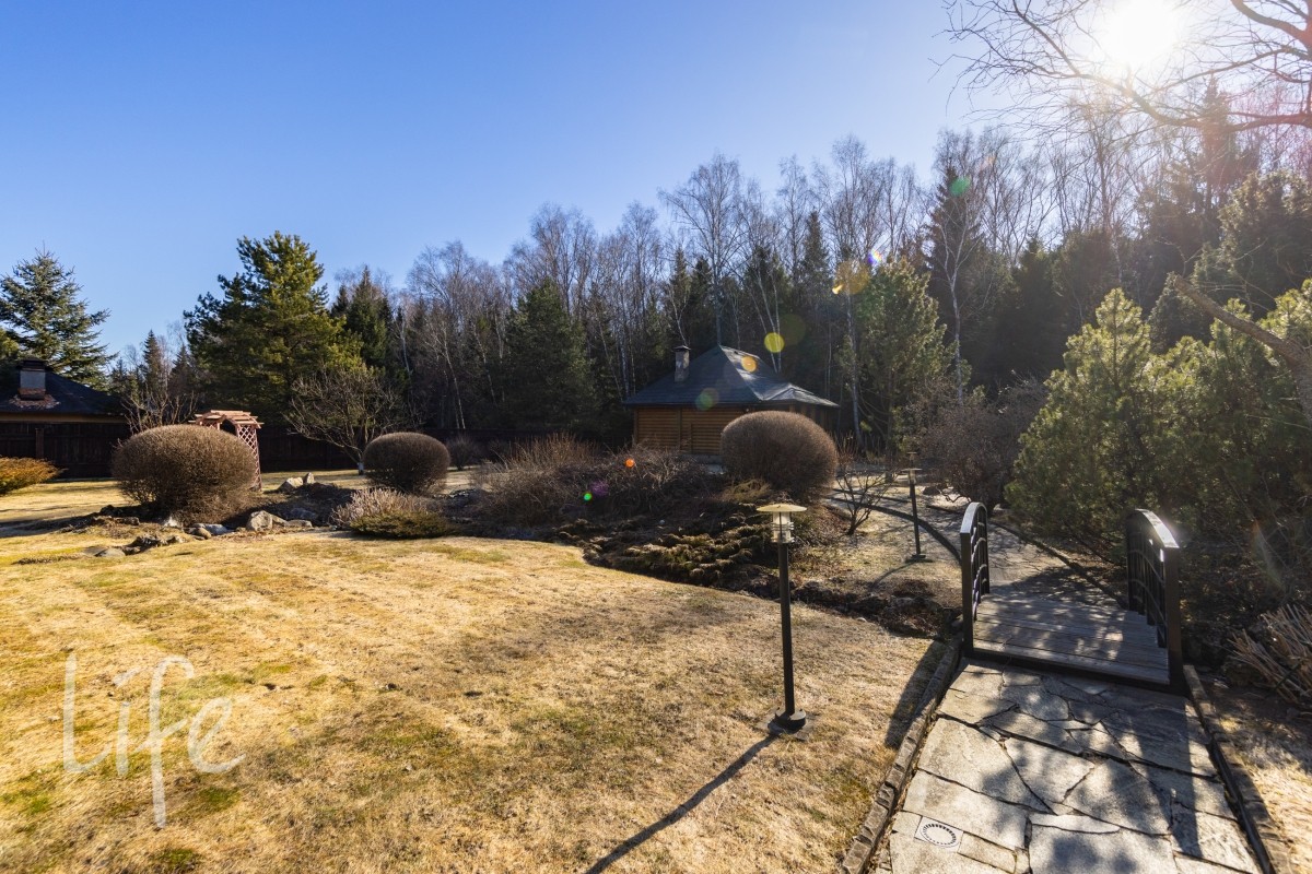 Участок имеет правильную прямоугольную форму и занимает площадь 58 соток. Из них 20 соток леса находятся в аренде на 49 лет. На участке проведены ландшафтные работы, высажены сосны. Также имеется беседка в японском стиле и рукотворный фэн-шуй ручей. По всему участку проложена система дренажа и автоматического полива.