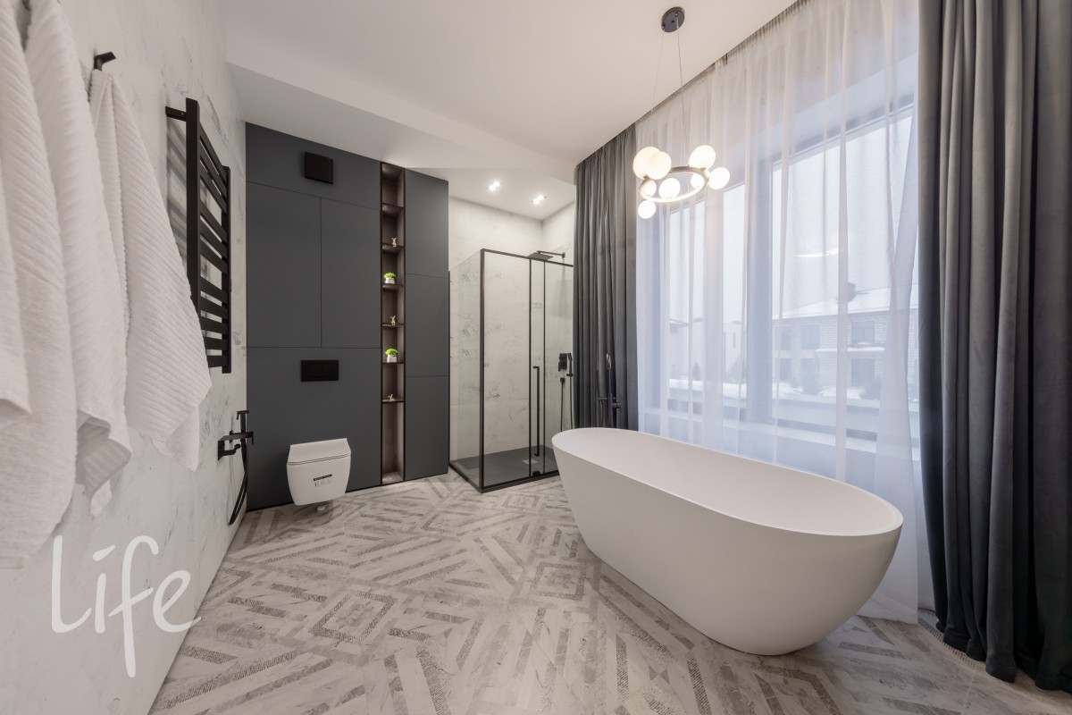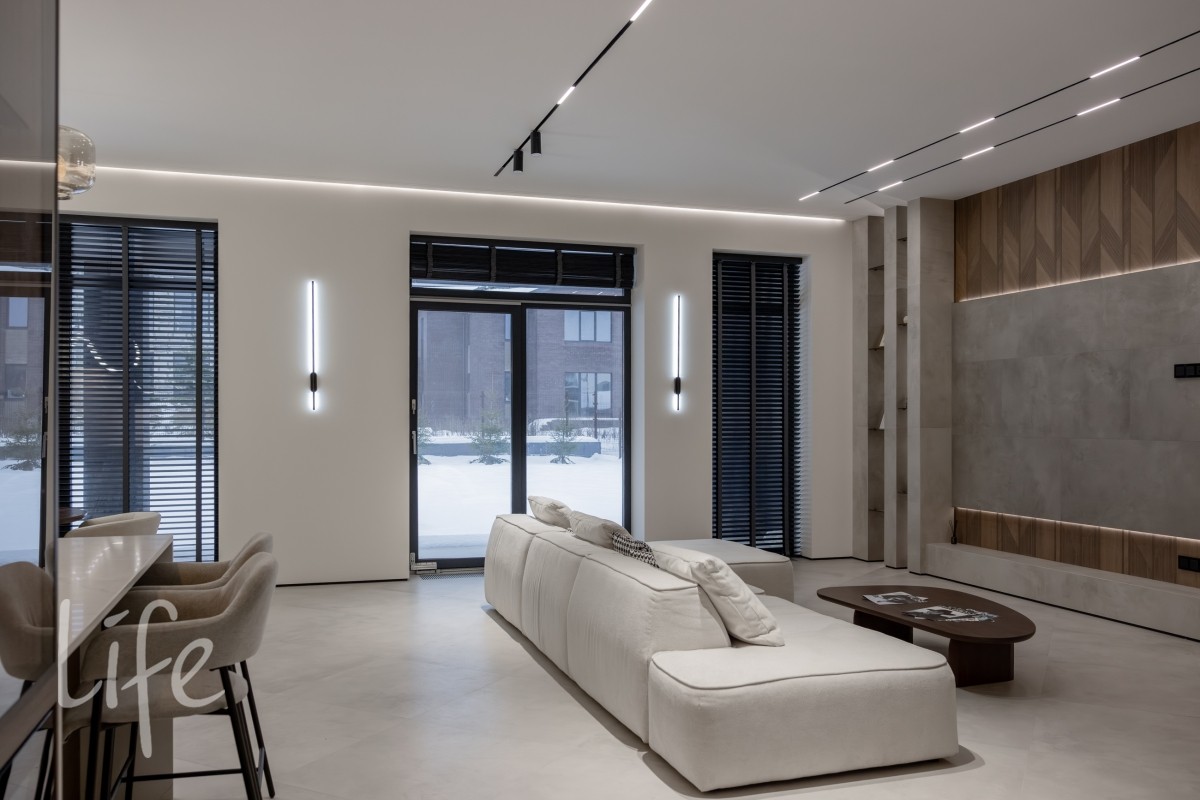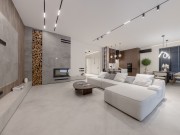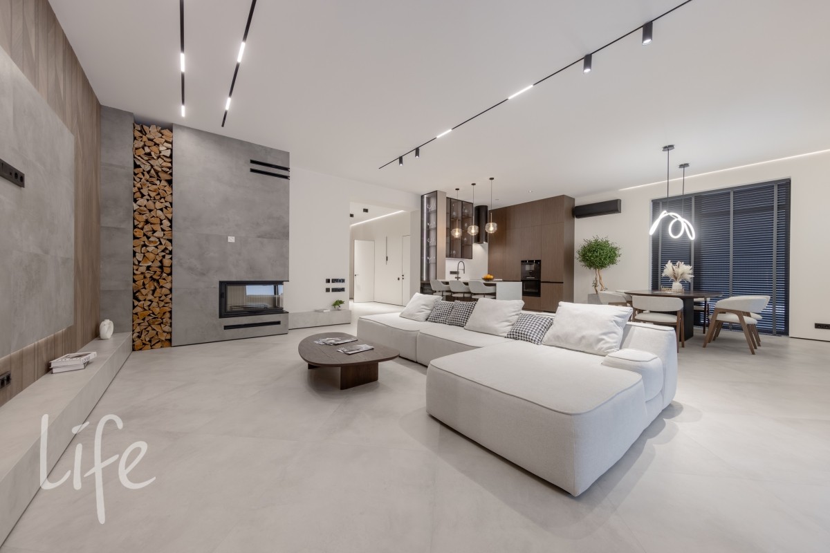 Готовность дома под ключ, декабрь месяц, последние штрихи в отделке. Предлагаем новый, меблированный дом, готовый к заселению. В его основе лежит утепленная шведская плита, а перекрытия выполнены из монолитного бетона. Стены выполнены из керамического блока с дополнительным утеплением, крыша — плоская. Фасад дома оштукатурен и окрашен, с элементами из деревянного планкена.