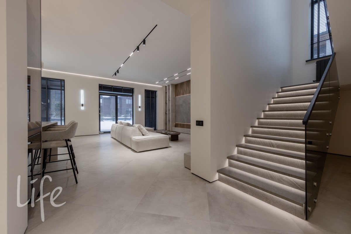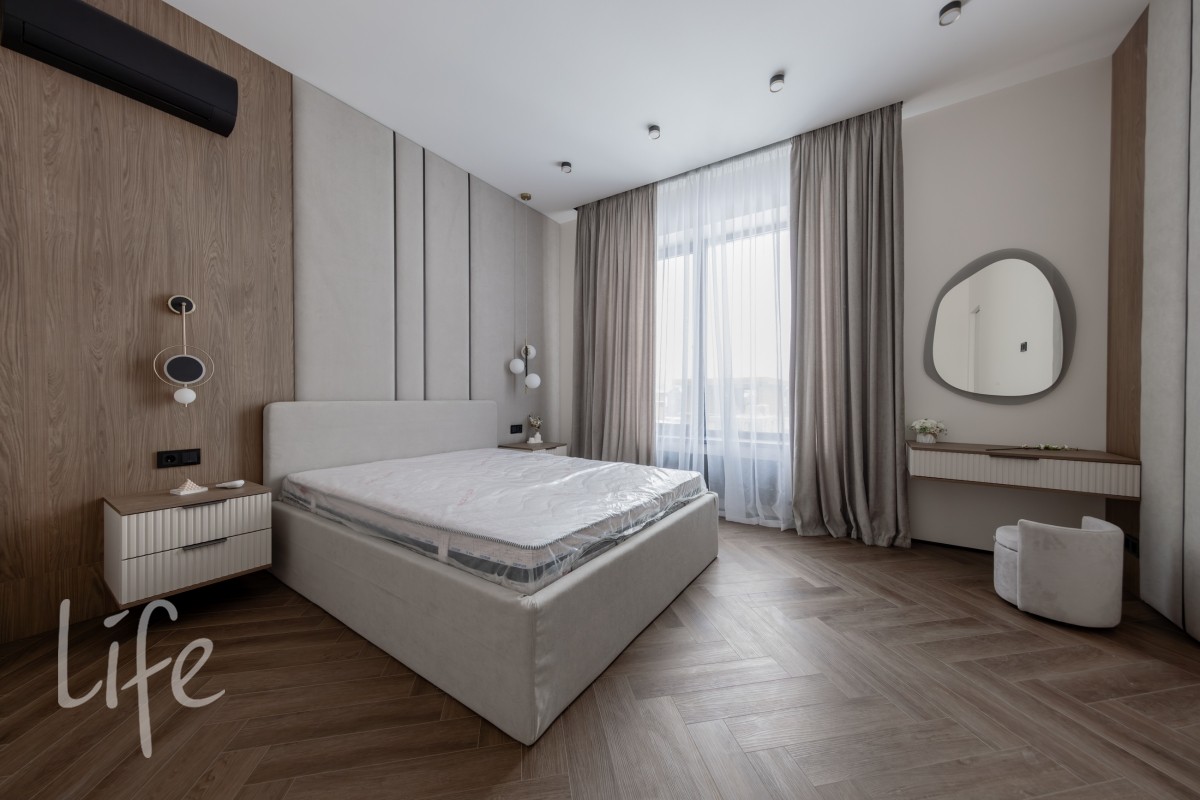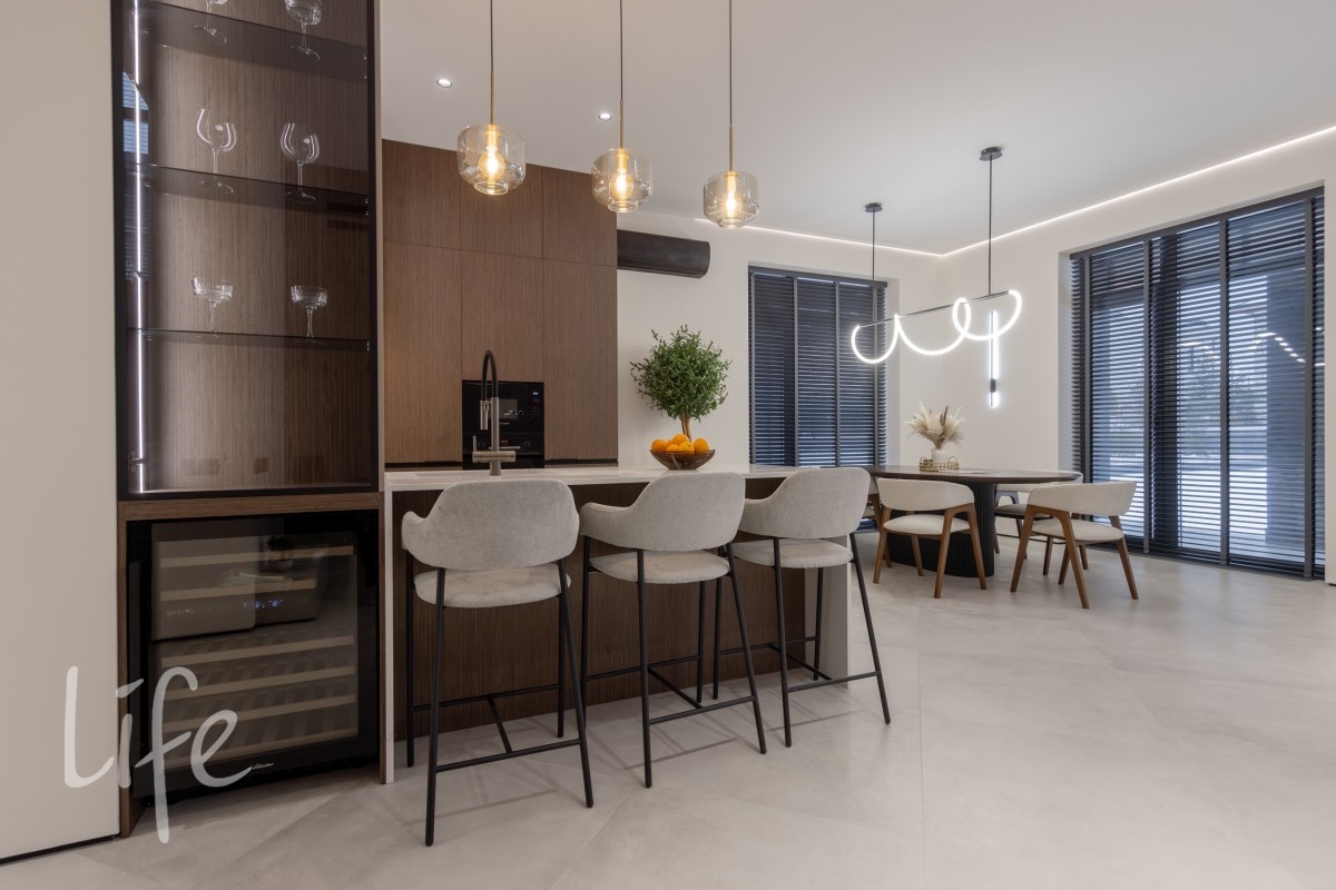 Интерьер дома выполнен в современном стиле в светлых пастельных тонах. В отделке использованы декоративные деревянные панели и керамогранит, а также модные осветительные приборы. Мебель и предметы интерьера подобраны со вкусом и соответствуют последним тенденциям. Дом полностью оснащён импортной бытовой техникой.