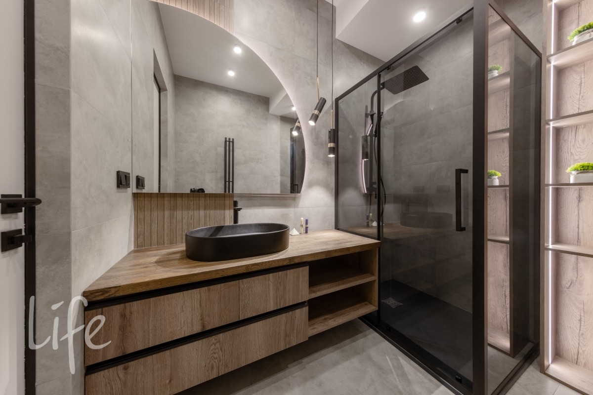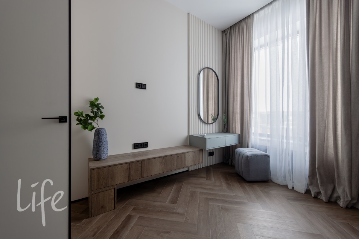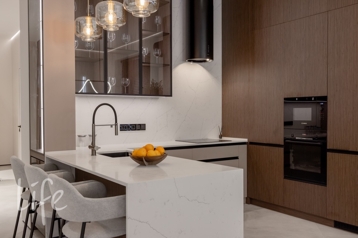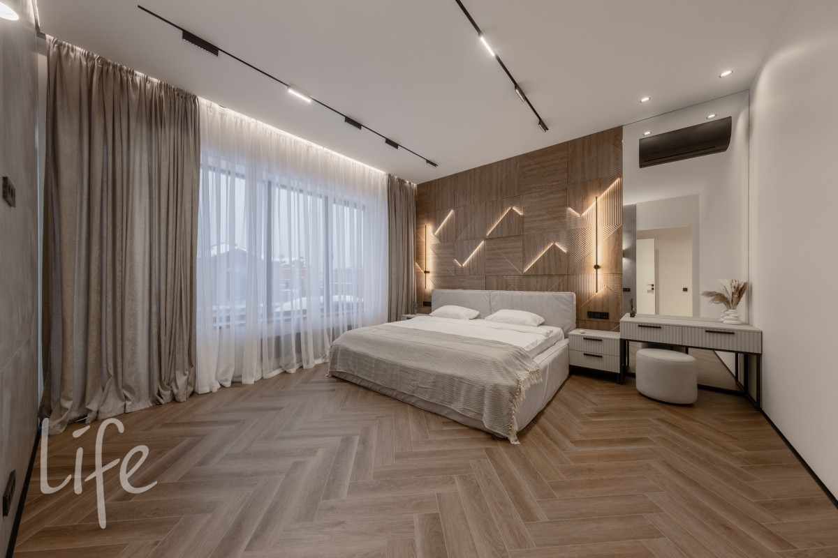 Интерьер дома выполнен в современном стиле в светлых пастельных тонах. В отделке использованы декоративные деревянные панели и керамогранит, а также модные осветительные приборы. Мебель и предметы интерьера подобраны со вкусом и соответствуют последним тенденциям. Дом полностью оснащён импортной бытовой техникой.