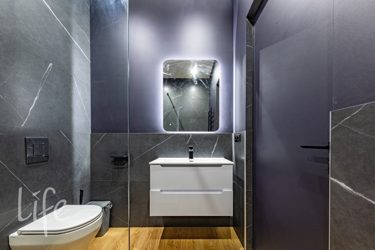 Современный стиль, качественные материалы отделки, высокие стандарты строительства: большие панорамные окна в пол, высокие потолки на обоих этажах (от 3.3 до 3.5 м), функциональная и удобная планировка.