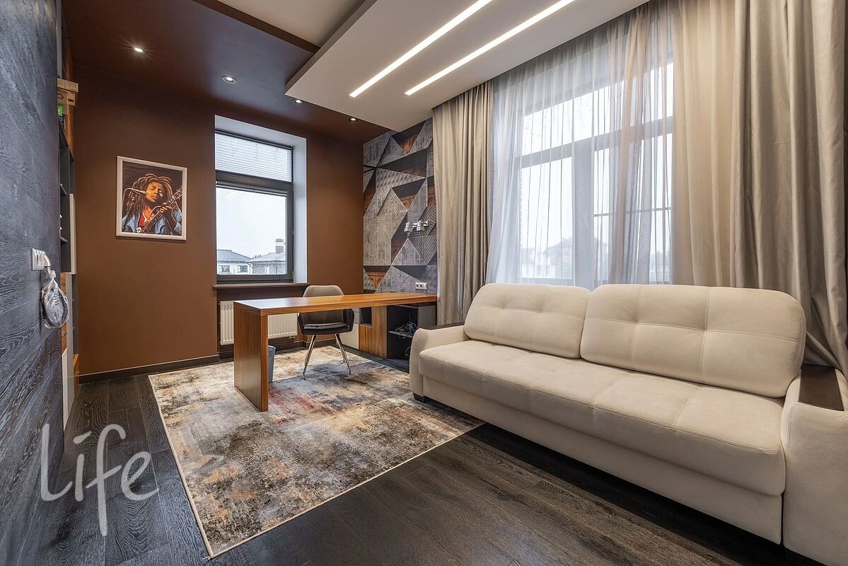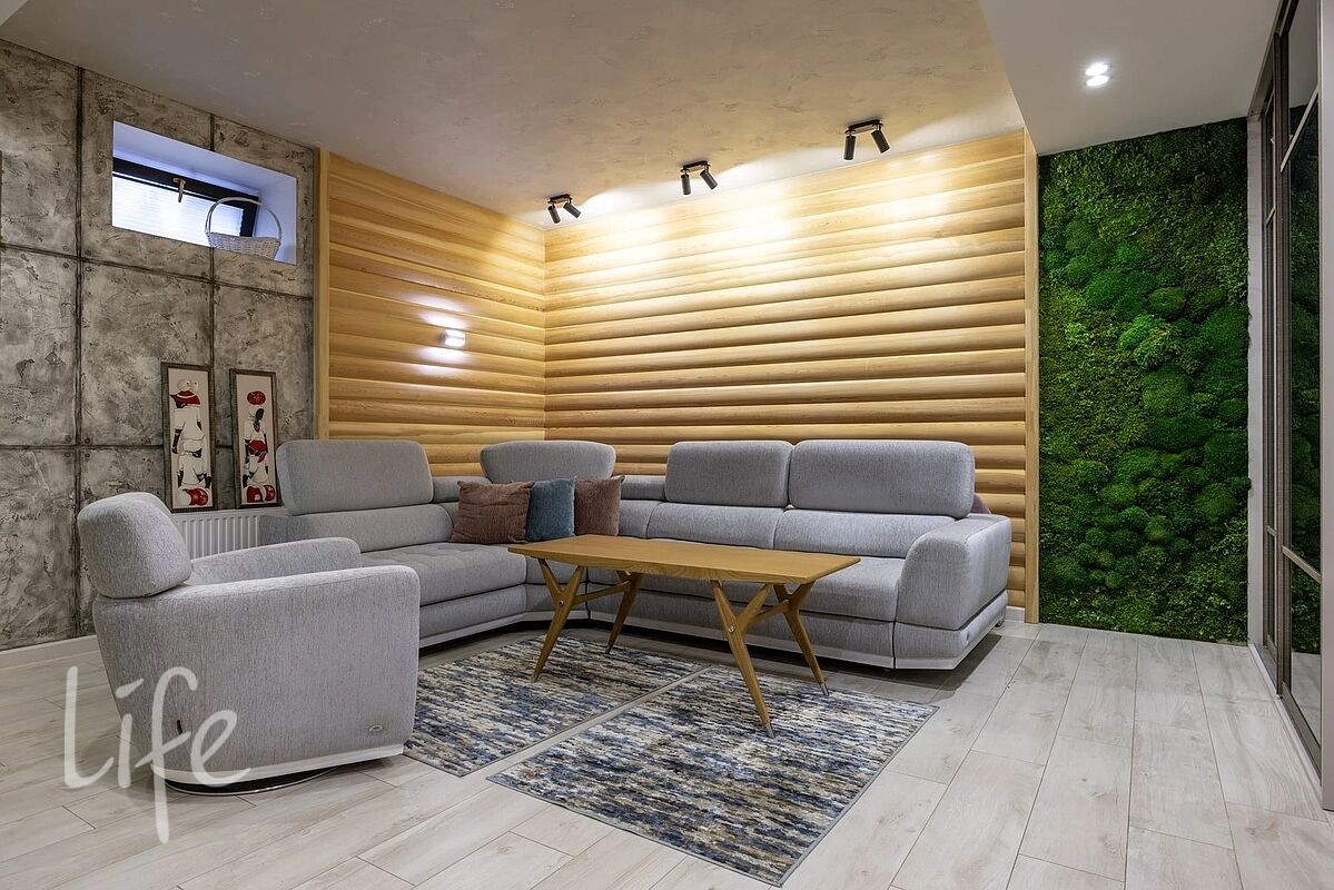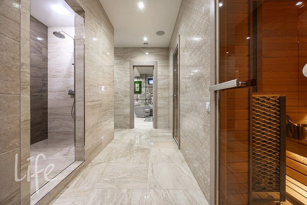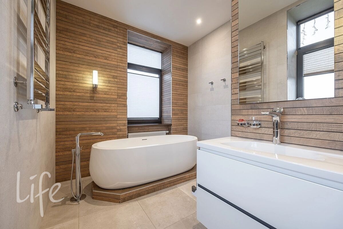 Интерьеры дома оформлены с использованием высококачественных и экологически чистых материалов от известных мировых брендов: испанской керамики Porcelanosa, немецкой сантехники Kludi и швейцарской Laufen, а также мебели от mbel&zeit. Для удобства жильцов предусмотрена встроенная техника от Liebherr и Miele.
