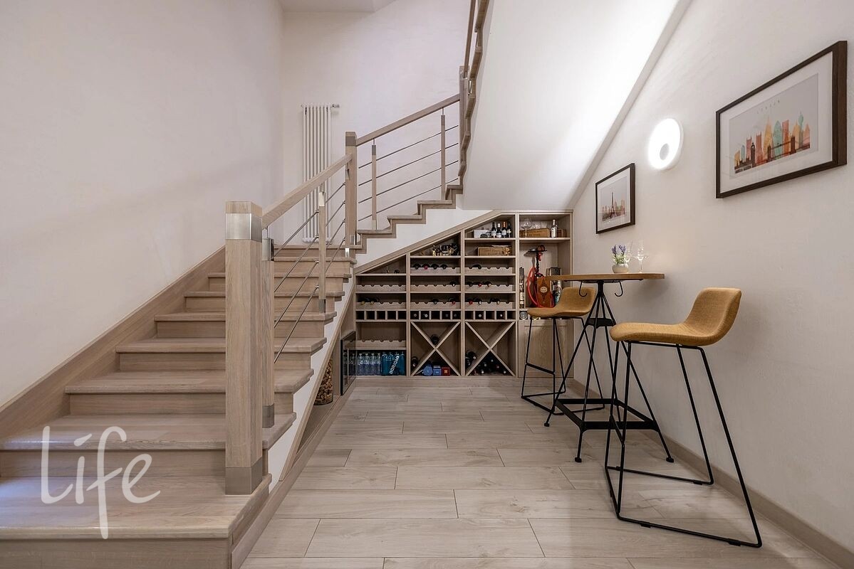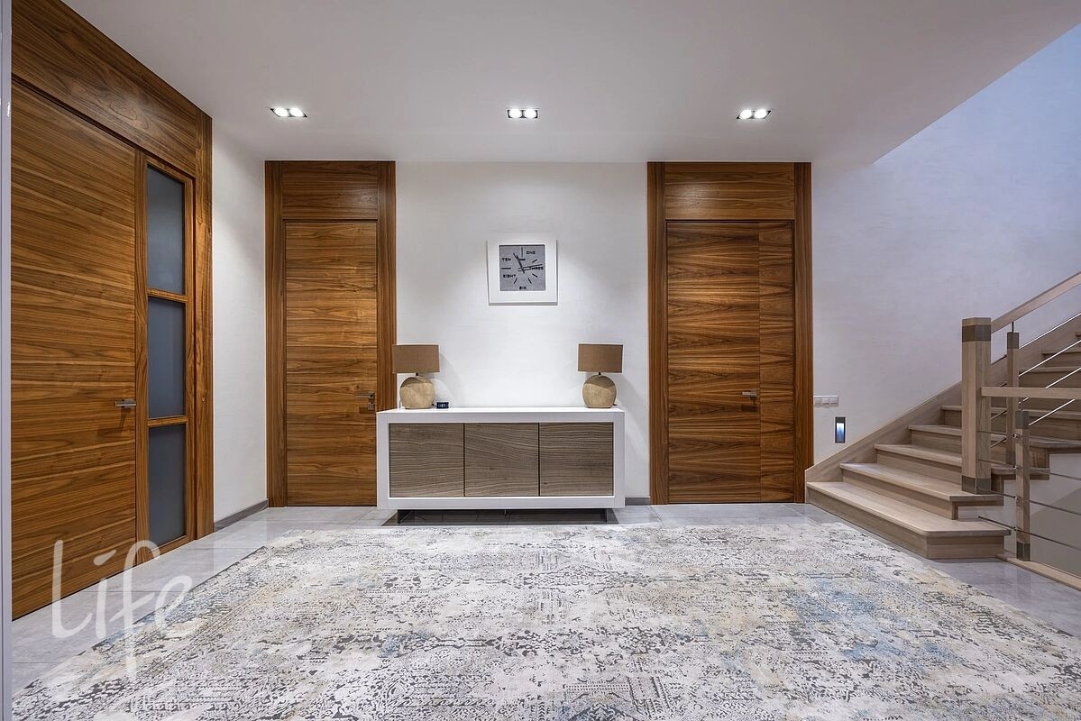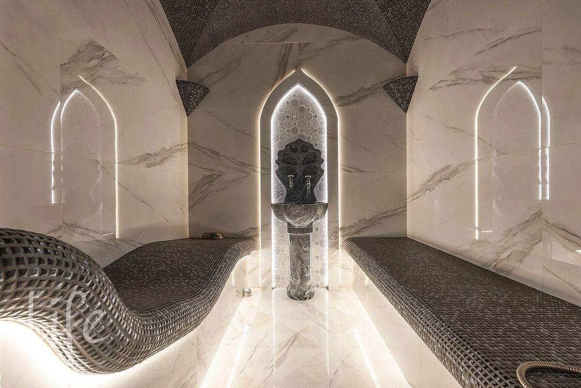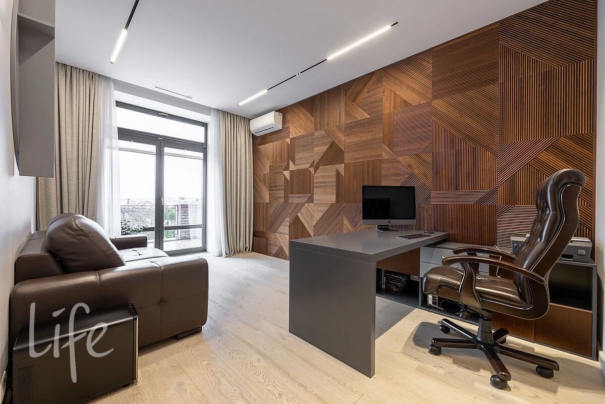 Интерьеры дома оформлены с использованием высококачественных и экологически чистых материалов от известных мировых брендов: испанской керамики Porcelanosa, немецкой сантехники Kludi и швейцарской Laufen, а также мебели от mbel&zeit. Для удобства жильцов предусмотрена встроенная техника от Liebherr и Miele.